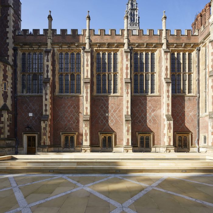 The refurbished building provides improved banqueting and dining facilities in the Great Hall and rejuvenated events spaces that improve the Inn’s commercial offering. The works bring the building up to modern standards with the introduction of underfloor heating, new production kitchens, drainage and waterproofing, and new energy-efficient mechanical systems. Within the hall, a new timber floor with underfloor heating has been installed to provide more effective thermal comfort for users, while replacing a failing 20th-century flooring and restoring the timber wainscoting that lines the room which had been damaged by the installation of radiators.
