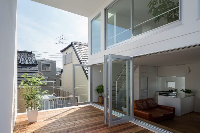 Little House Big Terrace is Located in the crowded suburbs of Tokyo, this 3-storey minimalist cube is as an approach to bring the outdoor spaces into the interior by a big terrace compared to the other spaces of the project for doing yoga under the sun, as requested by the client. Takuro Yamamoto designed the house with no windows facing the streets-which created a minimal white cube-a constant natural source of light is delivered to the different parts of the house through the open-air patio. The terrace is designed so that the clients do their outdoor activities on it.