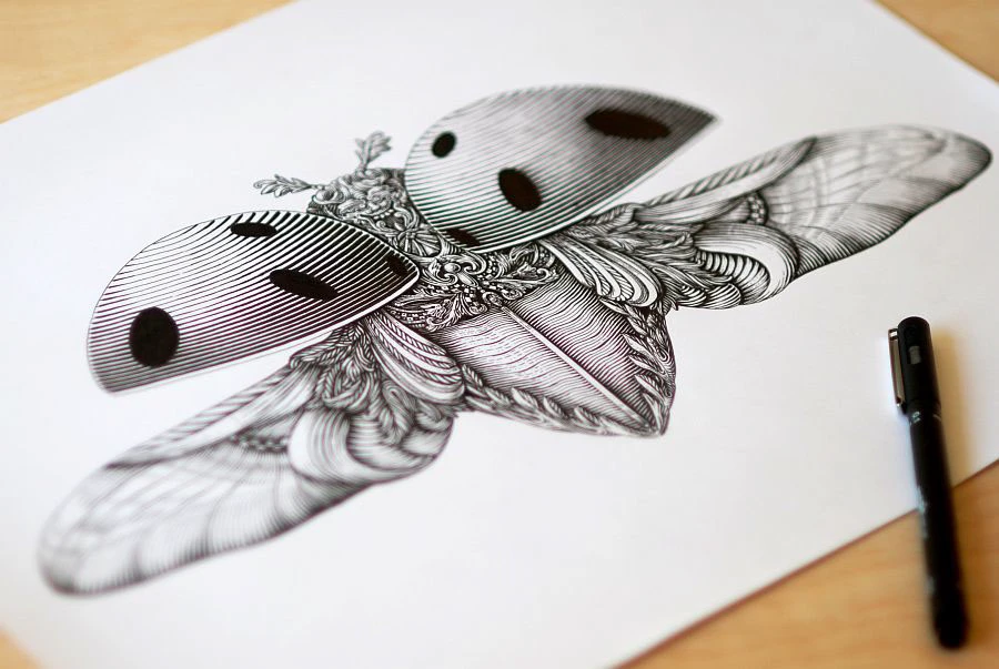 The eccentric illustrations made using pens and India ink are perfect in their symmetry, emphasizing the beautiful nature of insects while exploring the art of sophisticated grandeur.