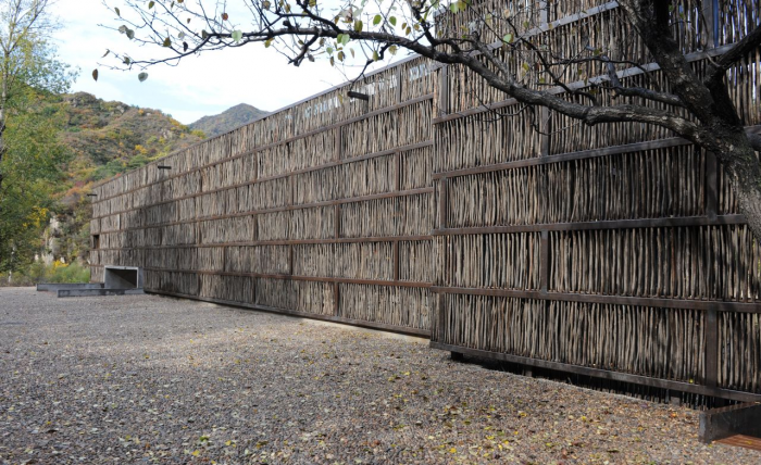 Li Xiaodong always favors simple forms, and there is no exception with this project. It is a 30m long, 4.35m wide and 6.3m high box with a total floor area of 170 m2.It has two partial floors and includes a library and a small storeroom. Steel is the primary structural material and tempered glass is the exterior cladding material of the building. All the facades of the building (including its roof) are enclosed by 45 thousand densely arranged wooden sticks of different lengths. The sticks were chosen because they are the most abundant natural resource in the area, used by local residents as cooking fuel and heating.