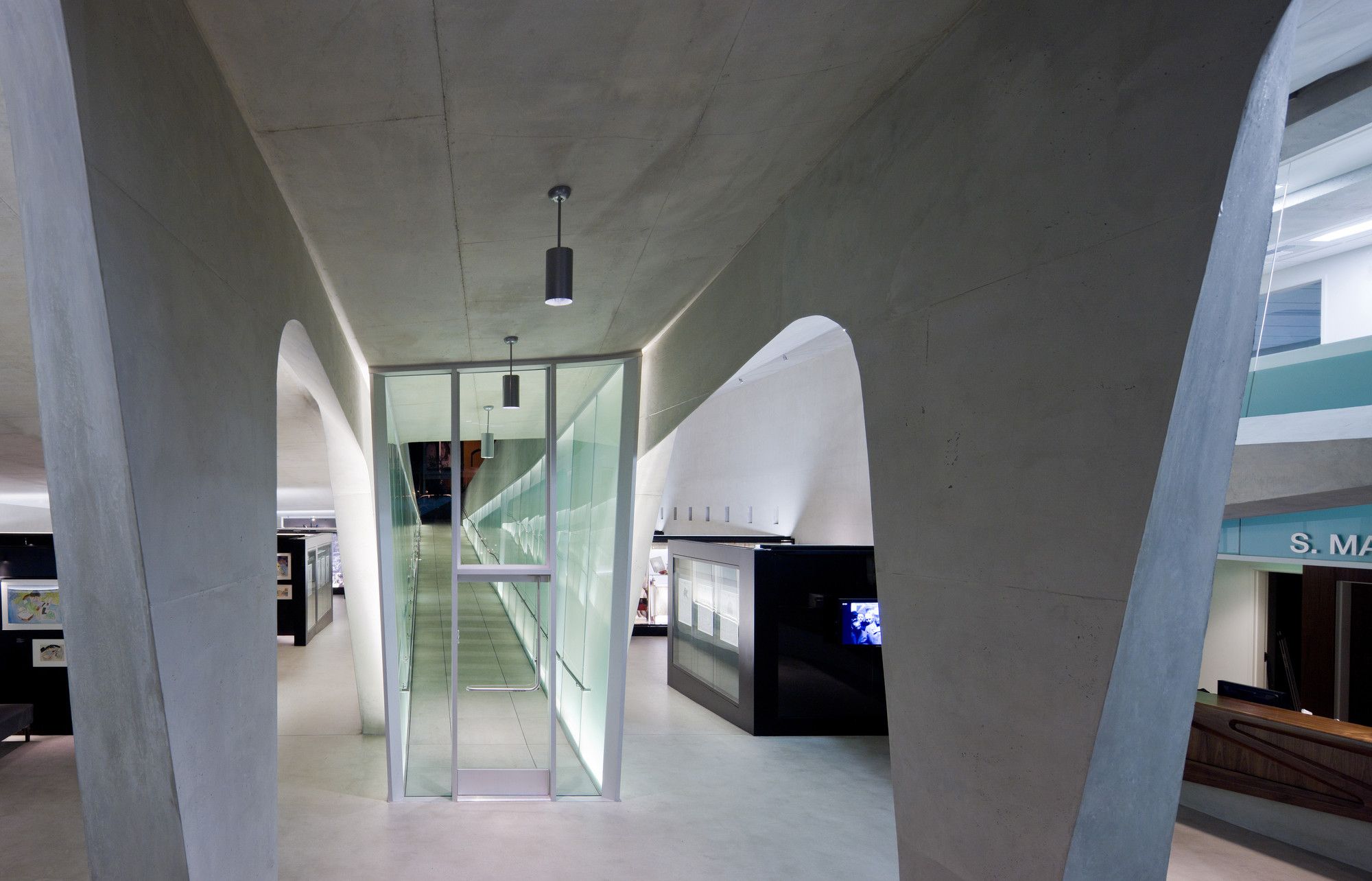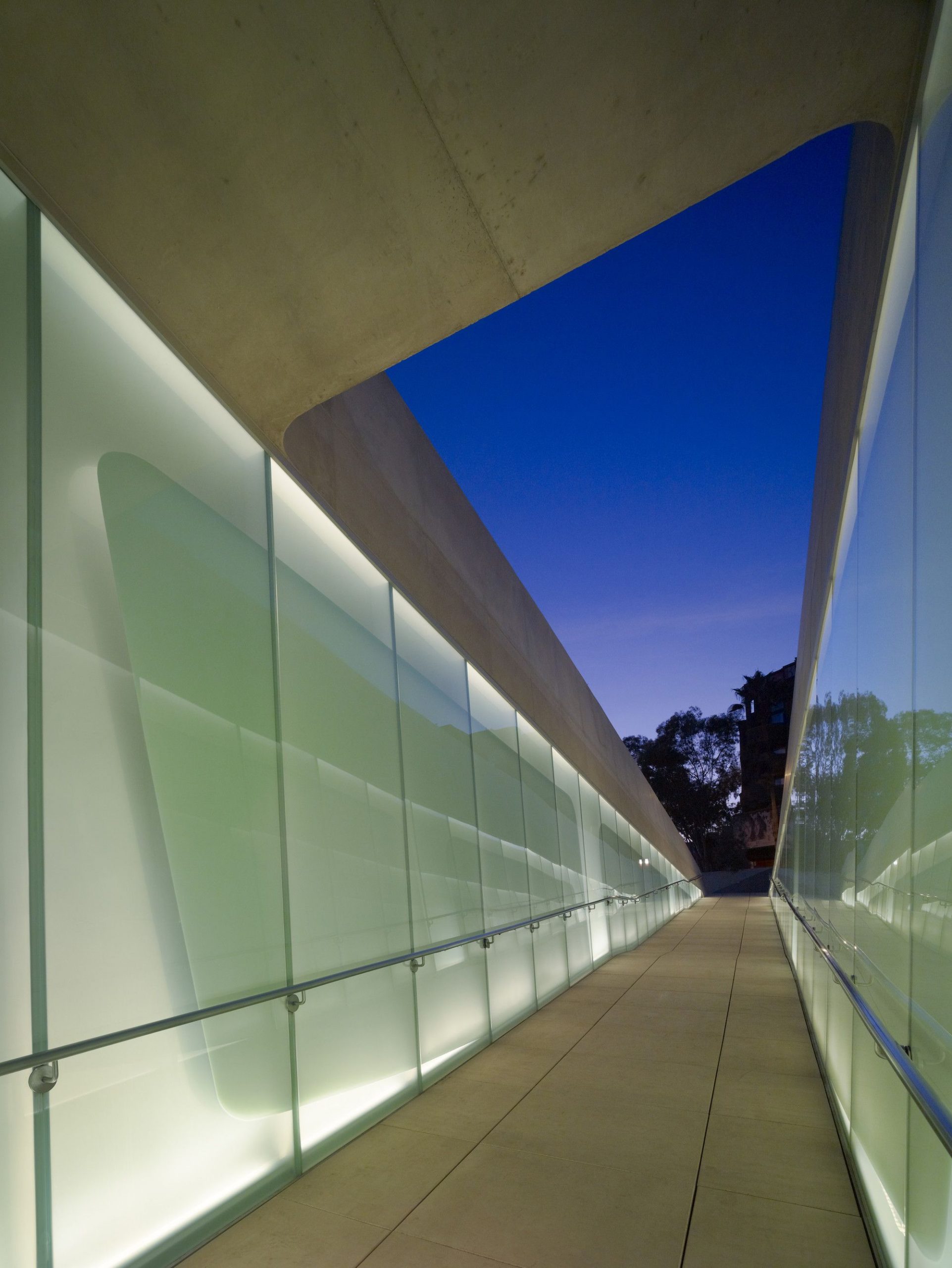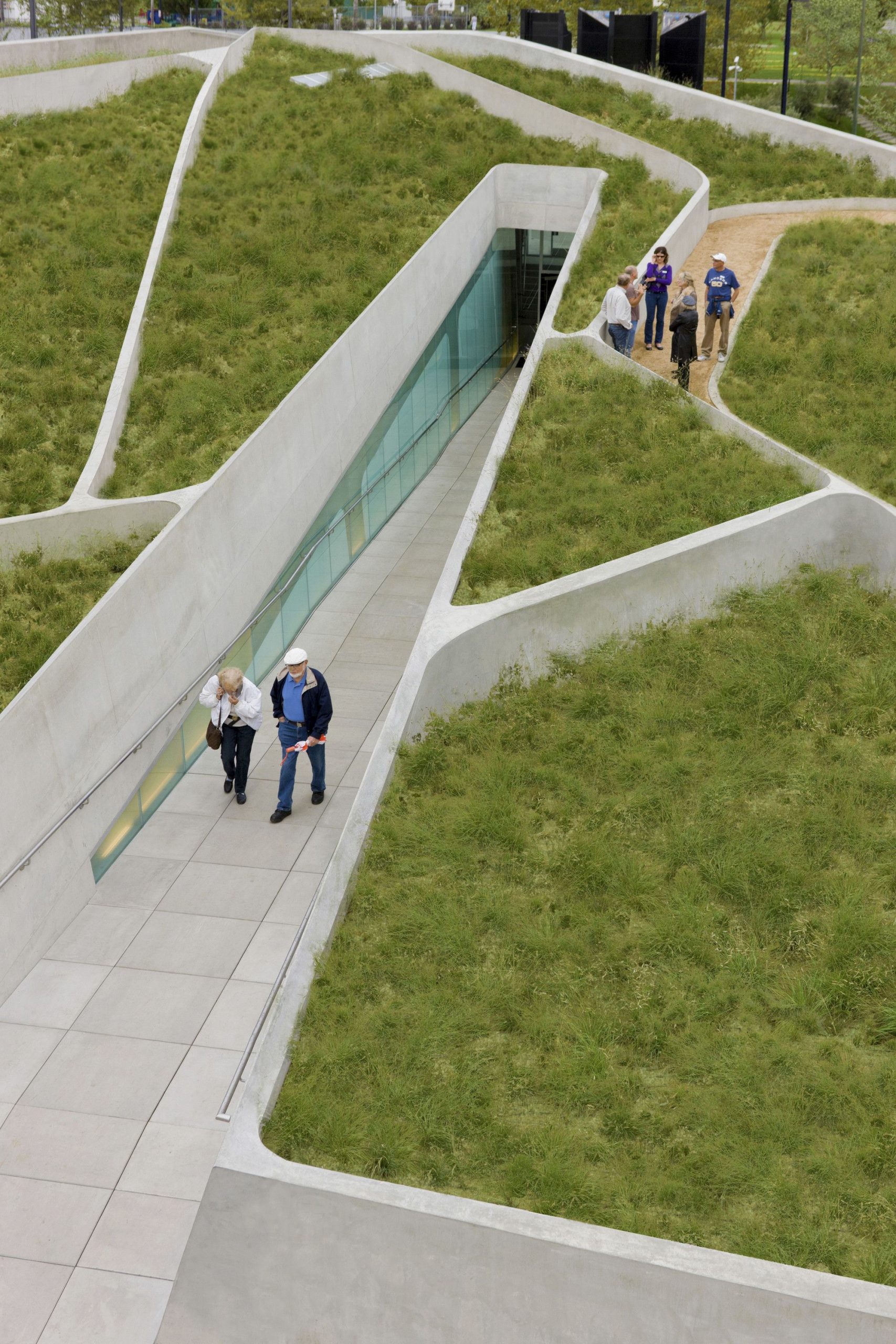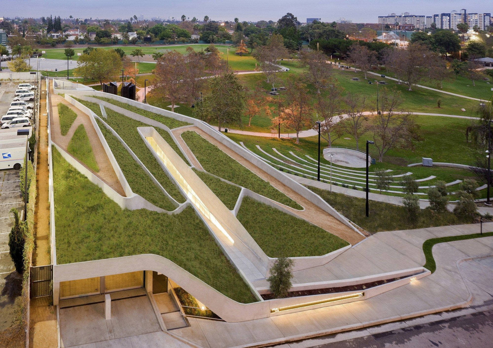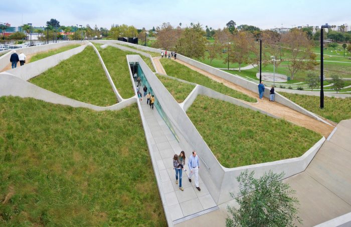 The patterning continues above the museum’s galleries, further connecting the park’s landscape and pedestrian paths. By maintaining the material pallet of the park and extending it onto the museum, the hues and textures of concrete and vegetation blend with the existing material palette of Pan Pacific Park. These simple moves create a distinctive façade for the museum while maintaining the parks topography and landscape. The museum emerges from the landscape as a single, curving concrete wall that splits and carves into the ground to form the entry. Designed and constructed with sustainable systems and materials, the LAMOTH building is on track to receive a LEED Gold Certification from the US Green Building Council.