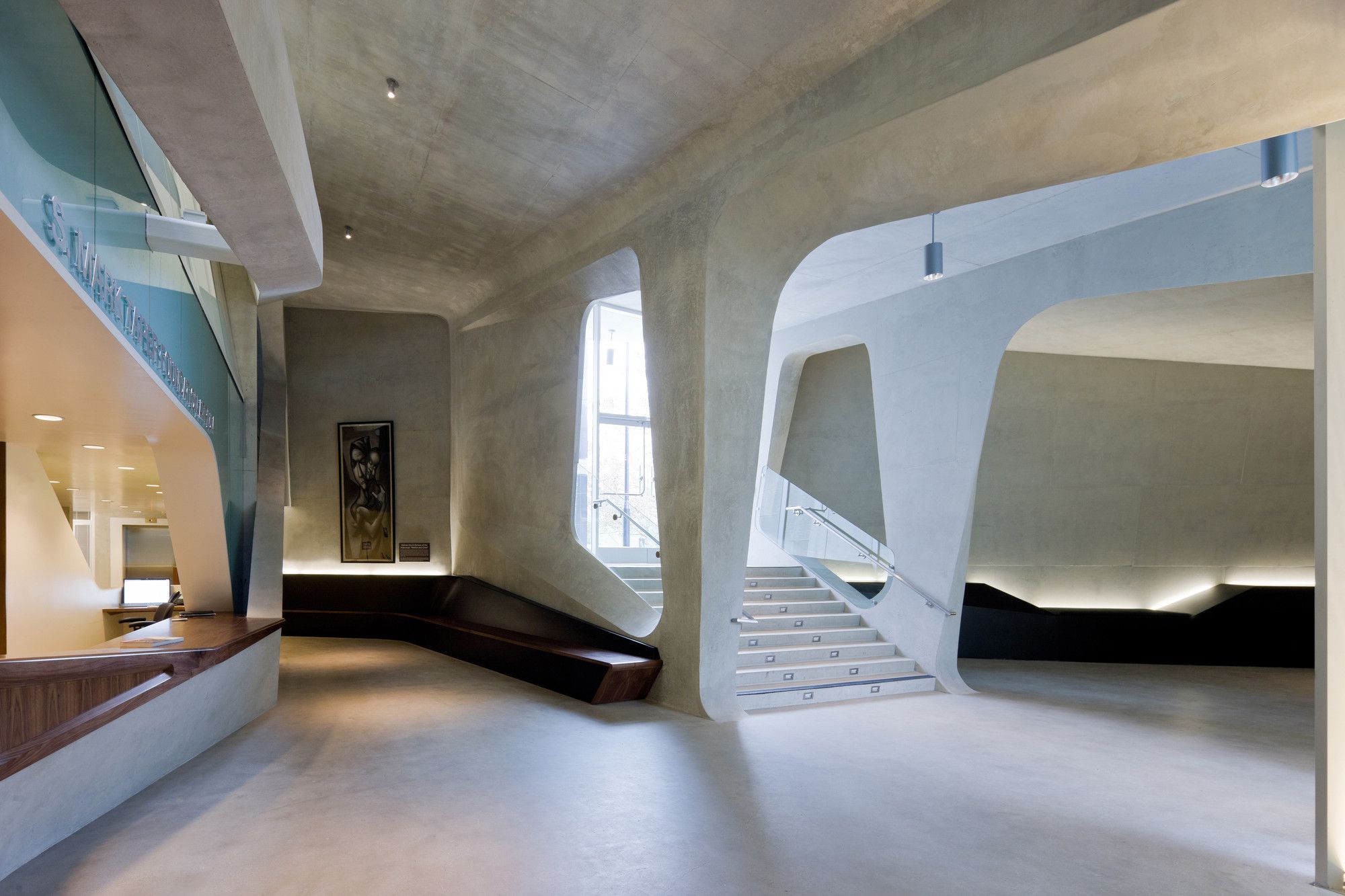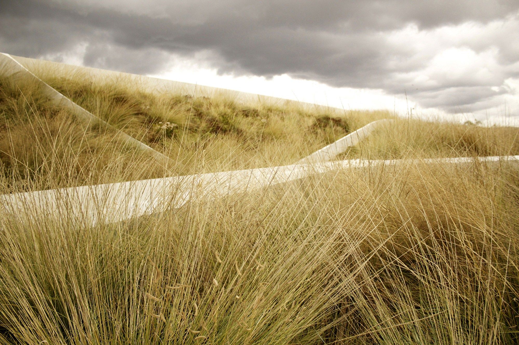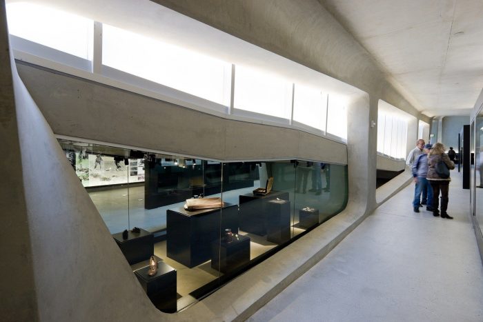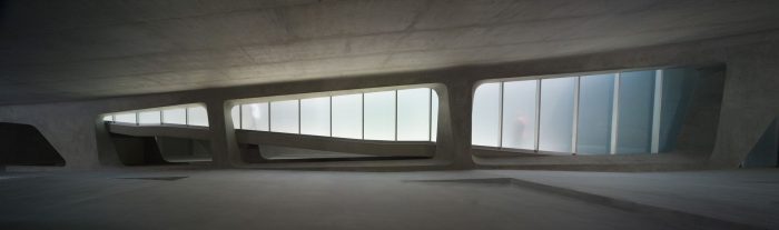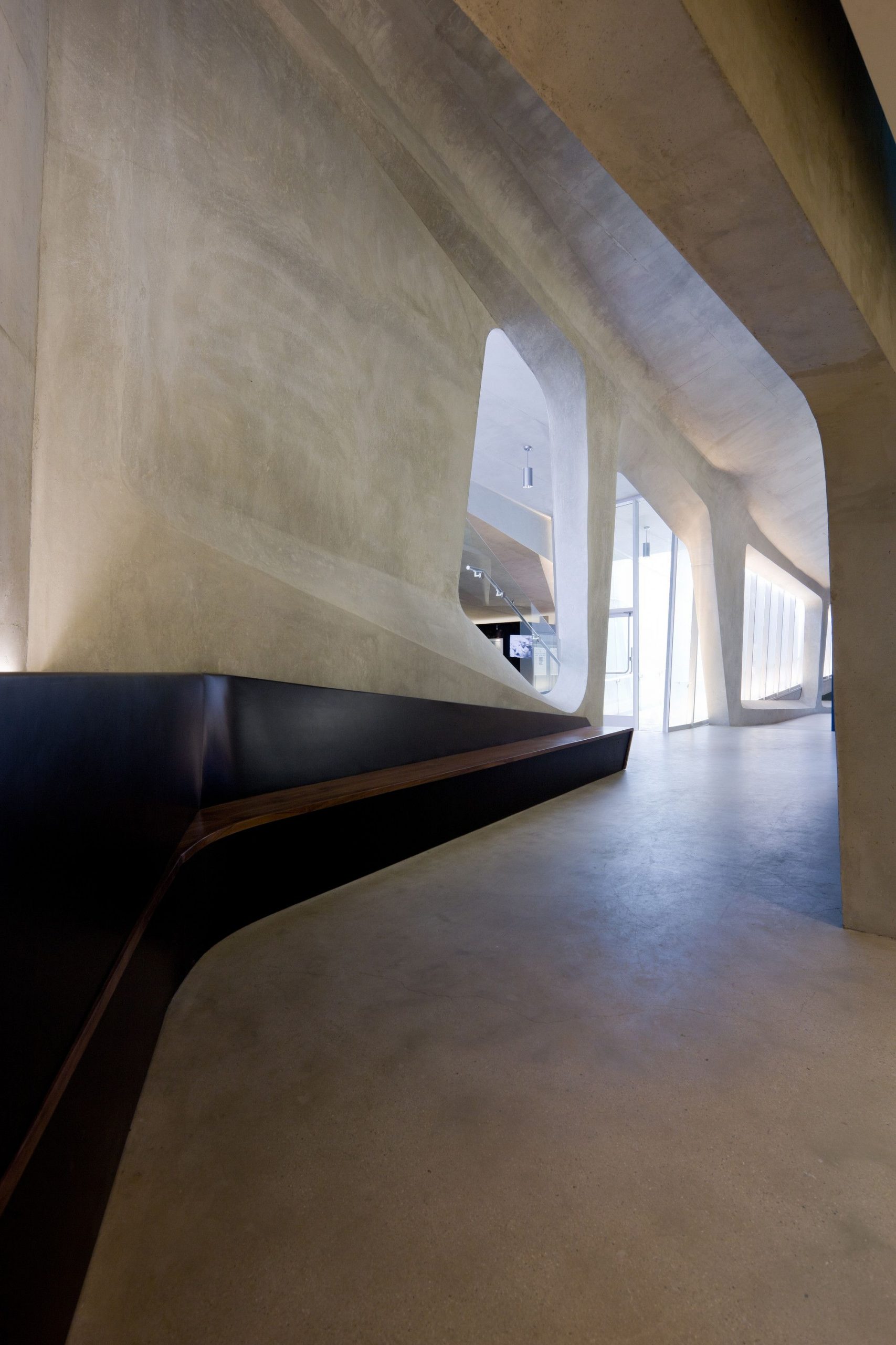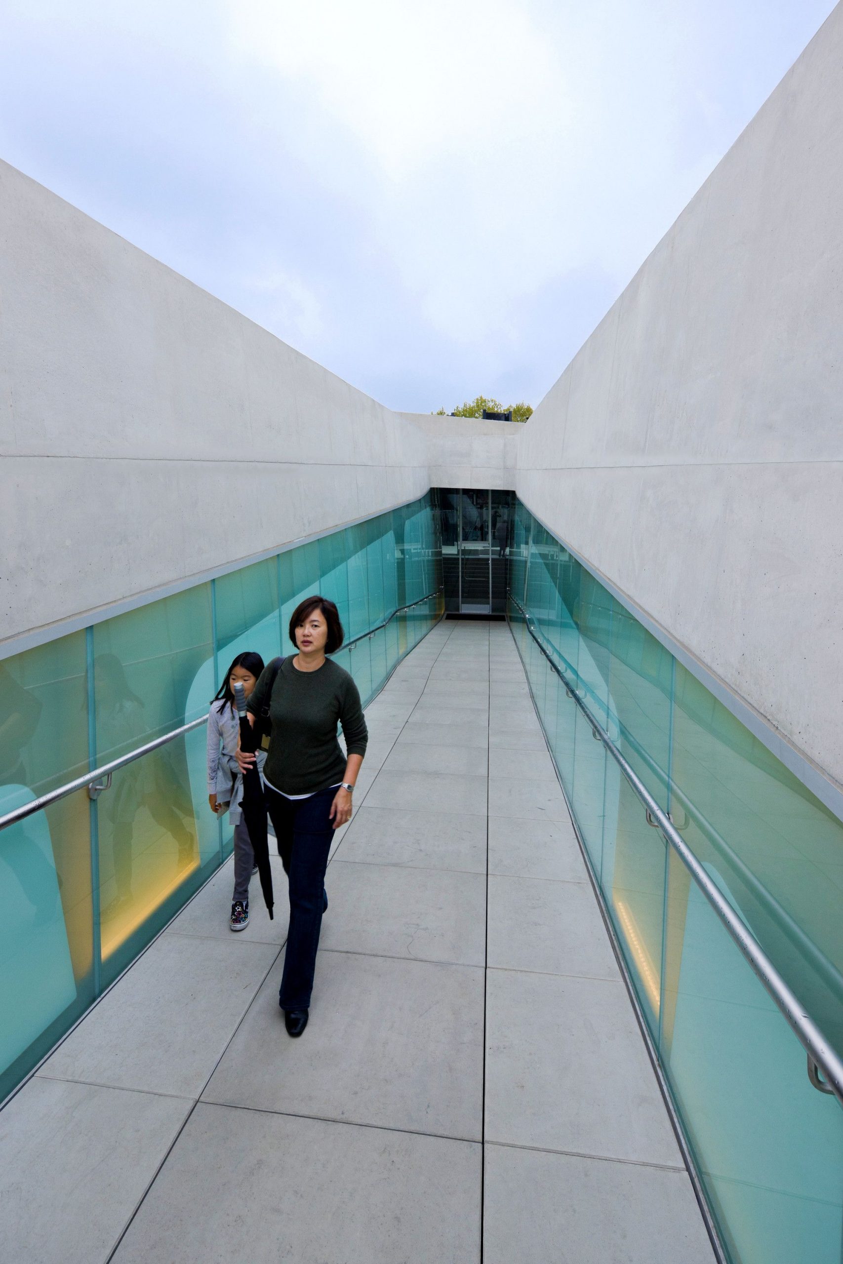The patterning continues above the museum’s galleries, further connecting the park’s landscape and pedestrian paths. By maintaining the material pallet of the park and extending it onto the museum, the hues and textures of concrete and vegetation blend with the existing material palette of Pan Pacific Park. These simple moves create a distinctive façade for the museum while maintaining the parks topography and landscape. The museum emerges from the landscape as a single, curving concrete wall that splits and carves into the ground to form the entry. Designed and constructed with sustainable systems and materials, the LAMOTH building is on track to receive a LEED Gold Certification from the US Green Building Council.