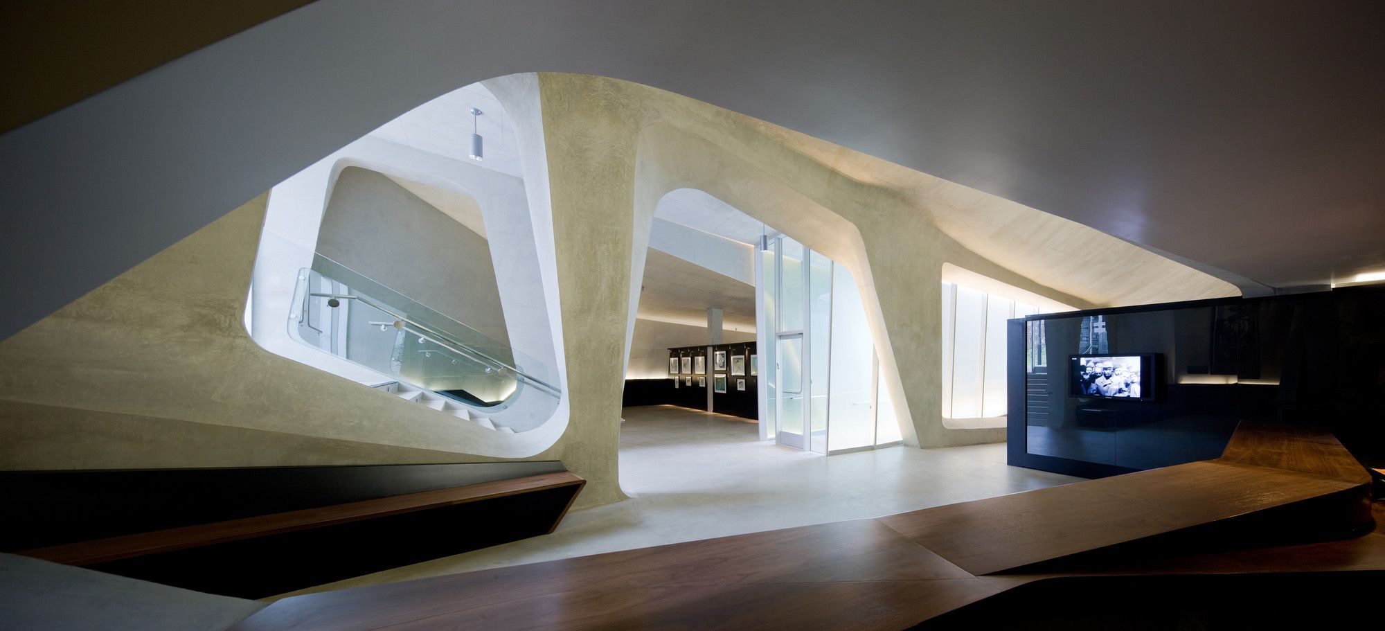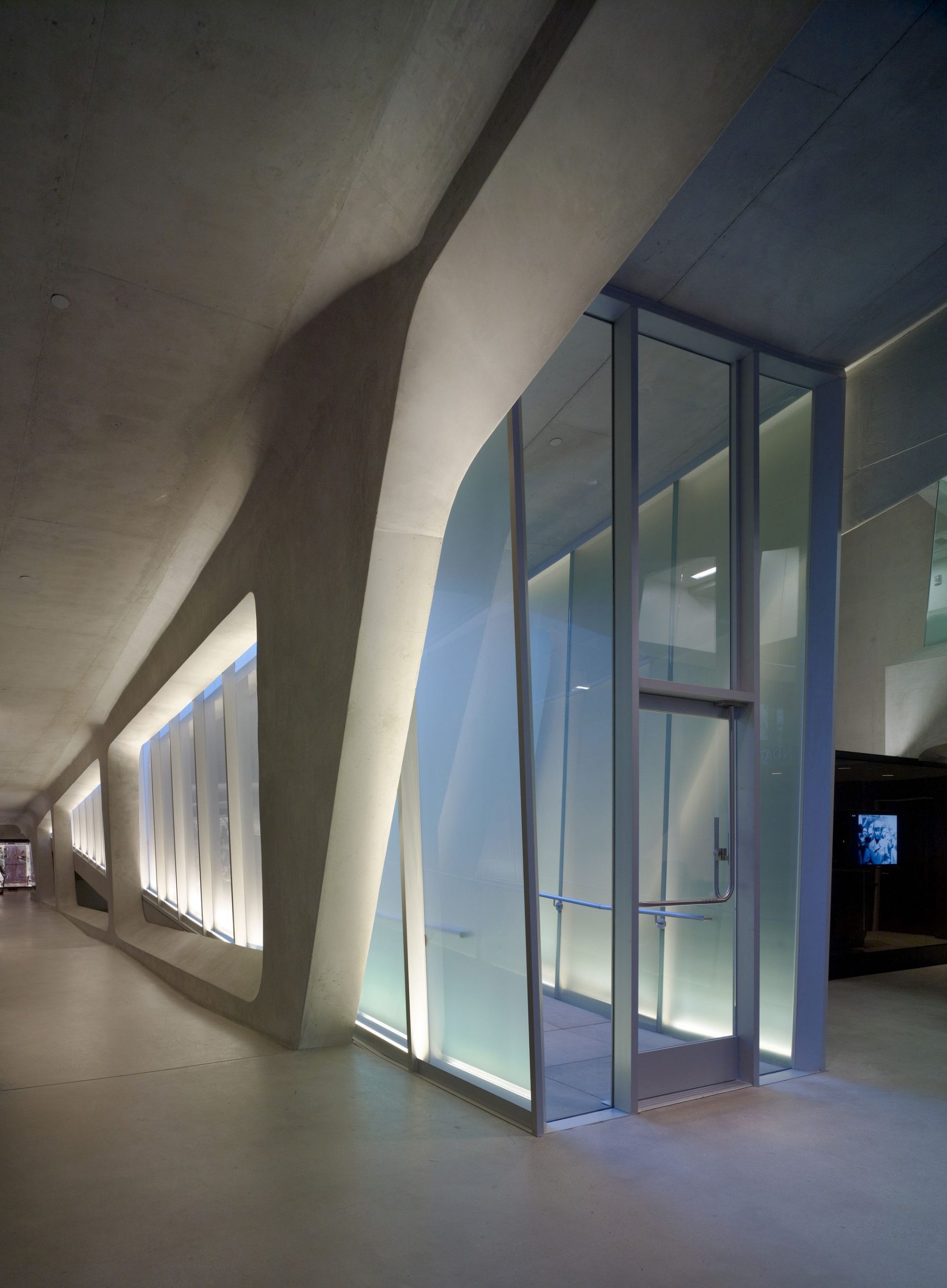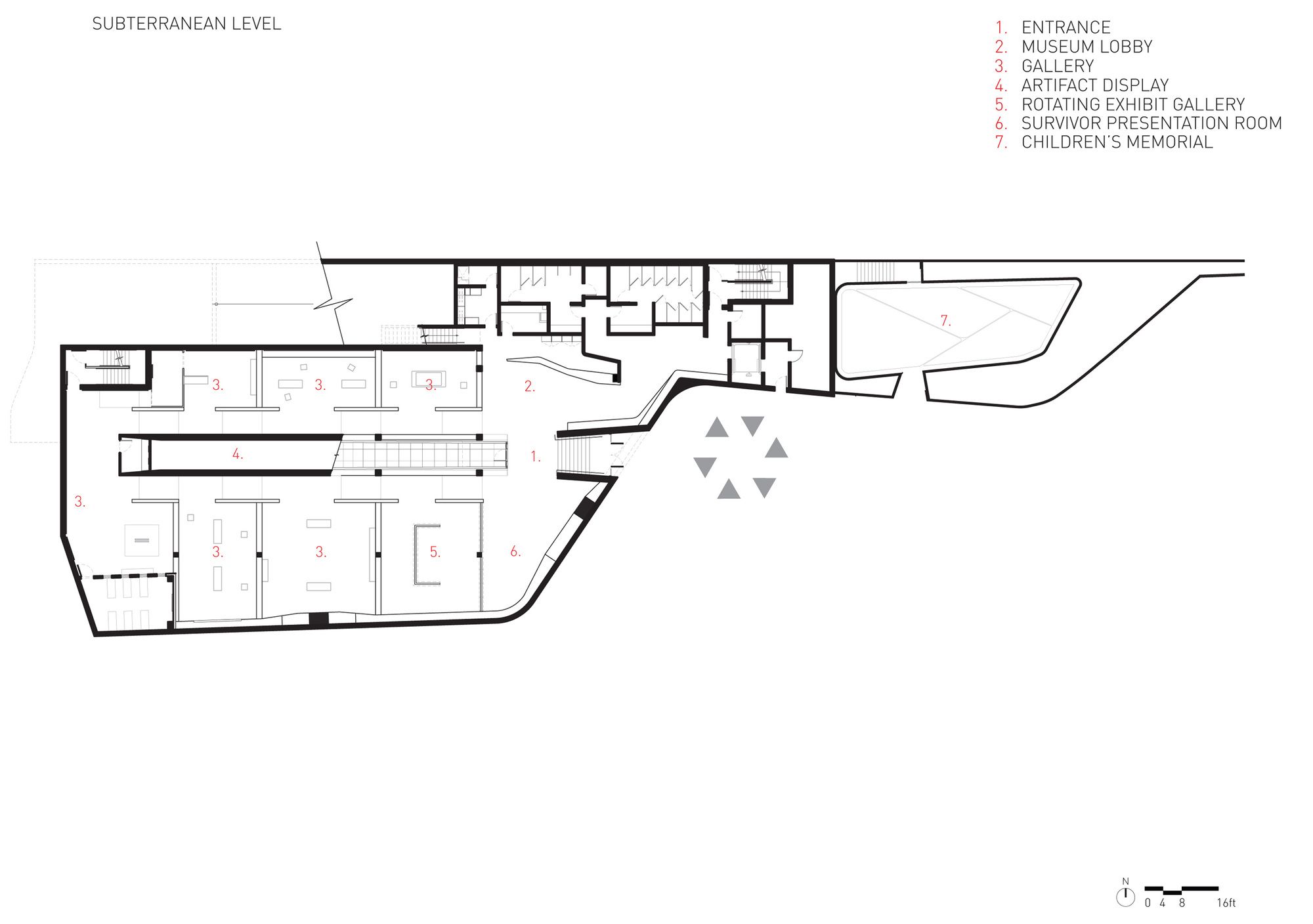 The ceiling is low, and the room is almost entirely illuminated by individual video-monitors—about the size of a notebook—which limits viewing to a single spectator. The visitor is now confined to the most isolated, darkest and volumetrically concentrated underground area in the museum. The journey from this point forward is one of ascension and of finding the comfort of familiar space as floor levels begin to rise and natural lights begins to penetrate the interior once again. The final ascent up to the existing monument is filled with sights and sounds of unrestricted park land.