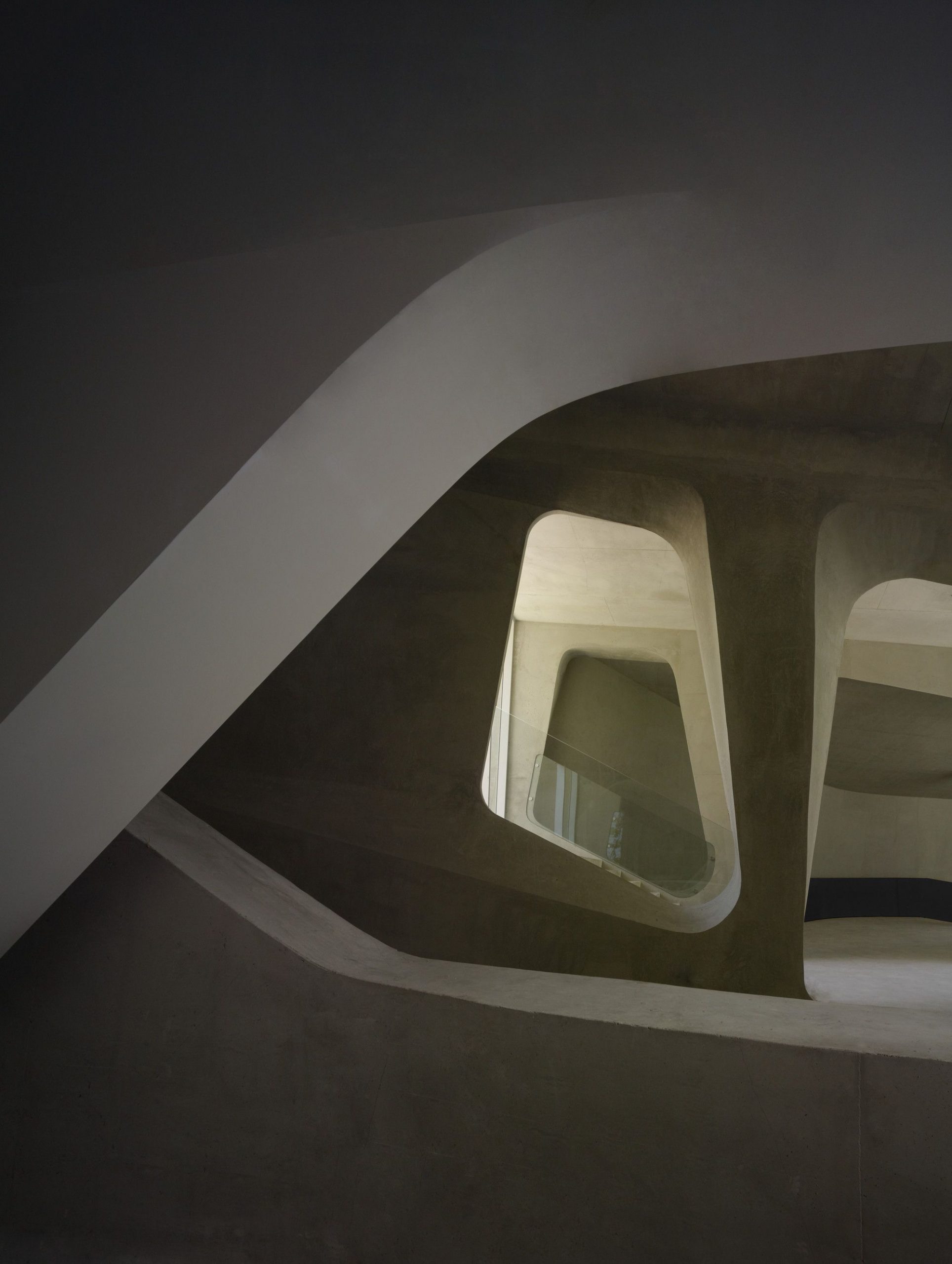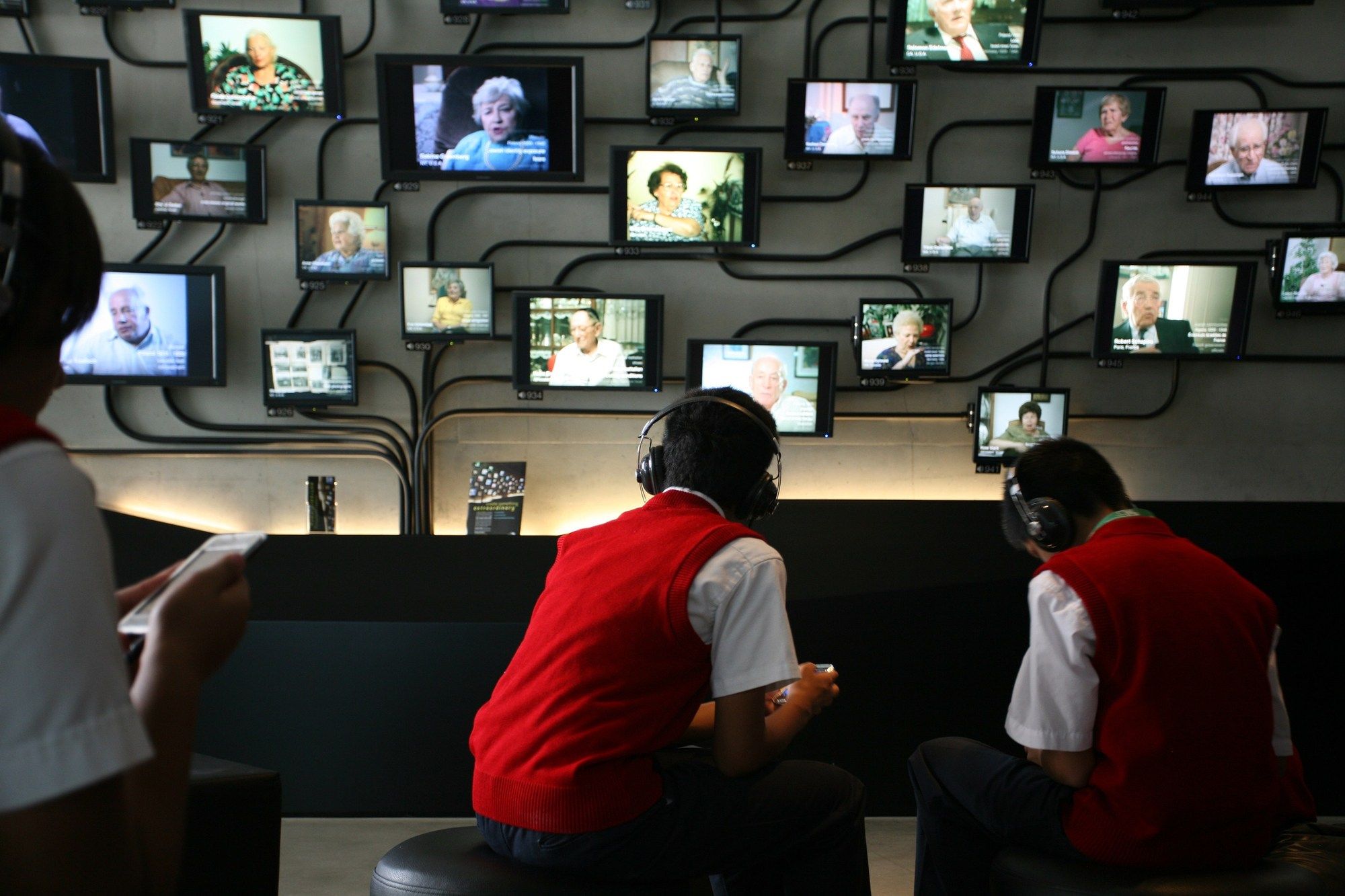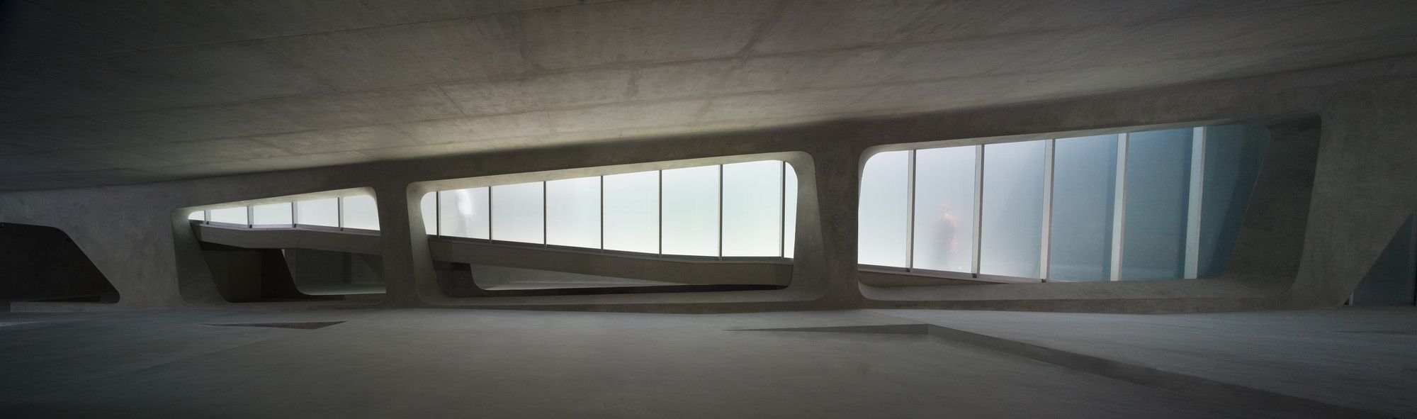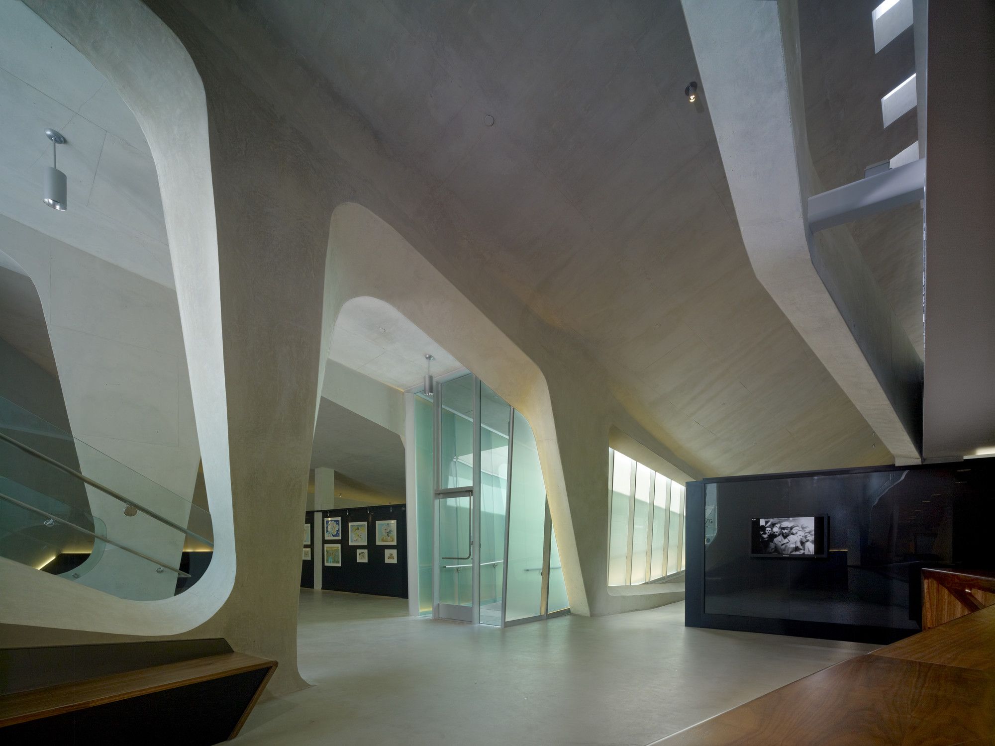 The ceiling is low, and the room is almost entirely illuminated by individual video-monitors—about the size of a notebook—which limits viewing to a single spectator. The visitor is now confined to the most isolated, darkest and volumetrically concentrated underground area in the museum. The journey from this point forward is one of ascension and of finding the comfort of familiar space as floor levels begin to rise and natural lights begins to penetrate the interior once again. The final ascent up to the existing monument is filled with sights and sounds of unrestricted park land.