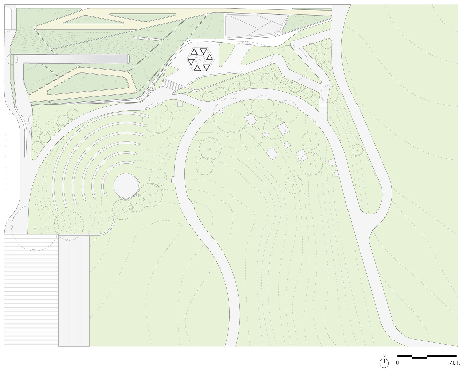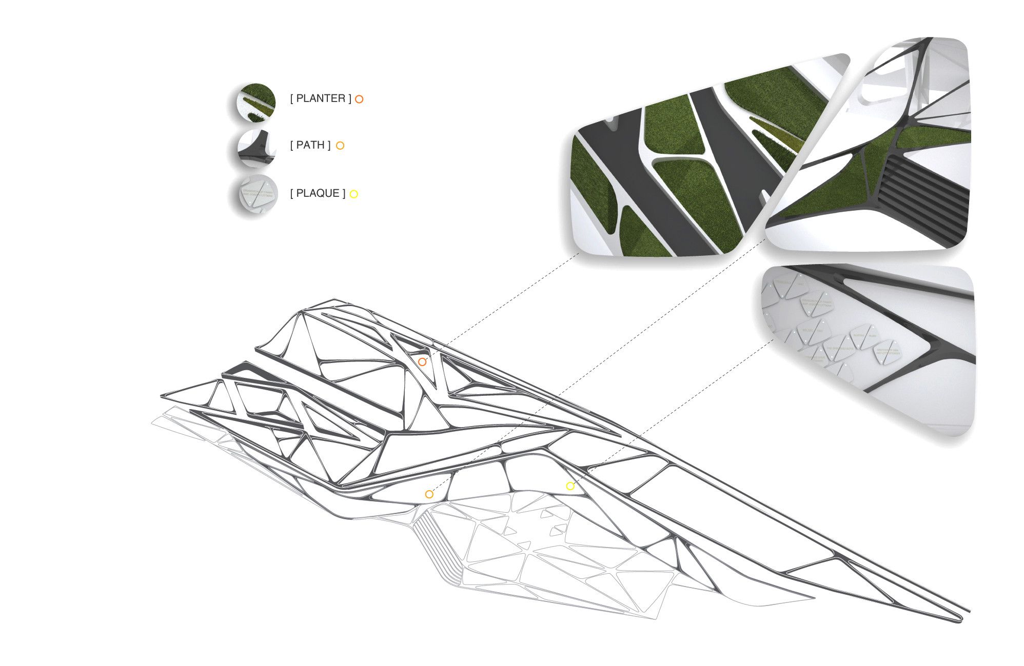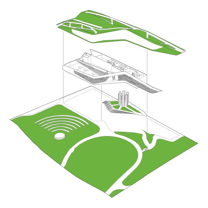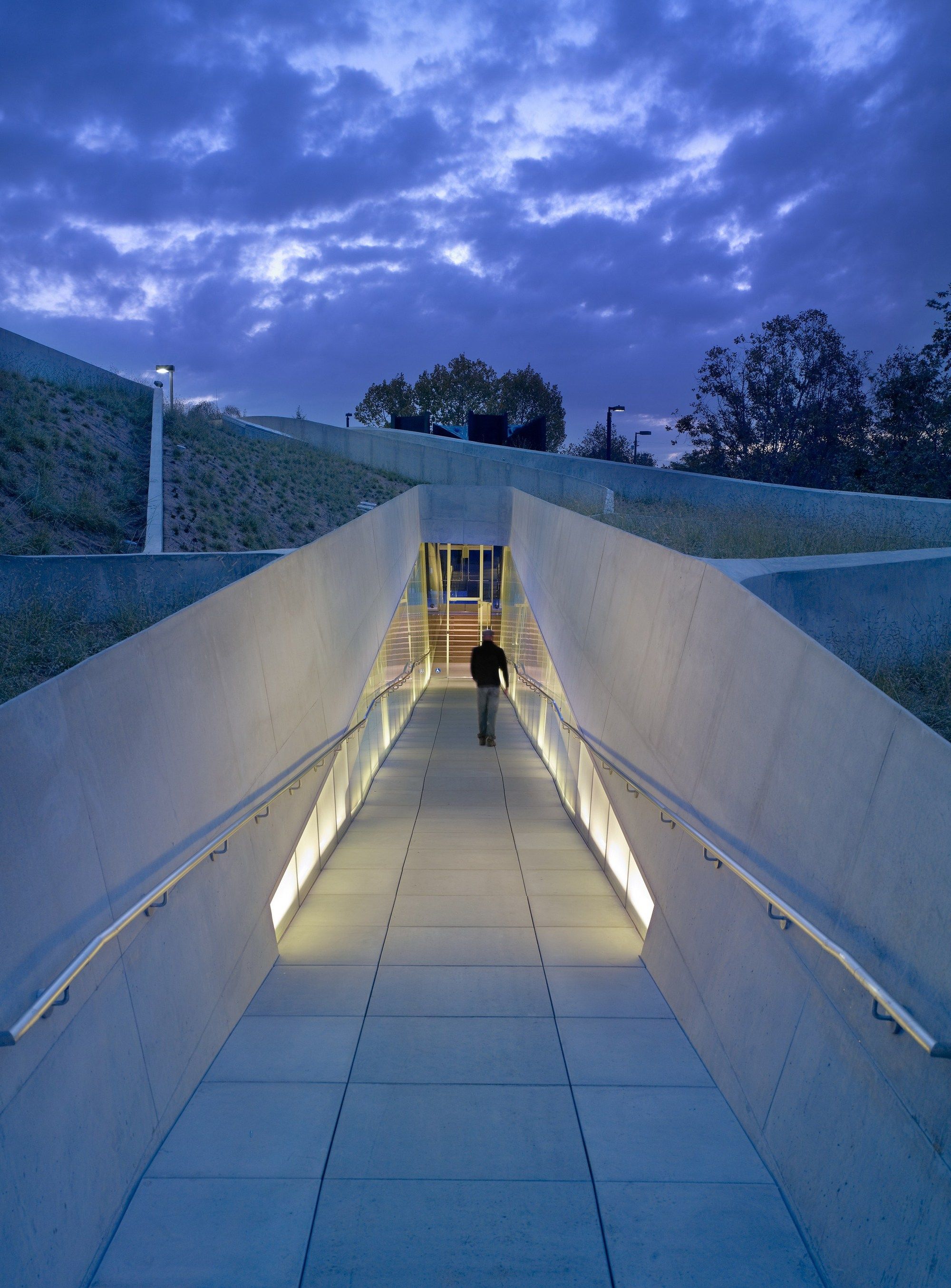 The new building for the Los Angeles Museum of the Holocaust (LAMOTH) is located within a public park, adjacent to the existing Los Angeles Holocaust Memorial. Paramount to the design strategy is the integration of the building into the surrounding open, park landscape. The museum is submerged into the ground allowing the park’s landscape to continue over the roof of the structure. Existing park pathways are used as connective elements to integrate the pedestrian flow of the park with the new circulation for museum visitors. The pathways are morphed onto the building and appropriated as surface patterning.