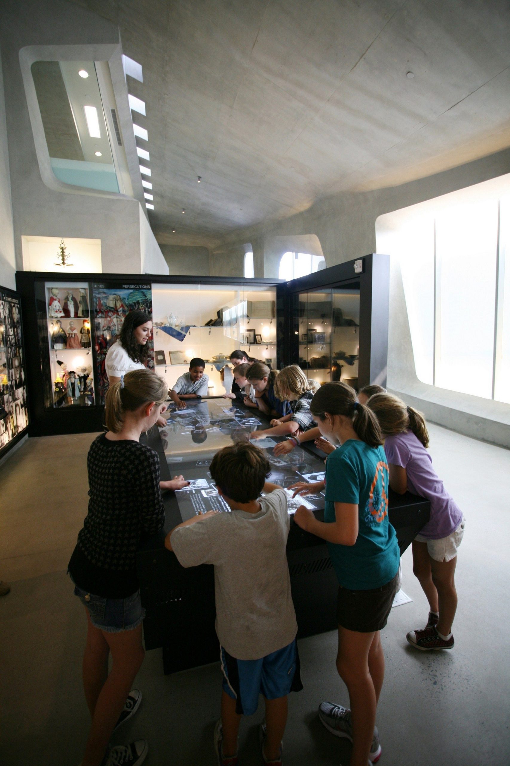 The first room incorporates a large, single interactive table, mimicking a conceptual “community” or dinner table. The exhibit brings a large group of patrons together around one interactive exhibit. The lighting of the interior galleries dim as the visitor steps down into the subsequent rooms where two separate exhibits display divide the singular crowd—diminishing the “community” provided by people nearby. Through the third room and into the fourth, the floor continues to step down as ambient lighting becomes scarcer leading individuals to the room titled, “Concentration Camps.”