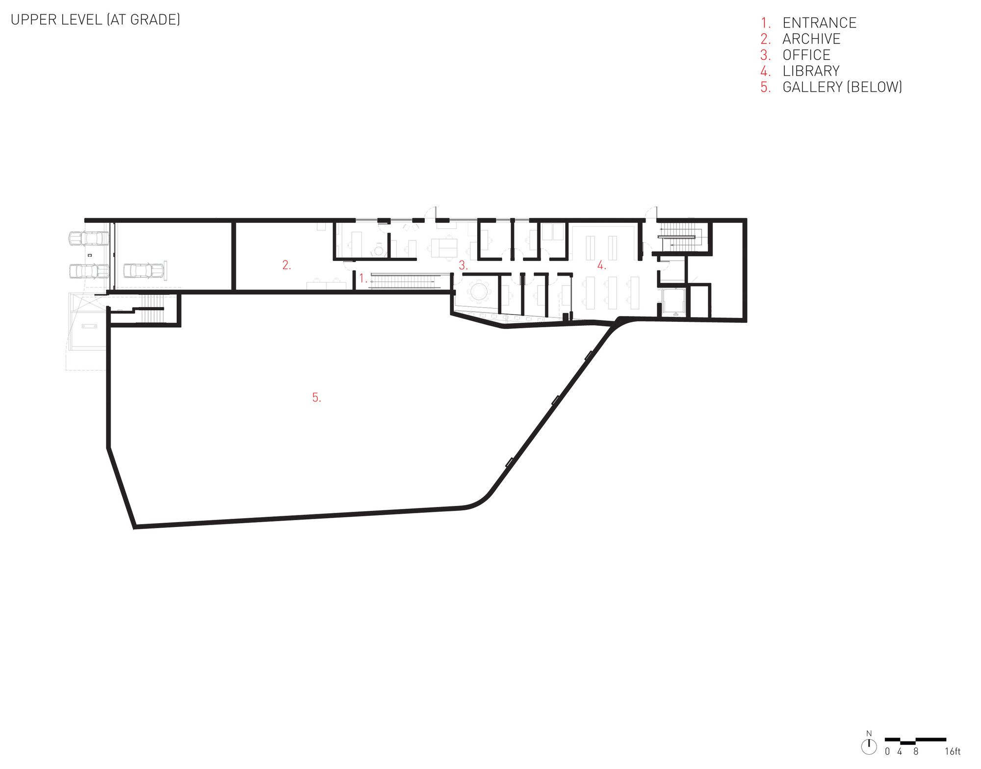 Patrons begin their procession at the drop off adjacent to the park. Their approach is pervaded by sounds and sights of laughter and sport—of kids playing in the park and picnicking with their families. Because the building is partially submerged beneath the grassy, park landscape, entry to the building entails a gradual deterioration of this visual and auditory connection to the park while descending a long ramp. Upon entering, visitors experience the culmination of their transition from a playful and unrestrained, public park atmosphere to a series of isolated spaces saturated with photographic archival imagery.