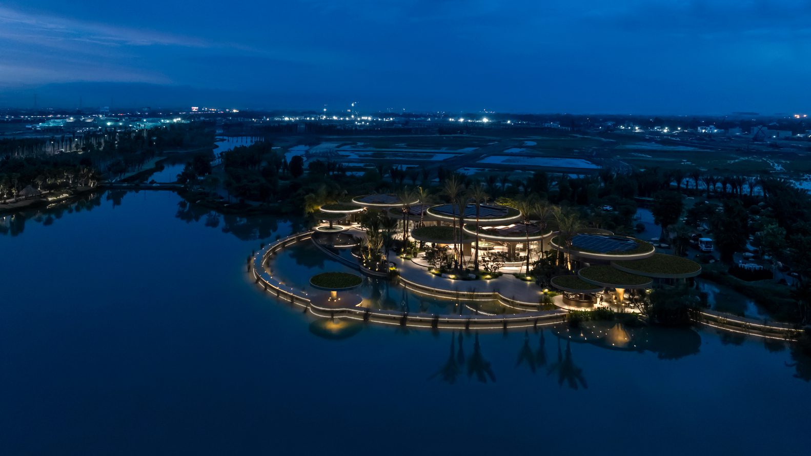 Guided by this approach, the clubhouse is composed of multiple small volumes distributed beneath the forest canopy across a usable area of approximately 2,000 square meters. Each functional block is positioned at different elevations and connected through curving pathways and reflective water surfaces, creating a spatial journey that shifts between openness and enclosure, brightness and shade. Active spaces, such as the restaurant and children’s play area, open toward the lake, while quieter functions, including the spa, lounge, and meditation areas, are embedded deeper within shaded greenery. From a distance, the dispersed layout allows the building to visually recede into the landscape, minimizing its presence while enriching the sensory experience through light, wind, and water.