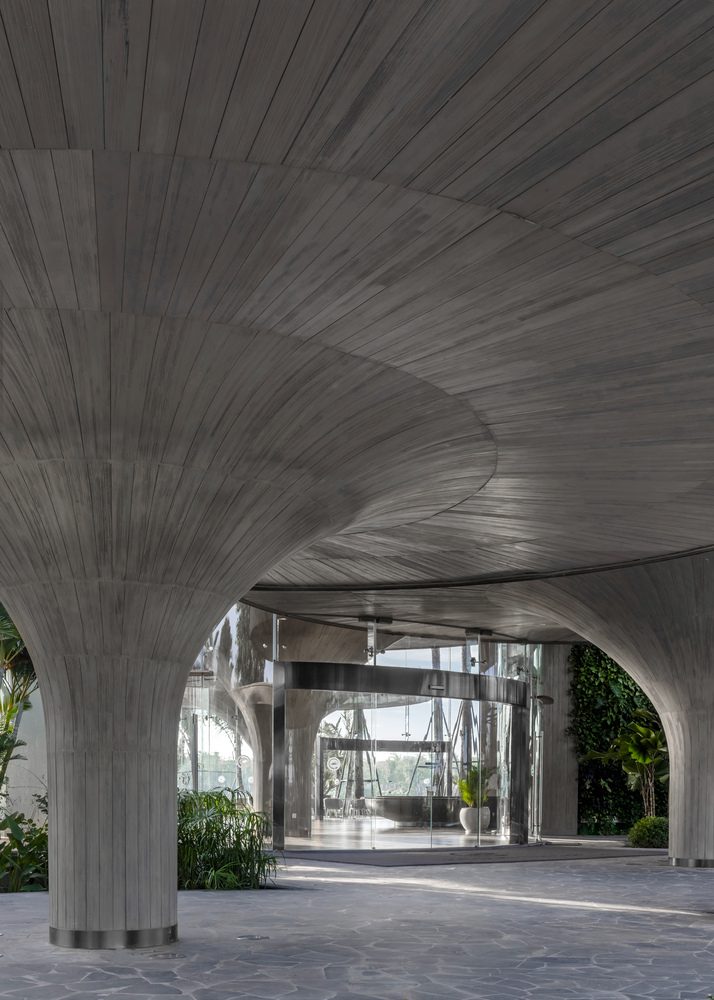 Roof heights rise gradually toward the center, where larger modules are positioned, while smaller, lower roofs extend outward. Each roof module functions like a water-collecting funnel, gently guiding rainwater back into the landscape while regulating daylight and reducing direct solar exposure. Through this integrated system, tropical adaptive architecture is expressed as a seamless alignment of form, ecology, energy, and function.