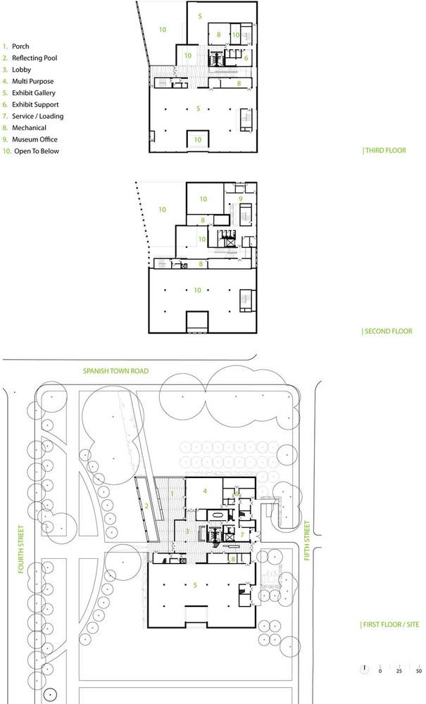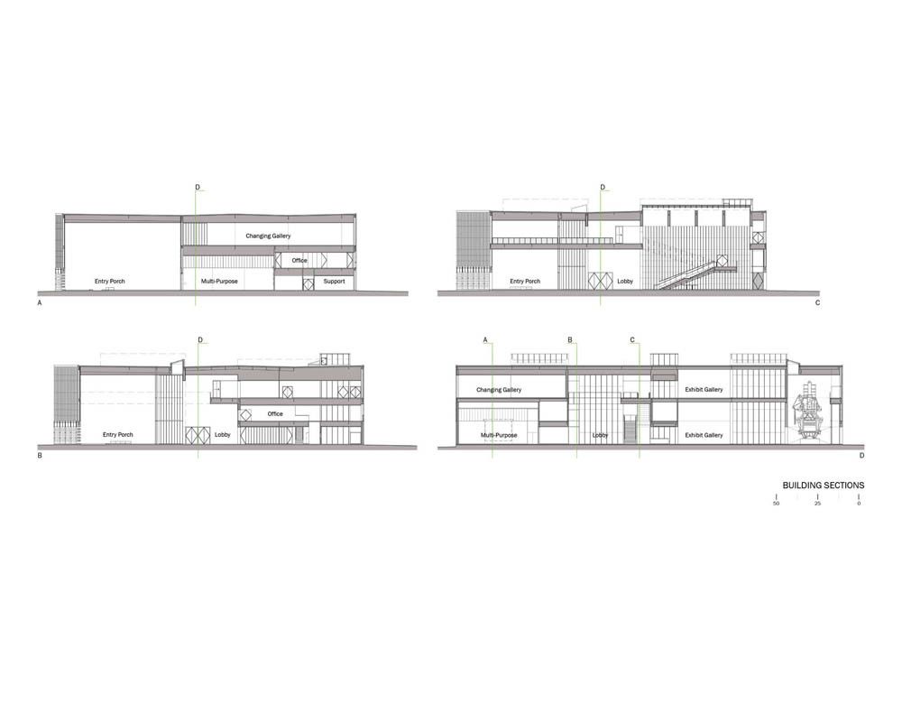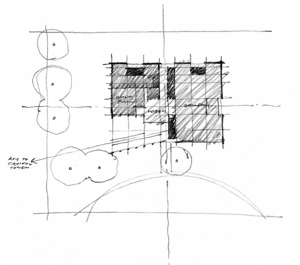 The museum’s siting establishes biaxial symmetry with the State Library across the street and along the central organizing axis of the Capital Master Plan, which terminates in the Tower to the north. The museum can be approached from either of these two directions, where visitors converge at a large, covered terrace – a kind of over-scaled “porch”– that opens to the north to provide framed views of the Capitol and Gardens.