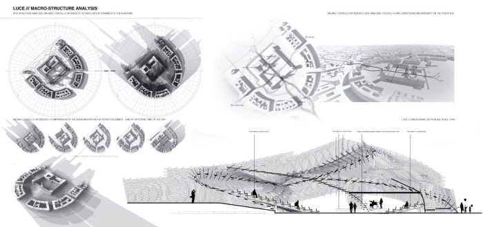 «Luce» is a proposal for an avant-garde theater designed as a temporal, modular, adaptable venue where the utopia become reflected in the structure’s ephemeral apparition and transience presence. In «Luce»’s theater the architecture serves as a possible background, a setting, a building that can be calculated and transformed into the measurements and concrete materials of an often elusive feeling, where the architecture provides a stage for life within public spaces acting as backdrops for life’s experiences and where the theater acts a metaphor for his beliefs. A productive structure where architecture end and the world of the imagination began. The characterizing concept behind «Luce» theatre had been to explore the emotive power of a space, it’s ability to aid storytelling and the possibility of be manipulated to achieve a dramatic purpose, within solid base principles and new experimental formal expression and technological performance.