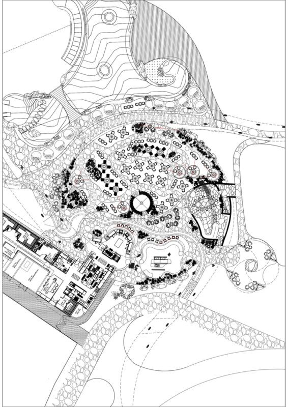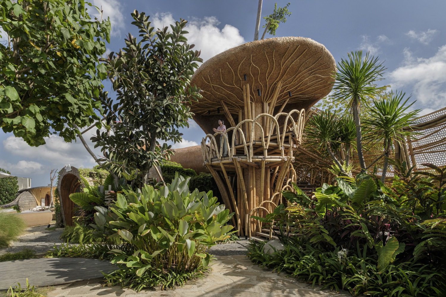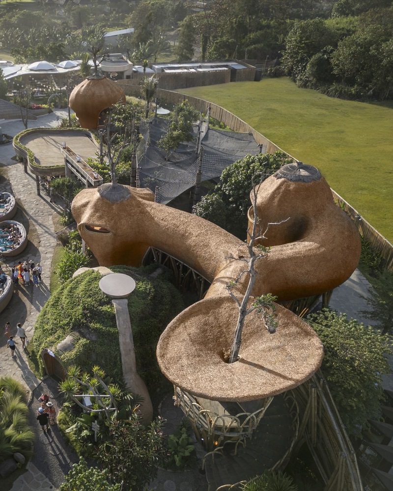 Connected to the restaurant is a lagoon-style pool facing the sea, into an underground ‘Utopia Cave Club’ with a thrilling 11m river slide. Adjacent to this in the forest area, elevated pods made of recycled materials intertwine with the trees, offering playful spaces like nets, tunnels, and climbing routes that blend with the natural surroundings. ‘Elysium’ located in a secluded corner, serves as a serene space for ceremonial events such as meditation, weddings, and yoga.