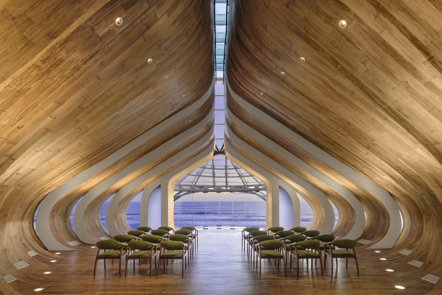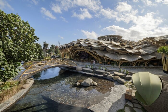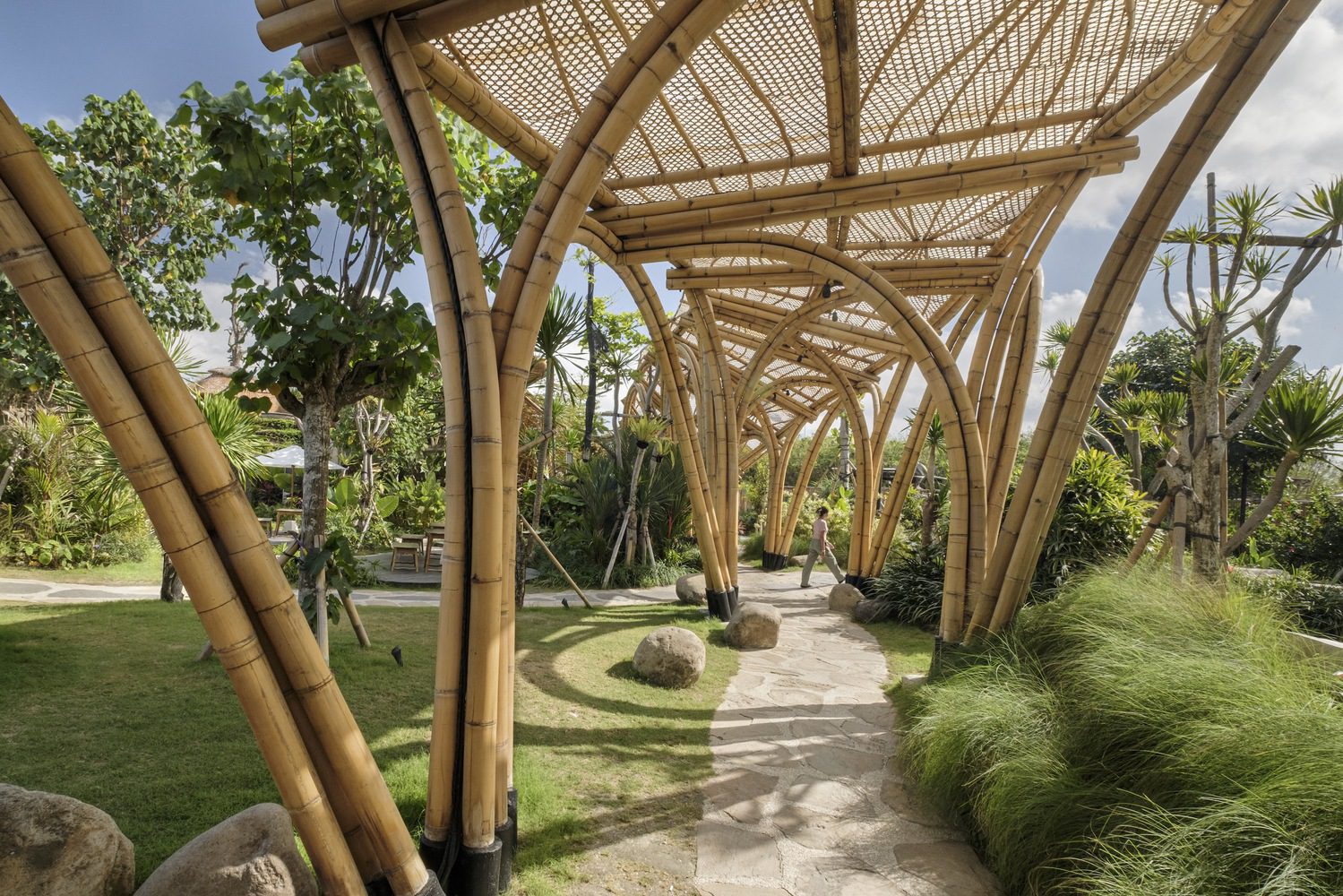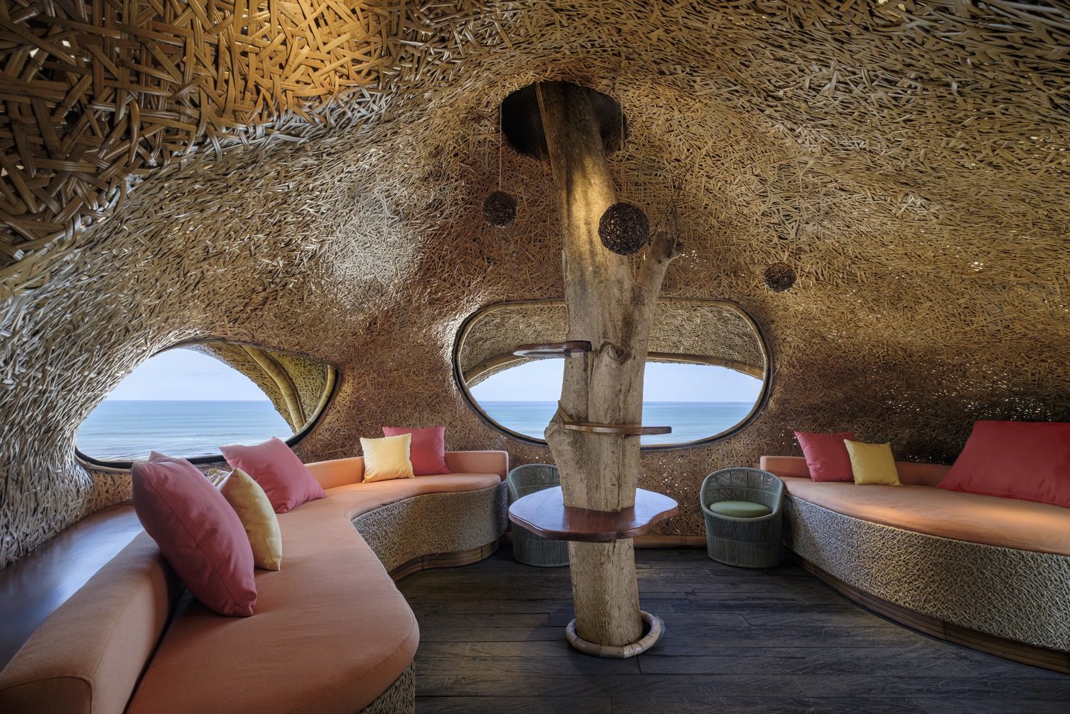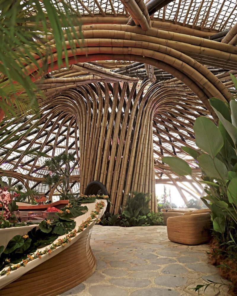 With such complex geometry used throughout combined with forward-thinking ecologically friendly materials, there was a huge degree of research and design that had to be explored. This requires a lot of energy in testing, prototyping, creating confidence, and training construction teams to be able to learn several new building techniques along with the quality control needed to be able to deliver this. In doing so it managed to create the world’s first building to use a combined bamboo and basalt structural system. This can be seen in the beach club double curvature structure. The translucent roof material was also the first time used extensively as a membrane system.