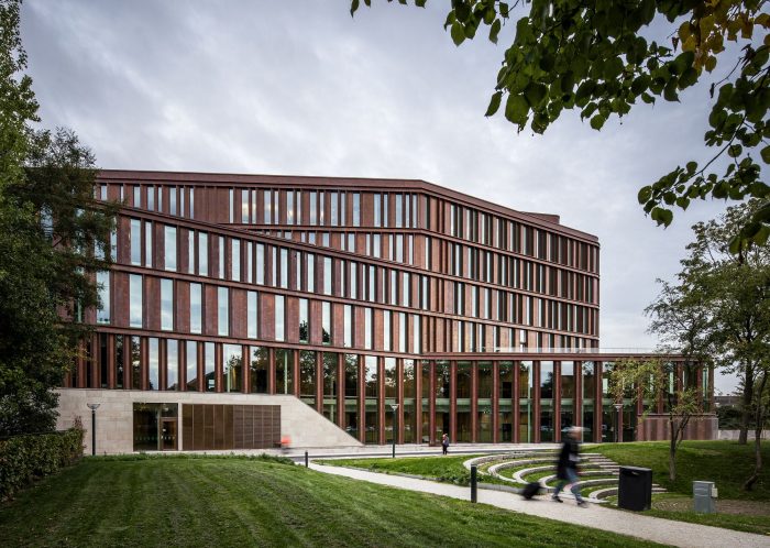 The copper sheets, glass and limestone work in harmony with the curving oiled ash panels of the interior. The areas open to the general public are housed in an open space spanning two floors with large expanses of glass opening onto the park outside. The relationship between transparent and non-transparent sections is carefully considered to balance views, daylight, and visibility. The shape of the building produces two roof terraces adjoining staff canteens.
