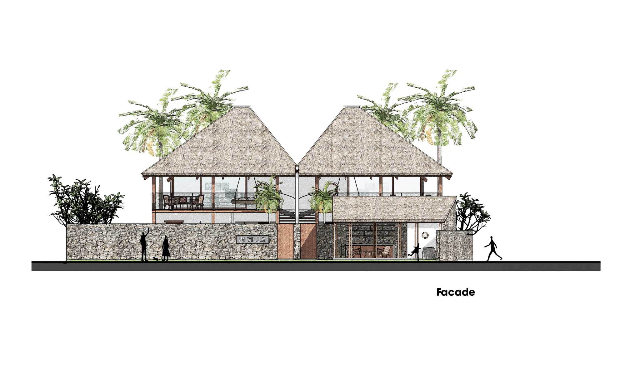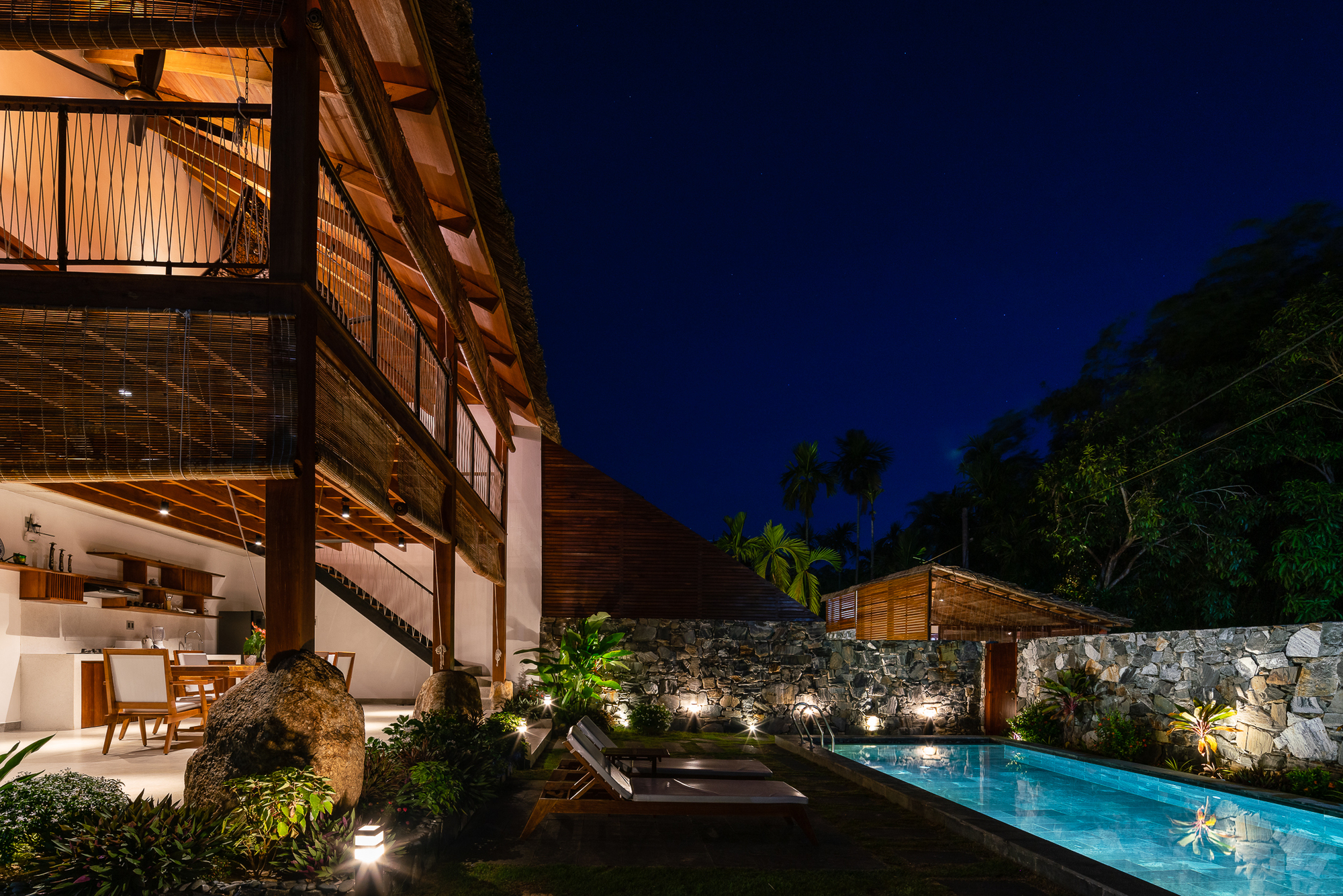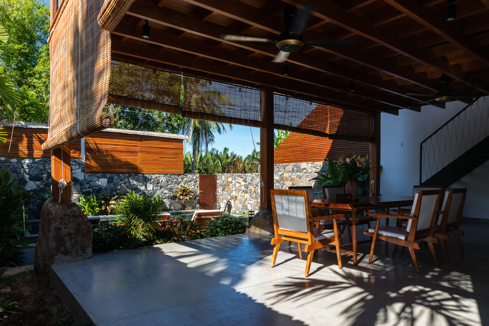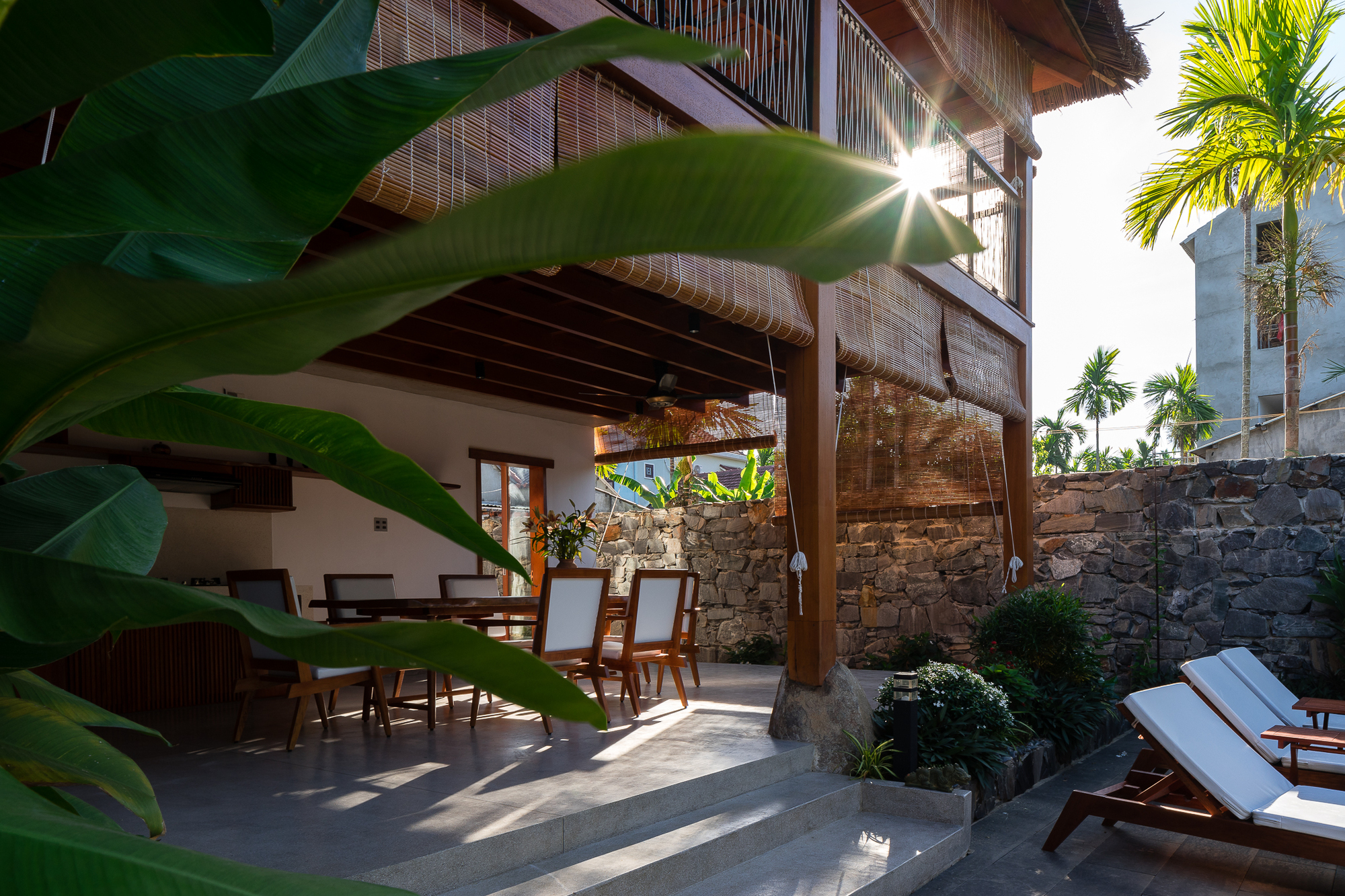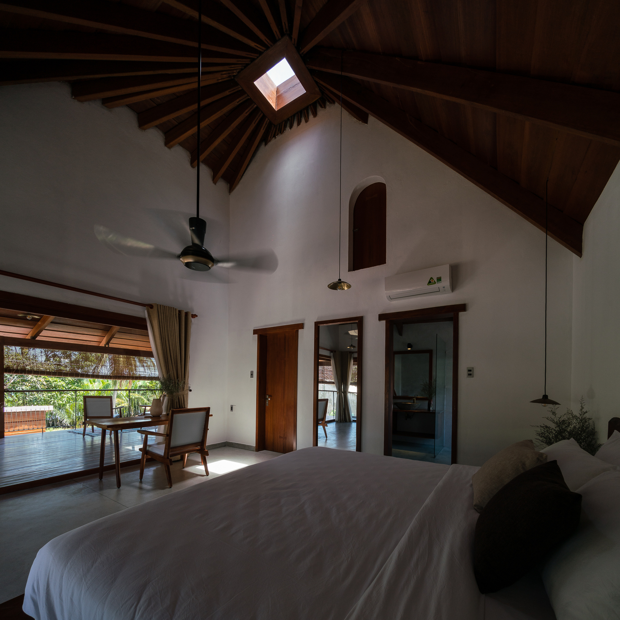 D1 proposes the idea of using a large coconut leaf roof covering the function. From a distance, the villa looks like a large tent. Living areas are positioned on the exterior while the interior space inside is reserved for resting. At the same time, both spaces are seamlessly connected to the surrounding nature.