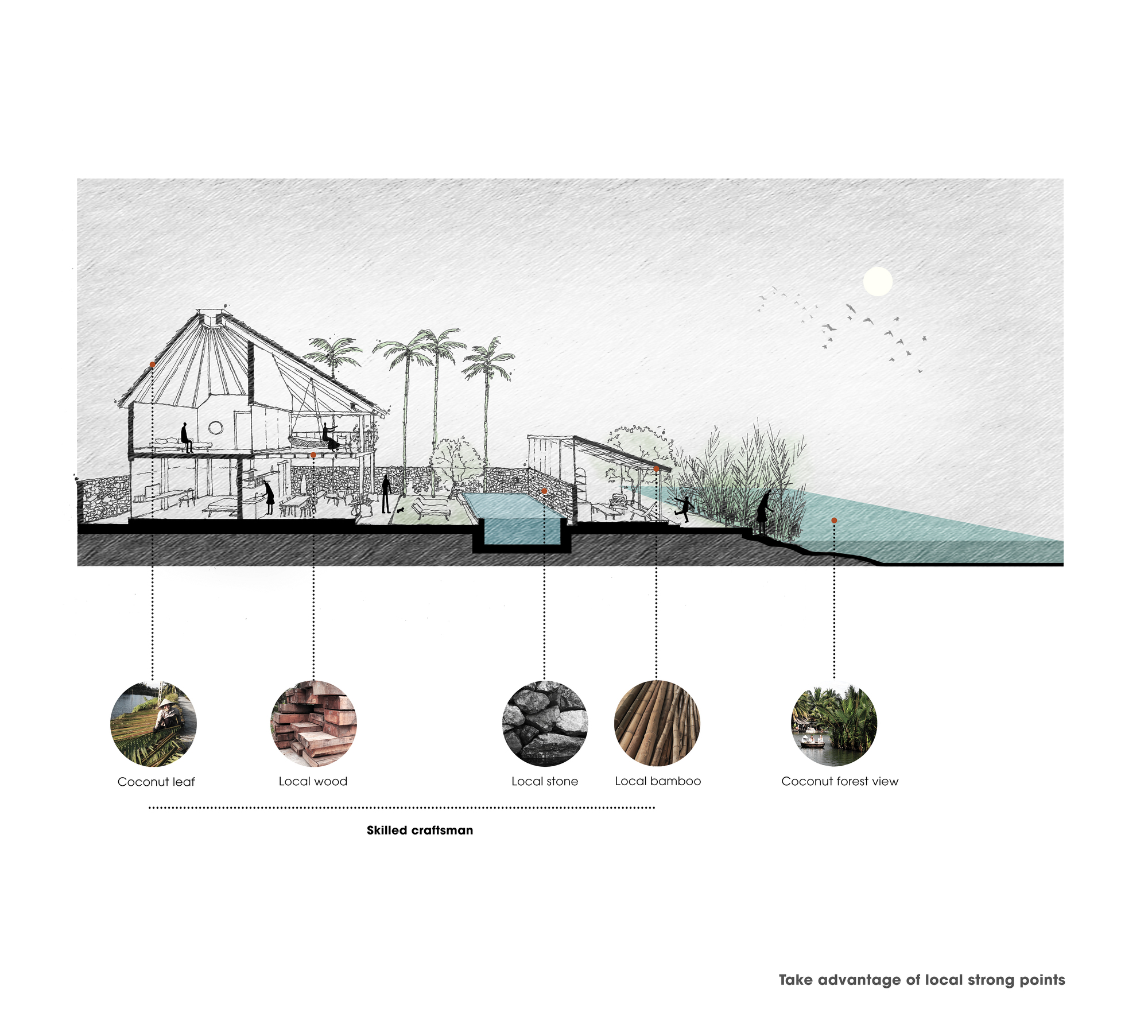 The challenge of this project is to effectively exploit the surrounding landscape and inject soul into the project via the use of local materials. Moreover, the project has to be able to endure the harsh climate in Hoi An, with a long rainy season and a very cold winter. Even worse, this location witnesses frequent storms and floods every year.
