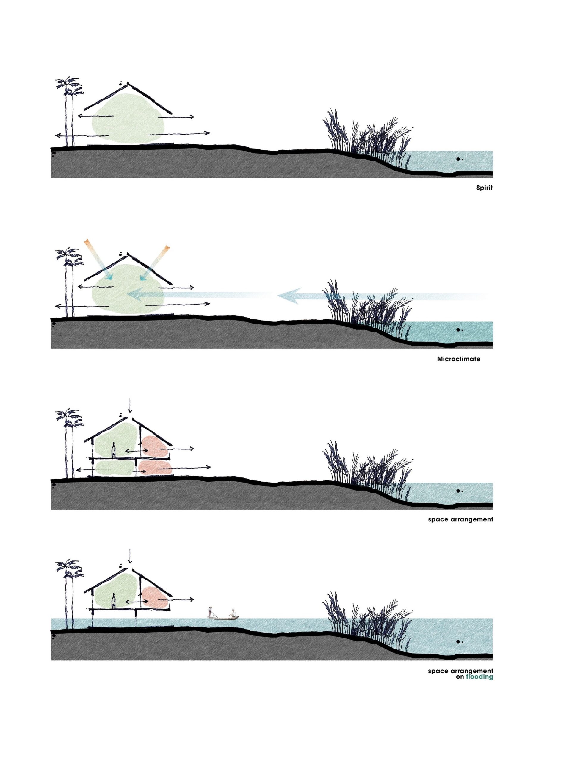 To effectively take advantage of the beautiful surrounding landscape, the design minimizes walls to the max in order to maximize wide angle. All functions are arranged vertically, leaving the ground floor open, flexible, and easy to move in case water level rises during heavy rainy season.
