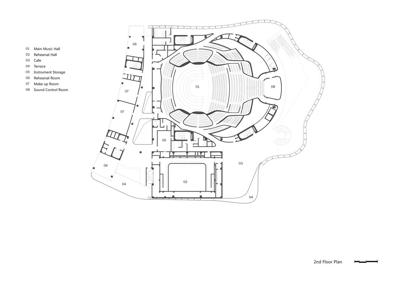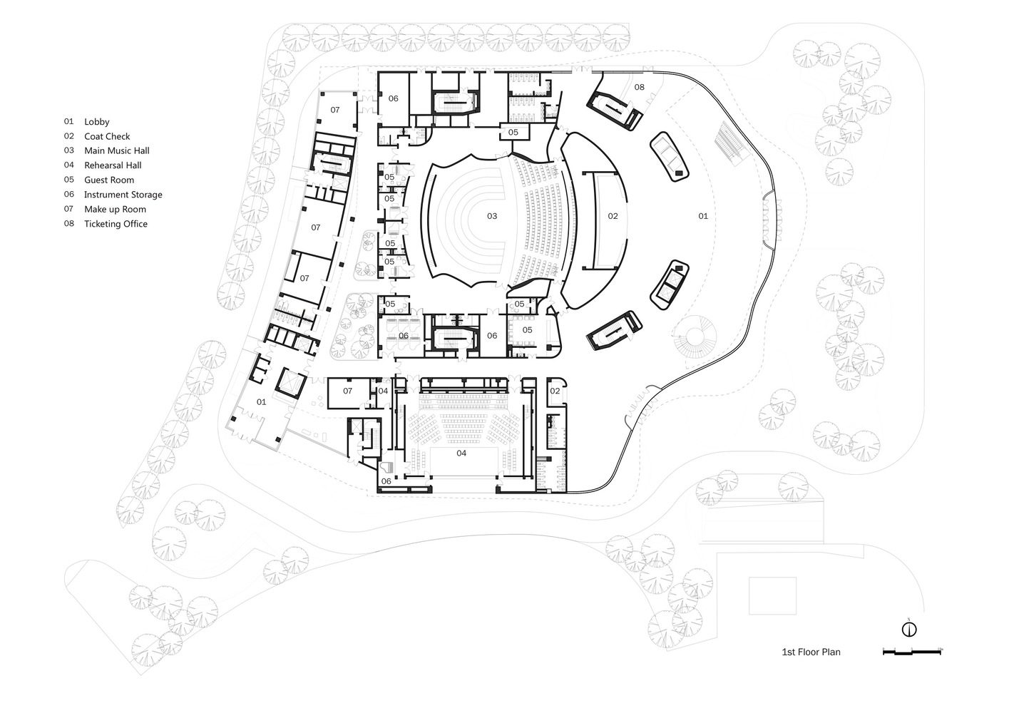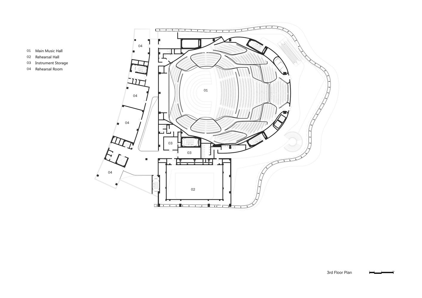 The concert hall project was approved by the National Development and Reform Commission, and the State Administration of Press, Publication, Radio, Film, and Television of the People’s Republic of China considers it a high-priority national project. Located at the south side of the Workers Stadium East Gate in Beijing’s Central Business District, the concert hall covers a site of 11,600 sqm, and has a total floor area of 26,587 sqm. The building is surrounded by a lotus pond and lush greenery. The translucent façade gently emerges from the landscape like a piece of jade. While walking past the building, people will be attracted to its soft glow.