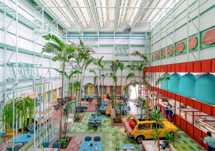 The sustainable approach to the interior is forward thinking about both technical elements, but also about blending the constructed environment with the natural. The use of natural planting throughout the project, which includes palm trees of five meters and Musgo (or Spanish Moss) draped lights, is complimented by the cool tone of the vertical exposed structural and plumbing elements. This produces a kind of heightened sense of nature- nature curated like a garden- the space is straightforward and efficient like an industrial warehouse or factory but also made imperfect by the incorporation of furniture and other design elements.