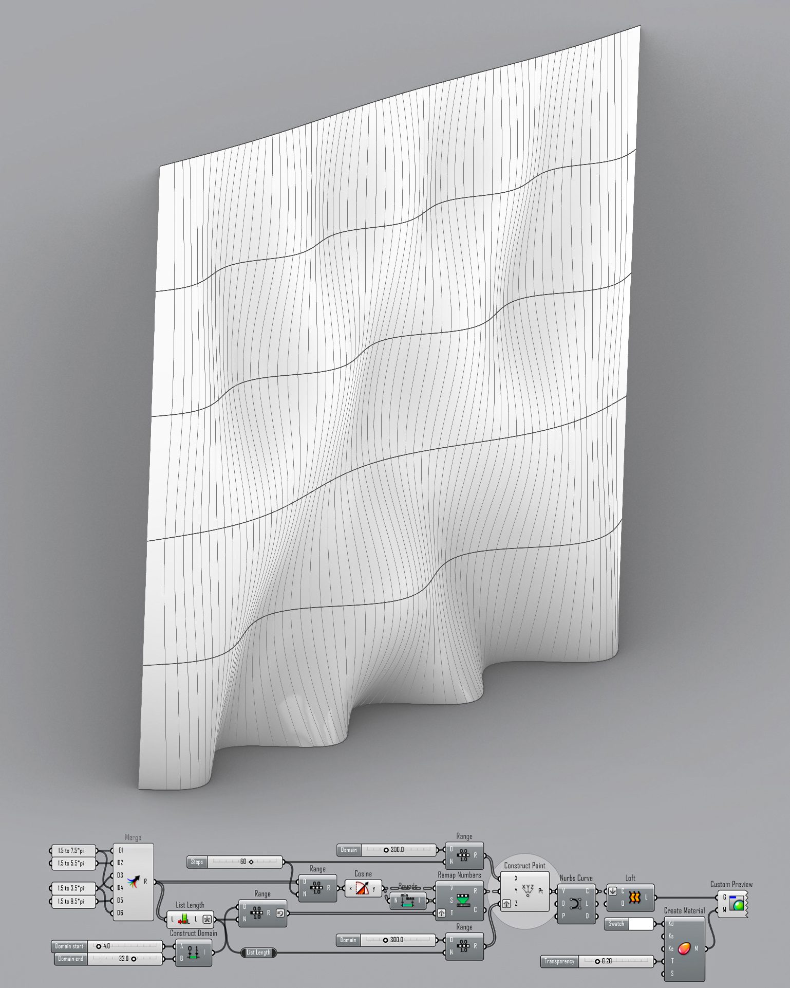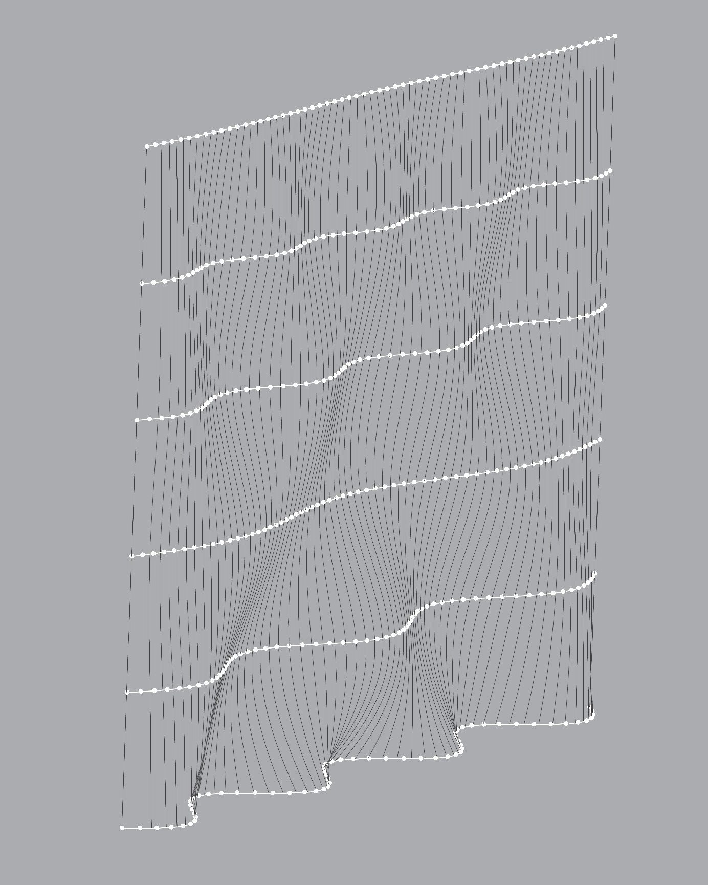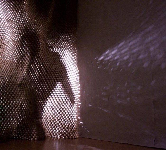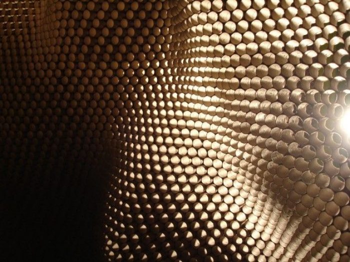 Infrared, a group of researchers and fabricators located in Thessaloniki, Greece, has created Madren 5340. A piece of duality, this work investigates the theme of private space and its varying degrees through the use of hundreds of individually placed paper tubes. The surface was generated algorithmically using a bedroom as a base situation, regulating light and visibility into space. Different sine waves were interpolated between to create a double-curved wall which is self-supporting from the ground. The designers describe as,