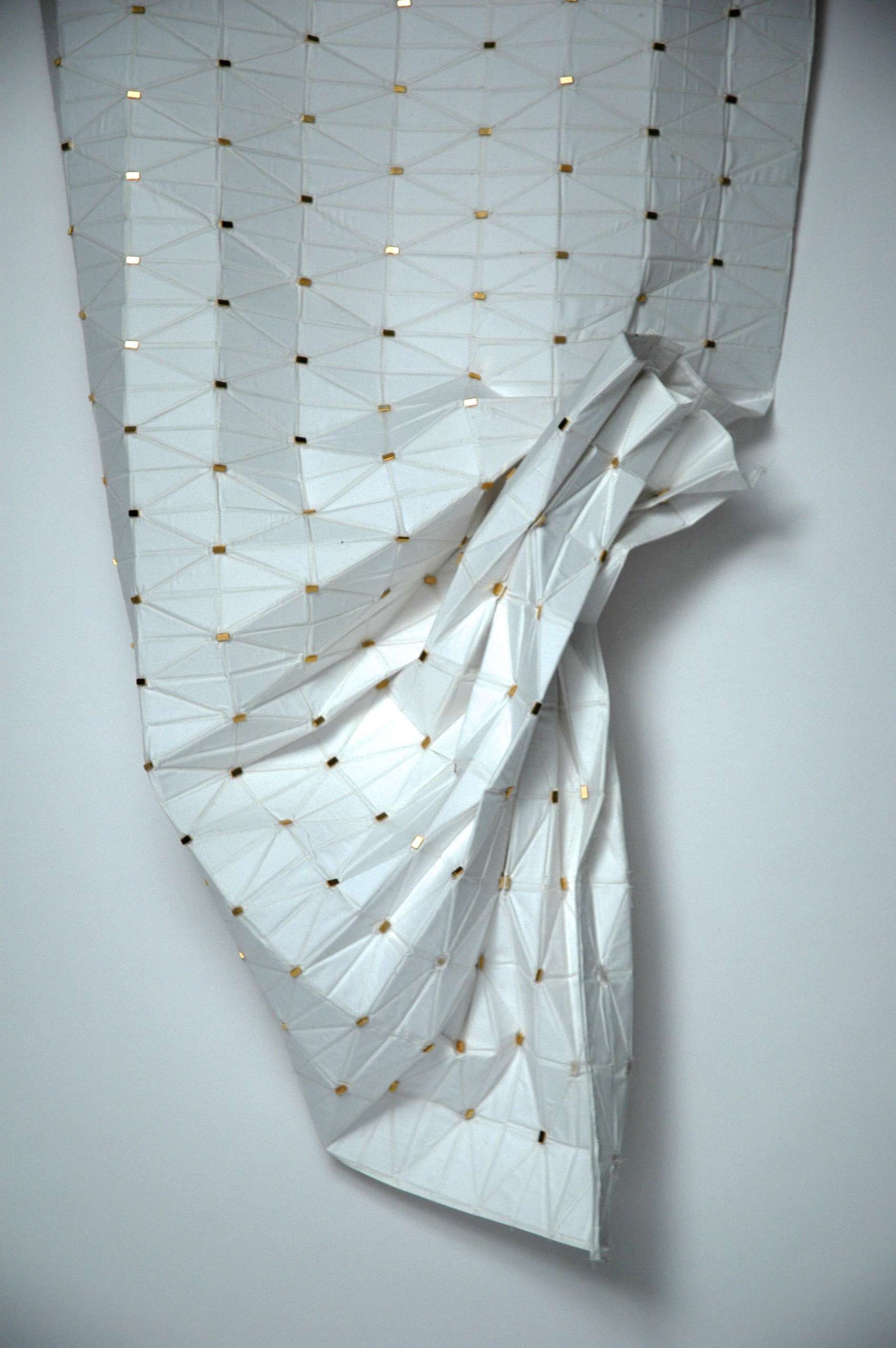 The design is a white fabric that is transparent enough to let some light travel through it, which is quite nice when the curtain is folded for the reason that it creates some nice geometries.