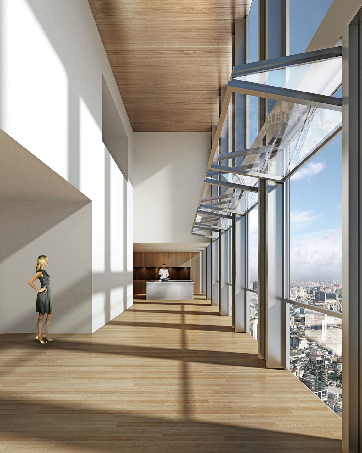 The main structure and life core are wrapped by a series of mega columns, connected at several transfer floors. The building uses 129 piles drilled to a depth of 65 meters capped with a massive 8.75-meter thick mat foundation, to compensate for Bangkok’s soft soils.