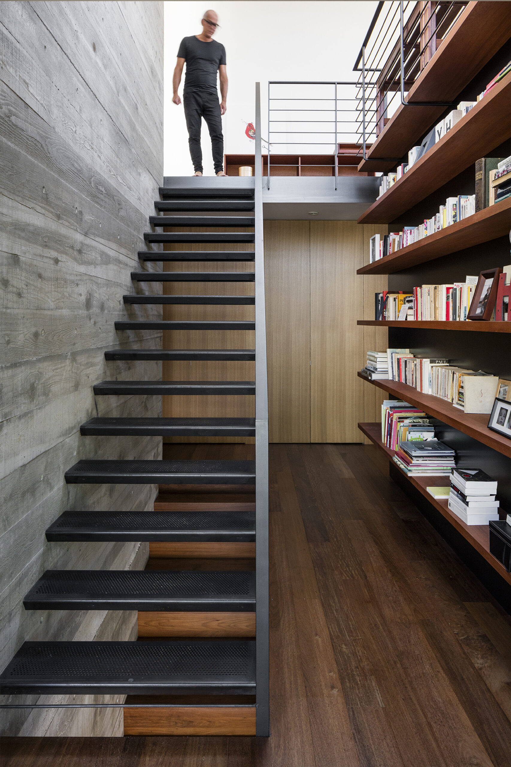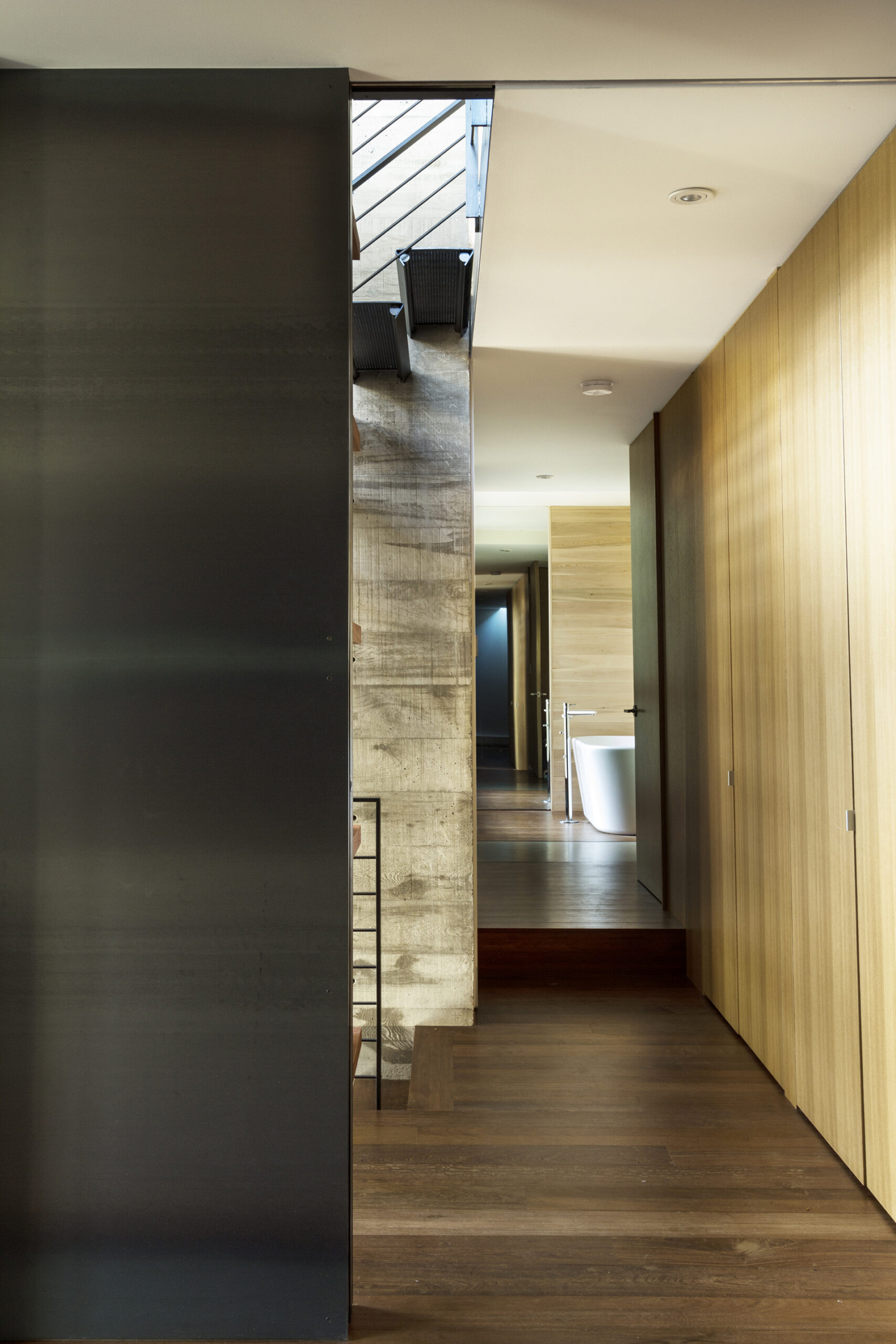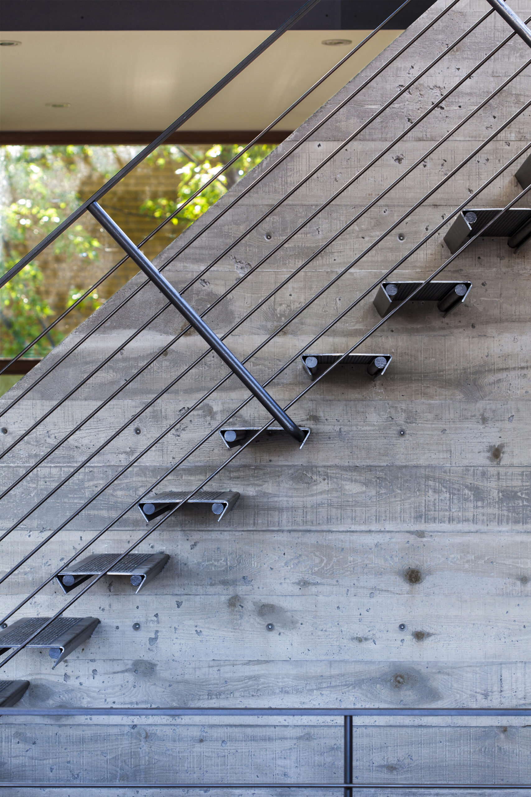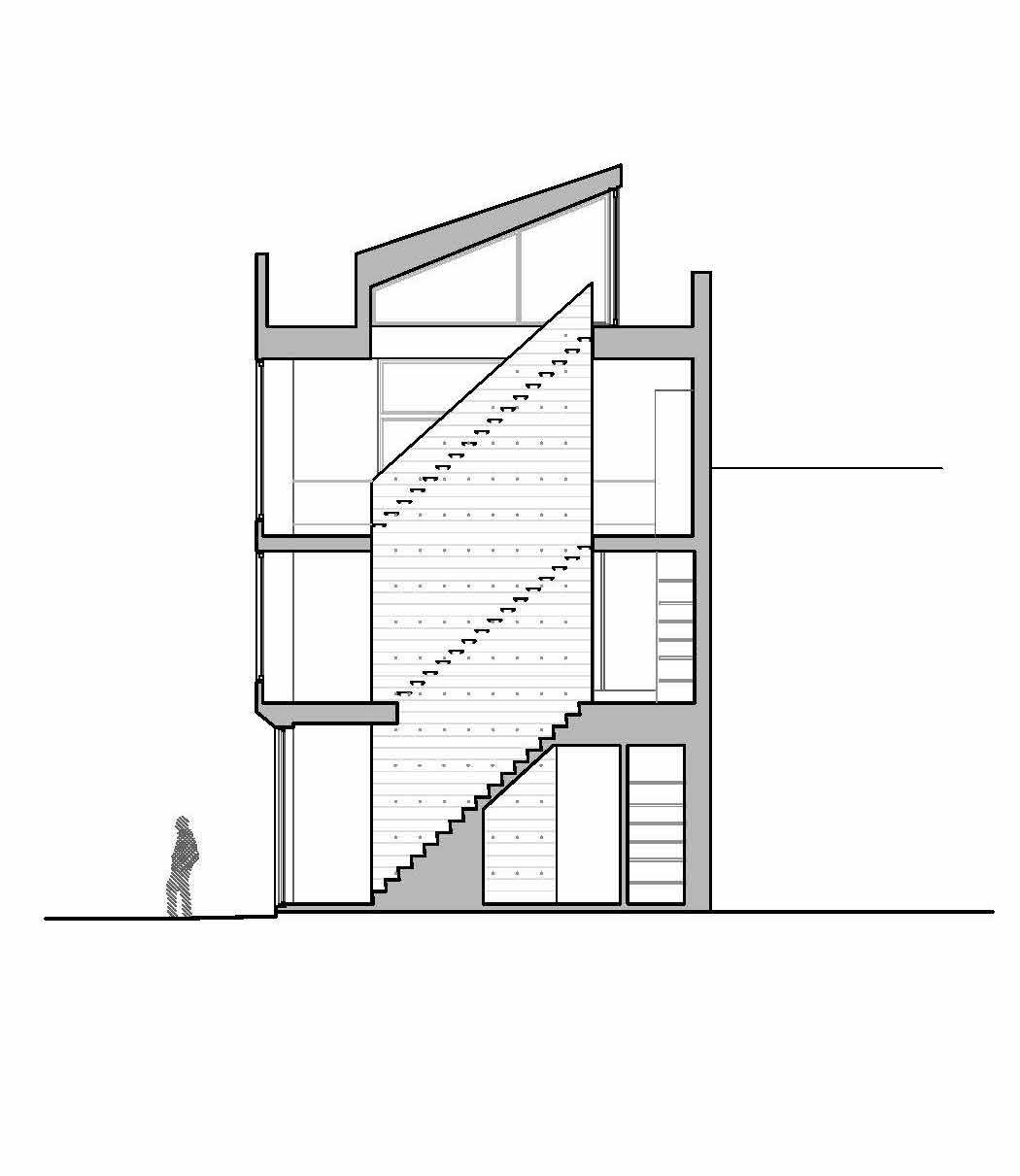 The spaces are organized around a large raw-concrete wall. This wall/stairway crosses the house on all levels, from the ground floor to the rooftop patio. It serves as a backbone for the building as well as a vertical passage that brings light from the penthouse along a circuitous route to all three floors.