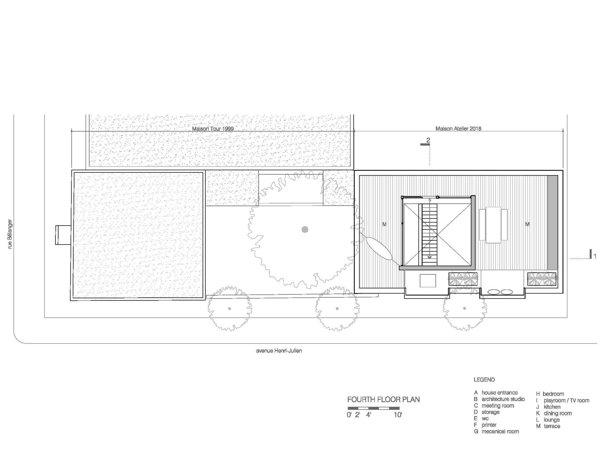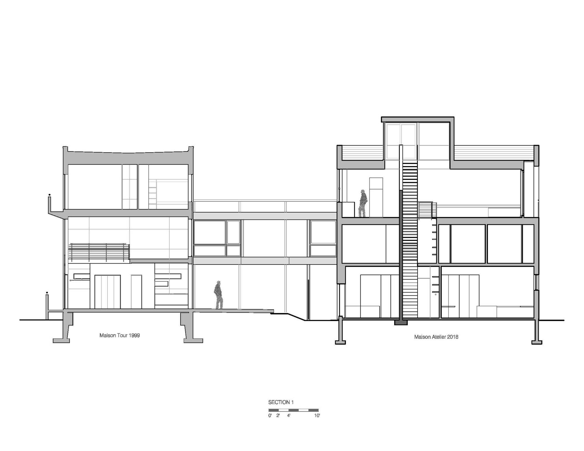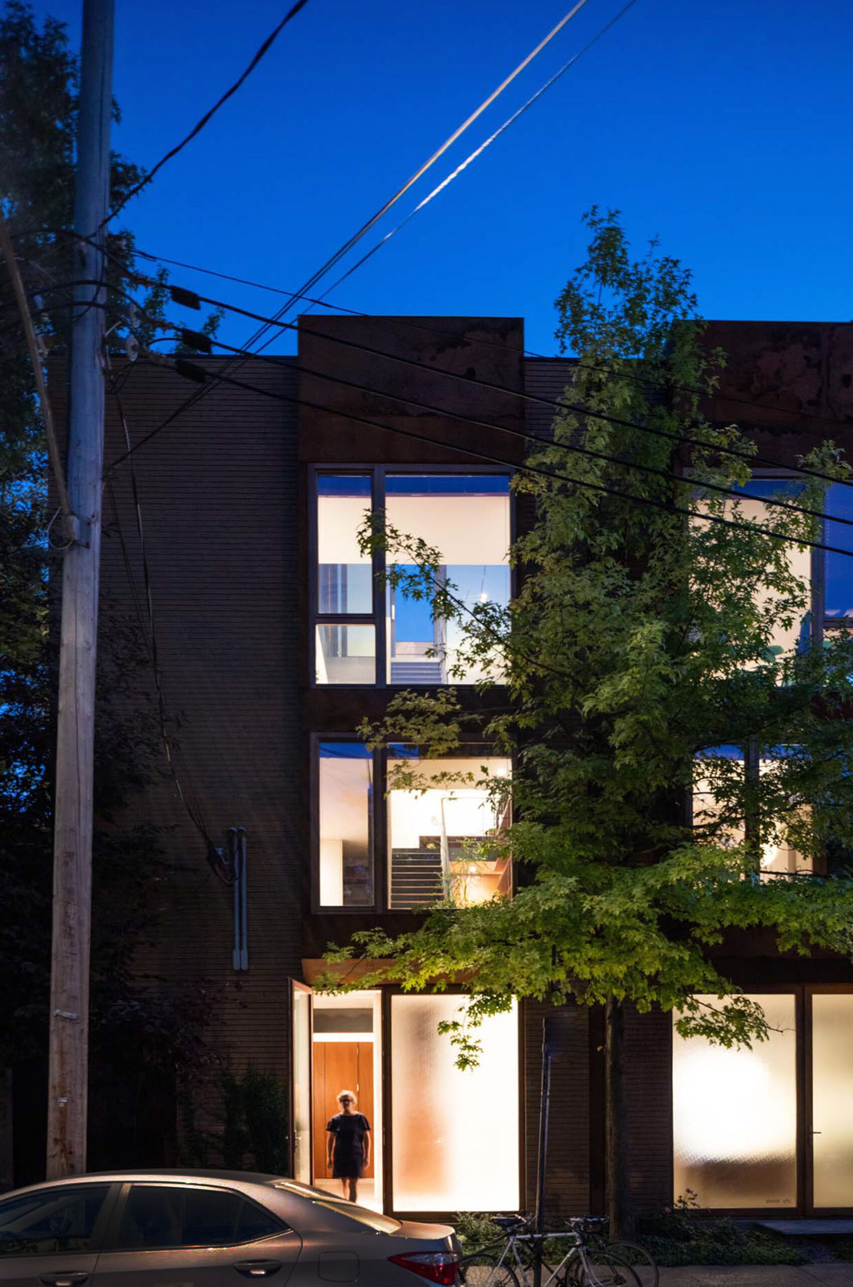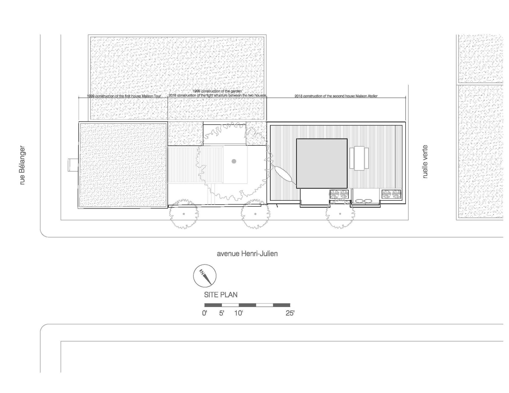 Maison Atelier, The project reflects the natural evolution of this typical lot of Montreal towards greater densification. Over the last 20 years, the architectural firm has transformed this typical Montreal lot twice: First, with the creation in 2000 of the Maison Tour, a home/studio combination organized around an inner courtyard bracketed by a three-story vertical house and a workshop in a former garage at the back of the yard. Second, with the creation, based on the existing building at the back of the yard, of a second three-story home, the Maison Atelier yh2, independent of the original Maison Tour.