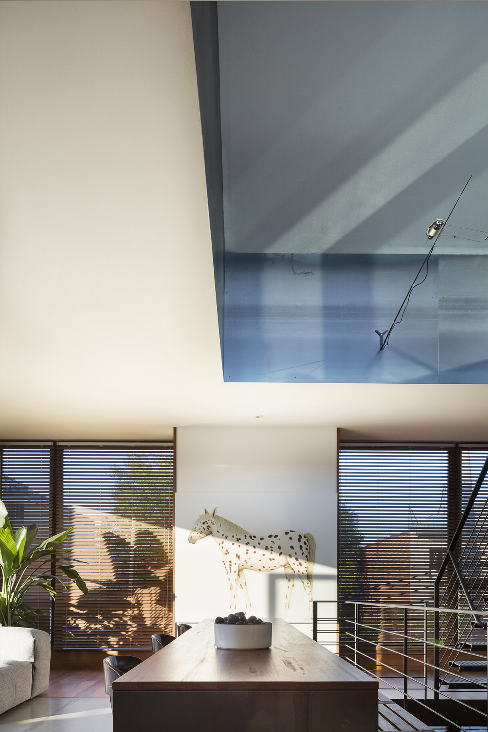 A lightweight structure on the second level links the two buildings, to comply with municipal by-laws prohibiting two detached buildings on a single lot. This aerial volume gives each house an extra room above the garden, without reducing the size of the courtyard.