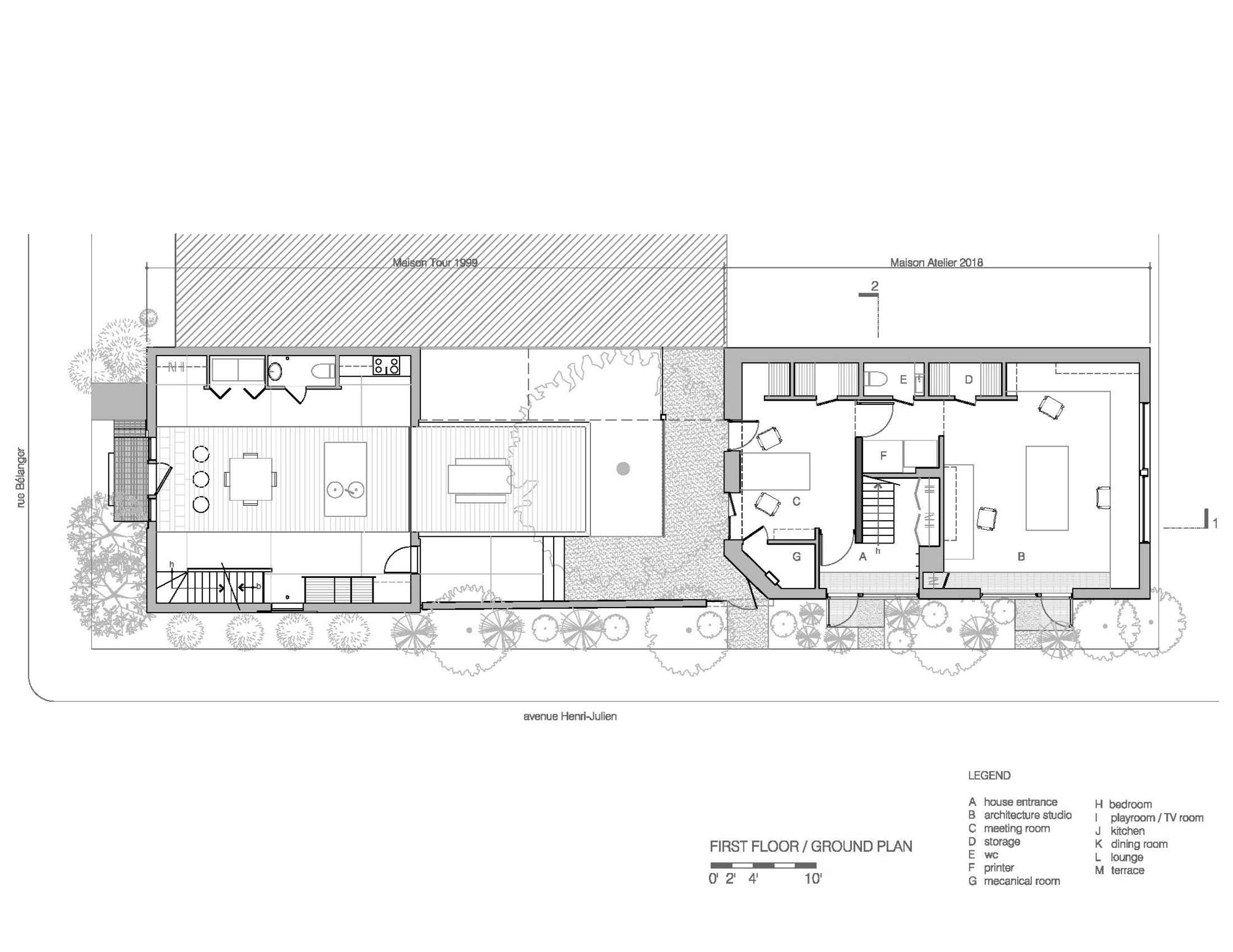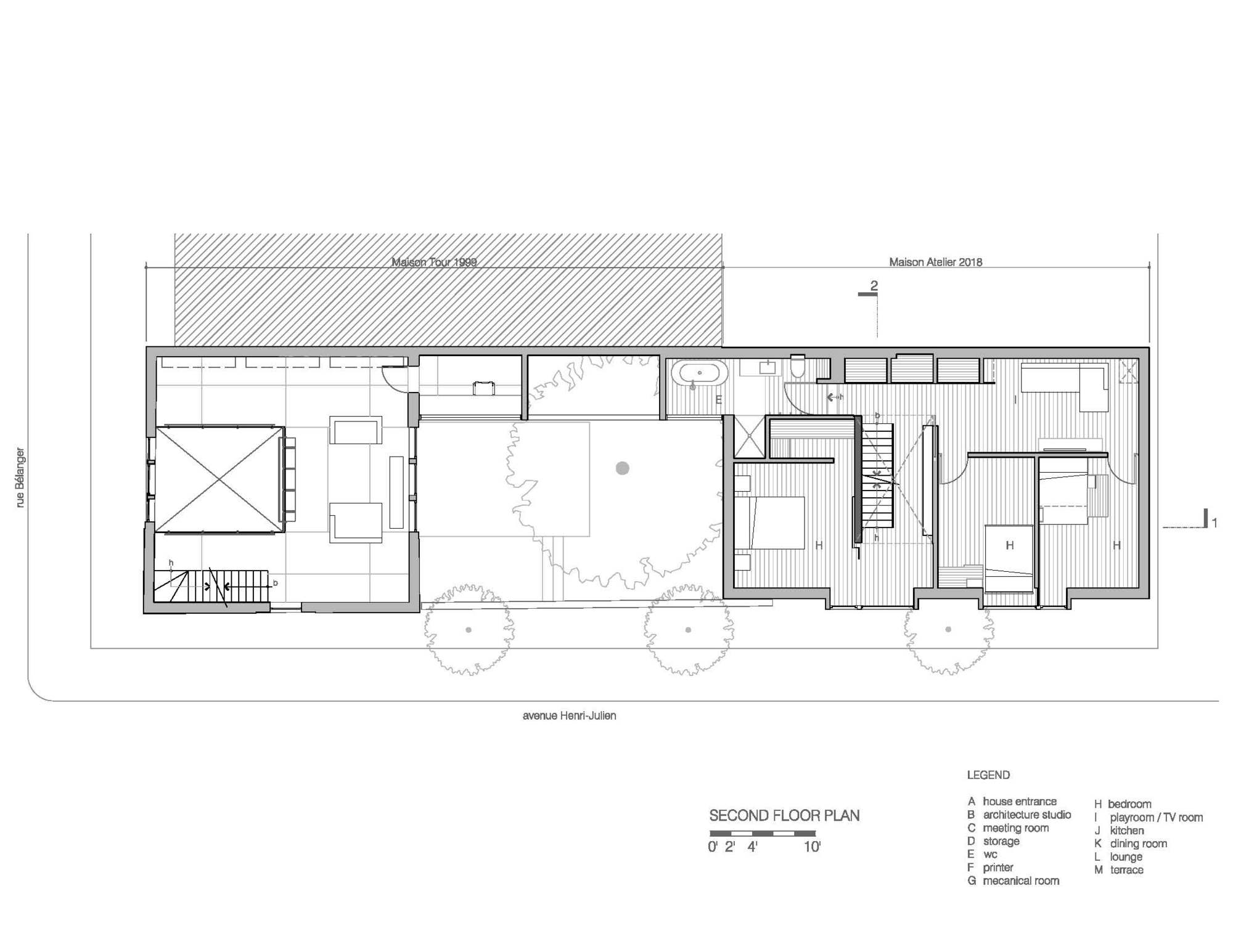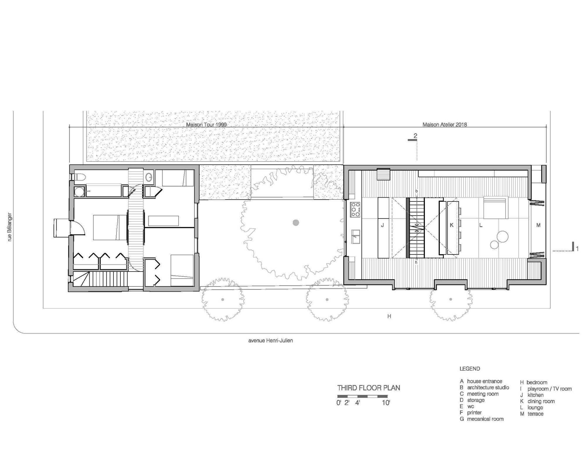 Accessed directly from the street, the yh2 architecture studio is located on the ground floor of the new structure, in two minimalist spaces. Above the studio, but with its own street entrance, the dwelling in the new Maison Atelier yh2 occupies the top two floors of the building. The second floor, completely separate from the office, includes the bedrooms and family room. On the third floor, the living spaces boast expansive views of the cityscape.