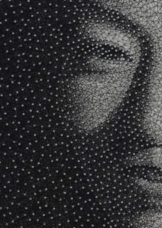 While appearing similar from a distance, the two utilize separate and unique methods of creation. The Constellation work, titled Mana #2, is created from a single, uncut, black thread woven around tacks at varying densities, thus creating the stylized image. Mother #2, of Warp and Weft, is constructed off of a panel of black denim which has had threads meticulously cut and pulled to create the dark spots of the image. Both will be on display at Scott White contemporary Art in La Jolla, California form 20 April until 1 June, 2013.