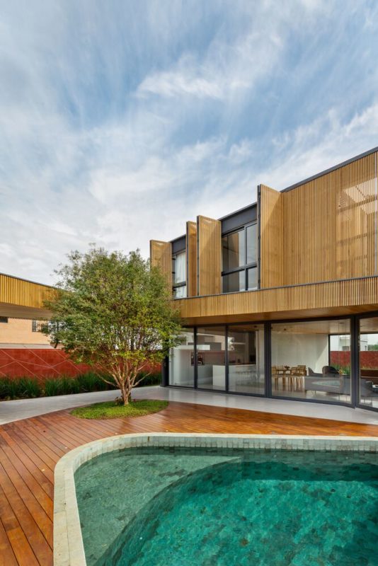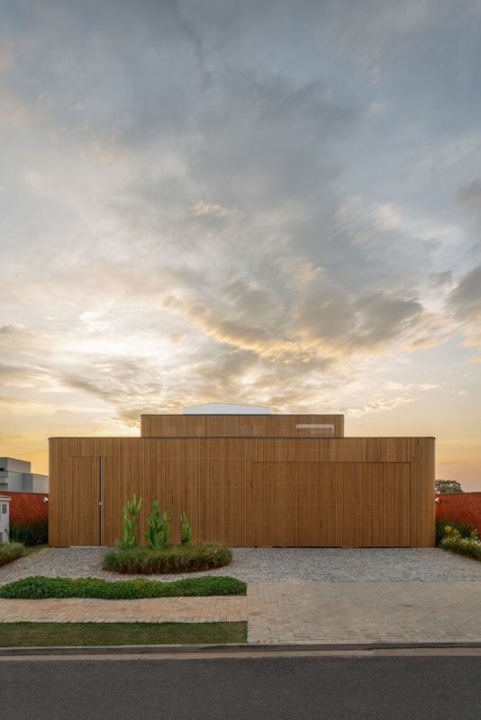 Mandacaru House is a canvas brought to life with three primary materials, each playing a distinct role in the composition. The wooden brise, like a loving guardian, envelops the front volume and the second floor of the back volume, imparting both privacy and delicate control over the play of light within the rooms.