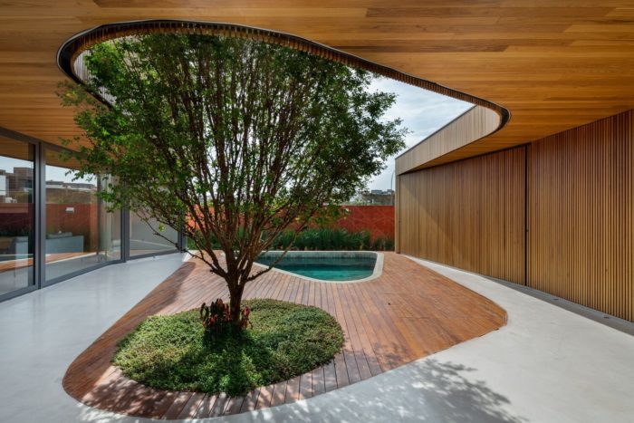 Connecting these two volumes with a gentle curve, a grand marquee unfurls its protective wings, gracing the central courtyard with its presence. This majestic canopy not only shelters the outdoor spaces but also enfolds within its care the shimmering pool, a center of joy and relaxation, and the revered jabuticaba tree—an essential element that adds a touch of nature’s grace to the composition.