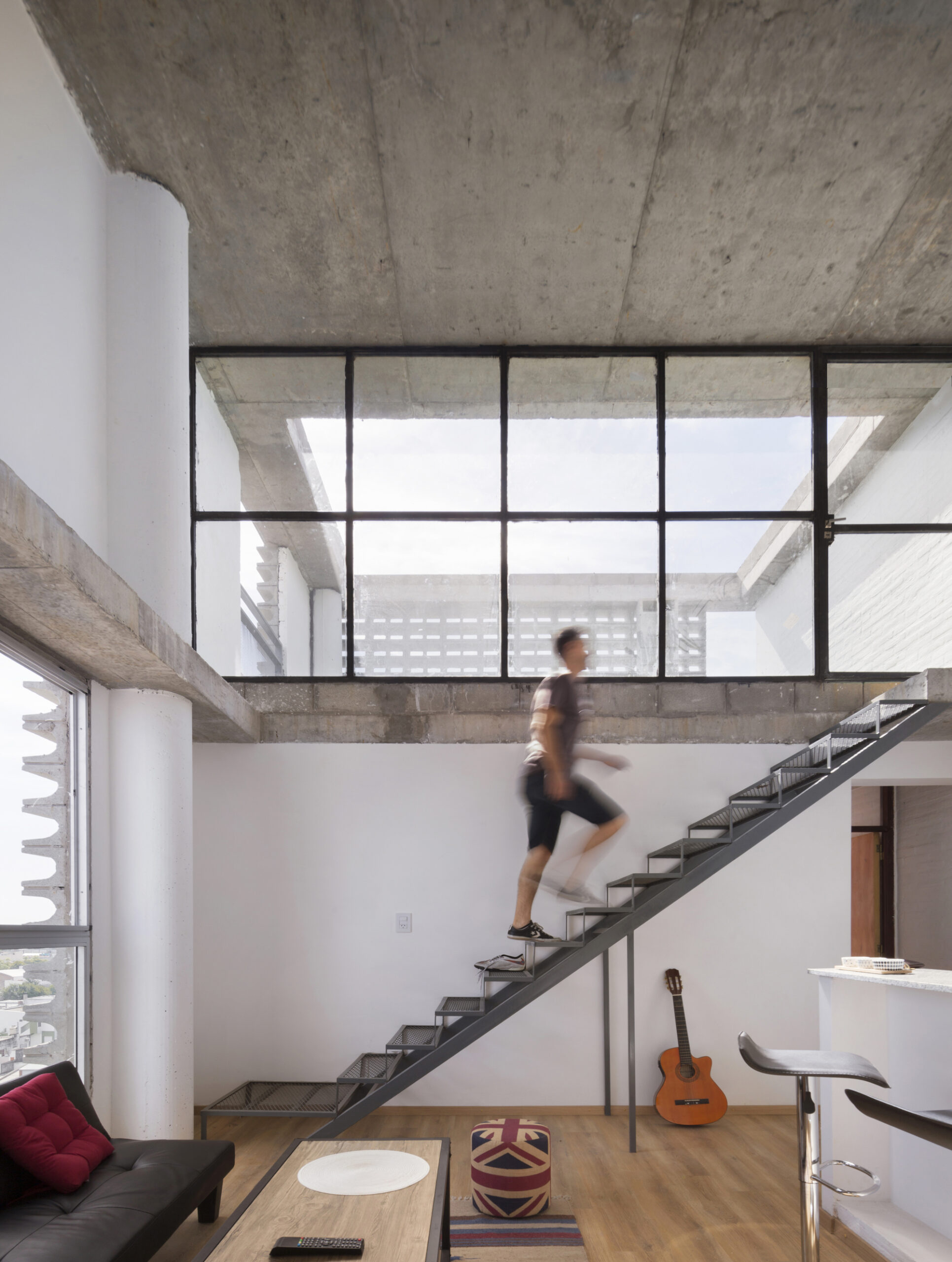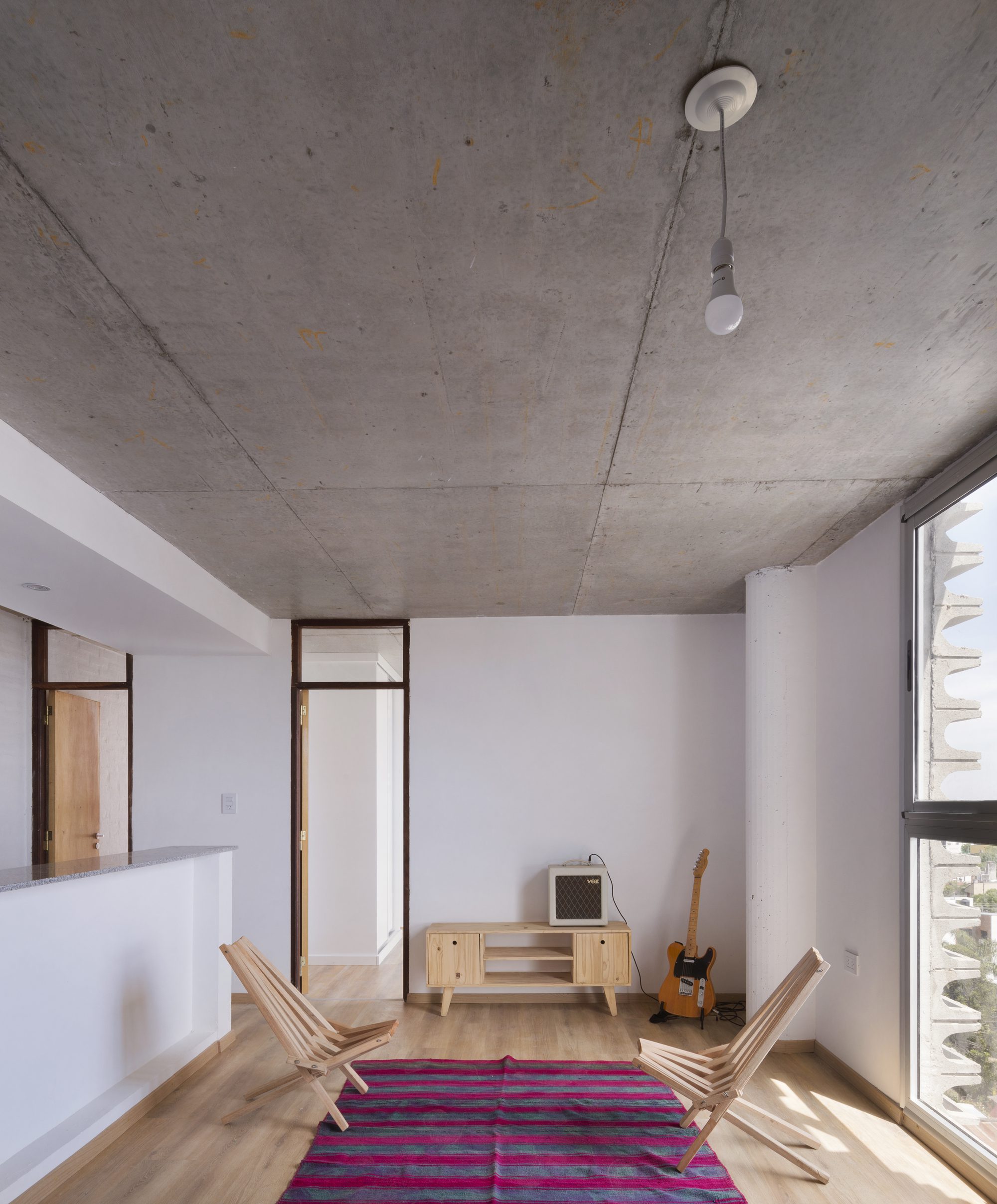 In this type of undertakings, the space used for common space is considered as a non-quantifiable area in terms of money, therefore, these sectors are usually reduced to the indispensable minimum. On this occasion, the entire built mass (which houses 18 units with surfaces that vary between 40 and 65m2) is articulated around the common space; which constitutes of an ascending route of diverse configurations. The access platform on the ground floor is followed by three floors of large platforms and internal stairs, the green terrace for common use on the 4th floor and there, emerging from the volume of apartments, the staircase/balcony for the seven upper floors. It is a route that relates in different ways to the immediate environment: the presence of the entrance platform minimizes the impact of the building on this neighbourhood of low houses. Open shields allow visual contact in both directions, interior-exterior, exterior-interior, as a sign of empathy with the environment.