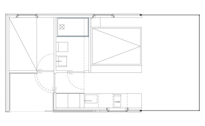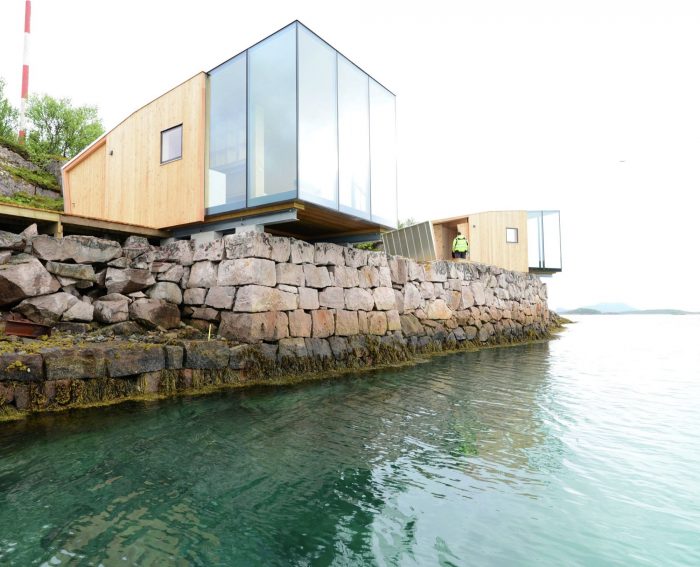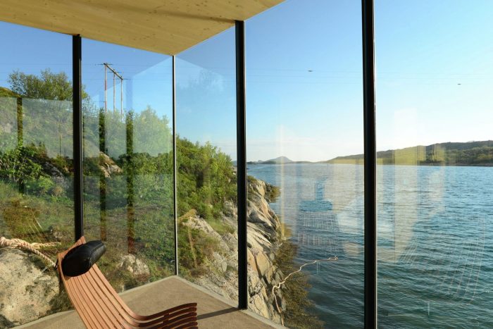 The cabins are designed to offer their guests shelter and comfort while at the same time underlining the dramatic experience of the elements outside; the sea, landscape, changing lights, weather and different seasons. Above all the cabins endeavor to fulfill the functional requirements of the guests, with ample space for luggage and clothing/equipment, a comfortable bathroom and a kitchen/dining area. The cabins accommodate two to four people or a family of five. The main bed is positioned in the main room, slightly withdrawn from the floor to ceiling glasses, to enable the visitor an around the clock experience of the outside elements, while still being comfortably sheltered.
