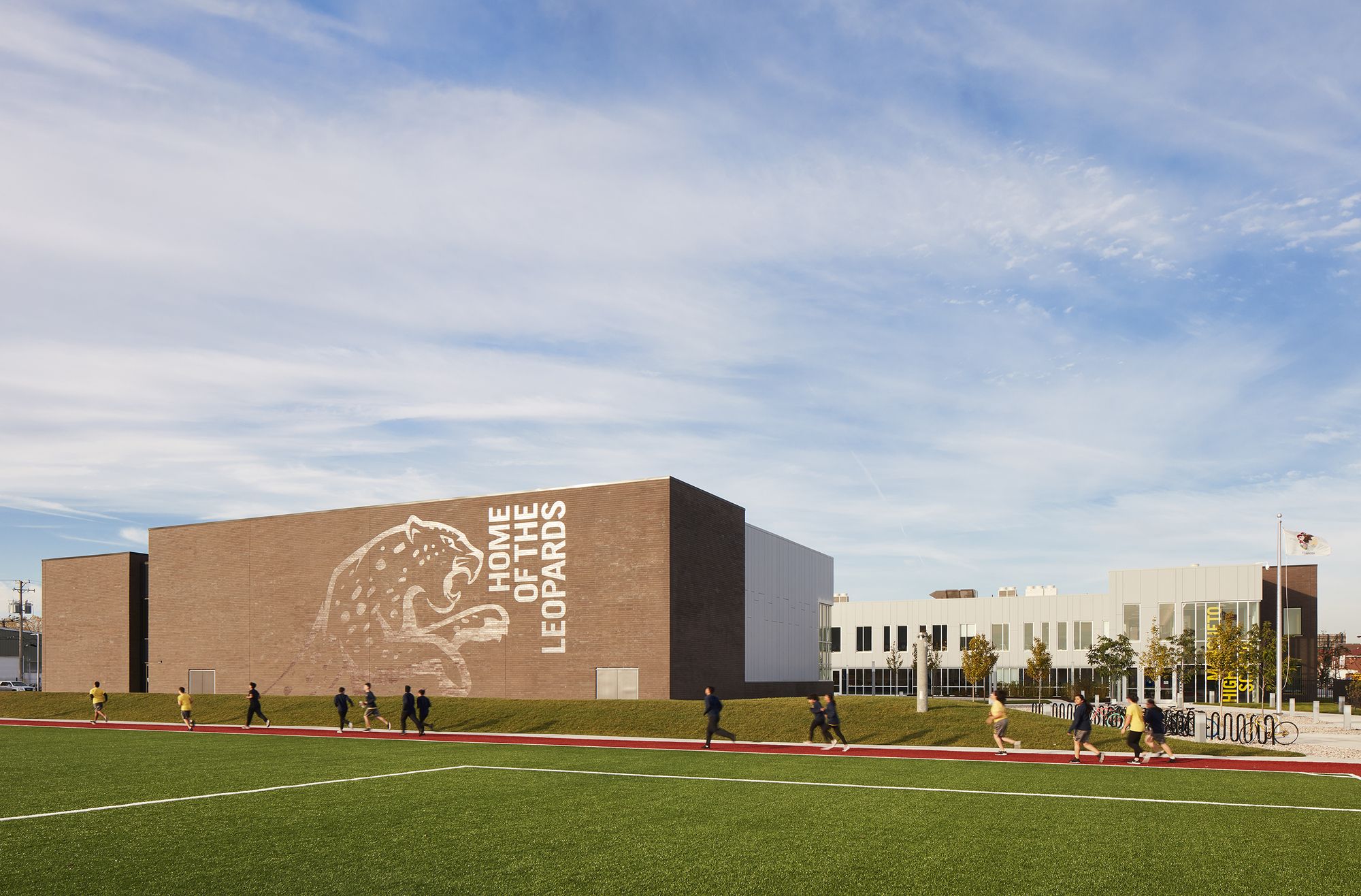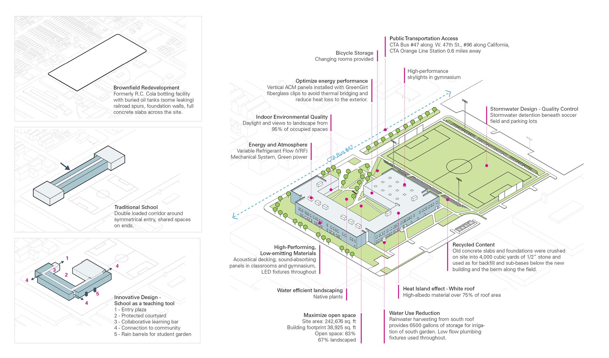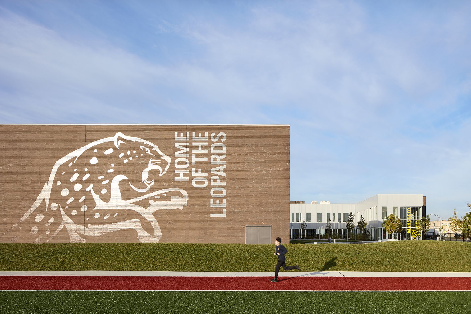 On the east side of the campus, a full-size soccer field is bordered by a walking track. Full-height masonry wraps the building partially on the north, and completely on the west, south, and east, entering the courtyard only at the gymnasium volume where it engages the light gray metal panels with a band of clearstory windows. The school’s leopard mascot spans across the gymnasium’s outer masonry façade. Splashes of color peek through the brick envelope to highlight the punched window openings, playfully organized on each façade. Environmentally progressive materials and design features are apparent throughout the LEED Certified building and landscaping. High-performance skylights and windows diffuse daylight into classrooms and provide views to the courtyard and across the building. All spaces (excluding the gymnasium) are mechanically heated and cooled using a variable refrigerant flow (VRF) system which is extremely energy efficient, leading to energy savings and reduced operations costs. This is one of the first schools in Chicago to employ this mechanical systemز A rainwater harvesting system from the southern roof provides passive irrigation for the campus, with additional stormwater detention under the soccer field and south parking lot. Rather than diverting existing concrete pavement on-site to landfill, it was reused on-site as backfill under-slab sub-grade and landscape berms. The asphalt pavement was manufactured with the highest percentage of recycled content allowed by the Illinois Department of Transportation.
