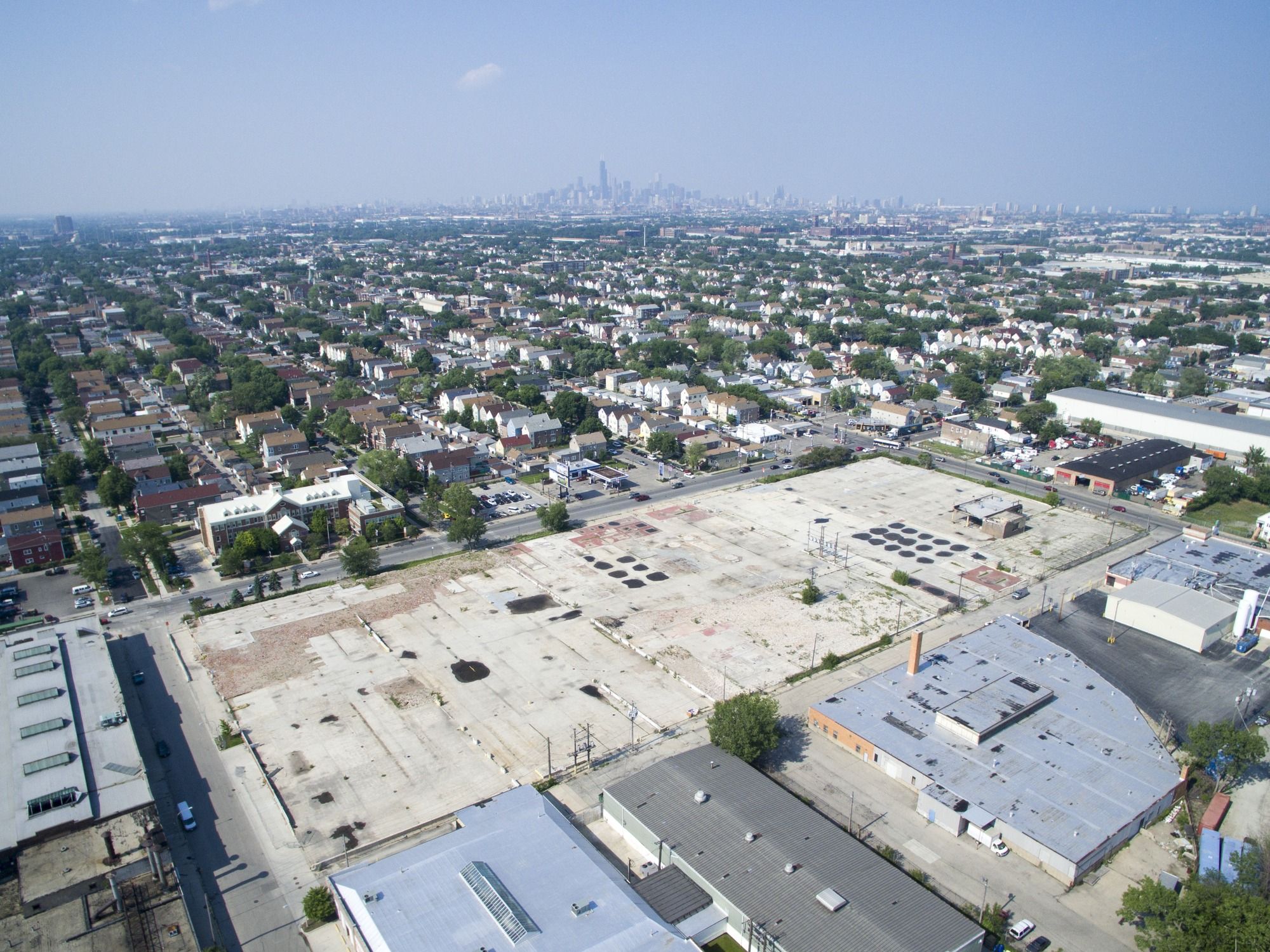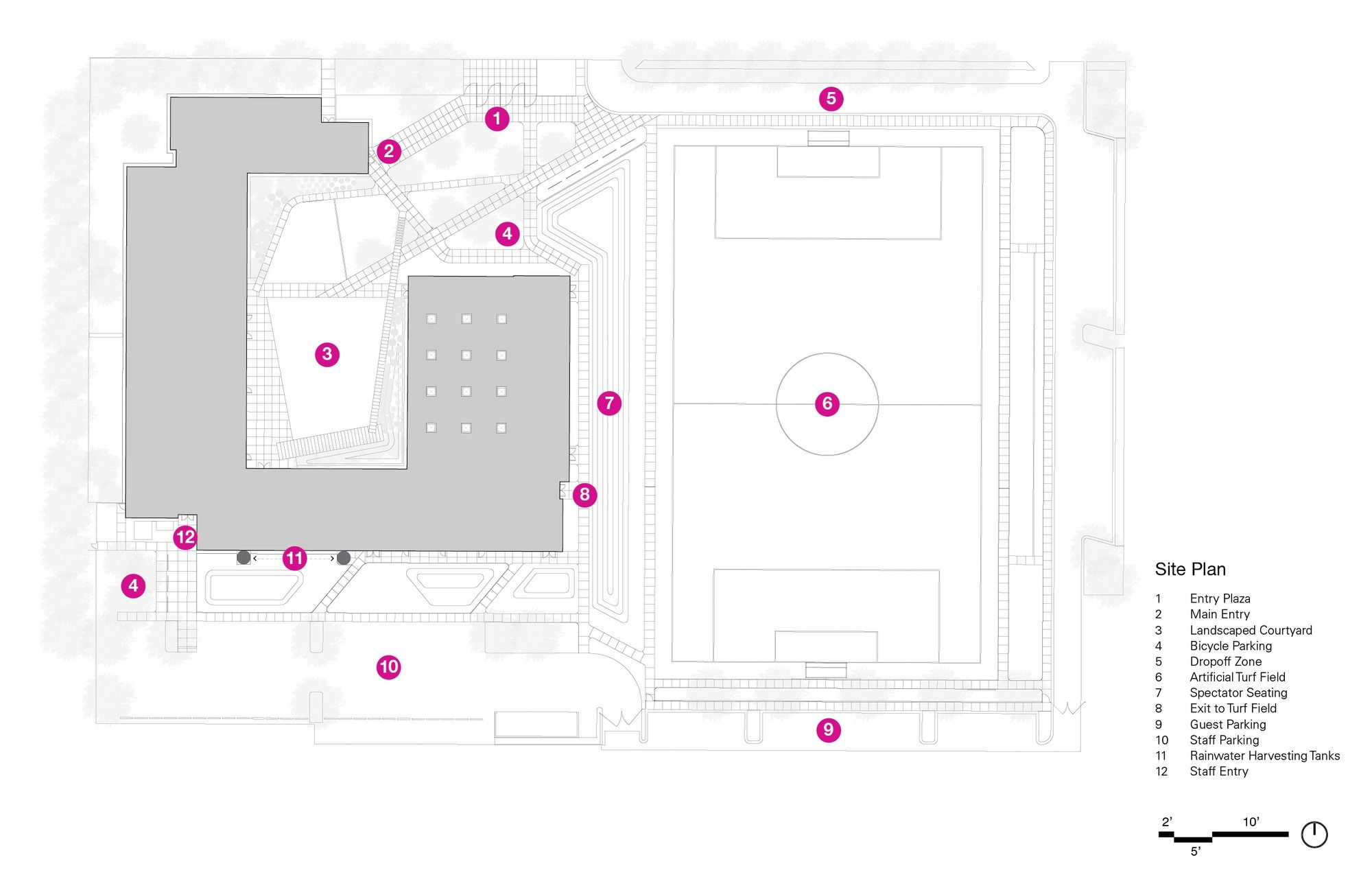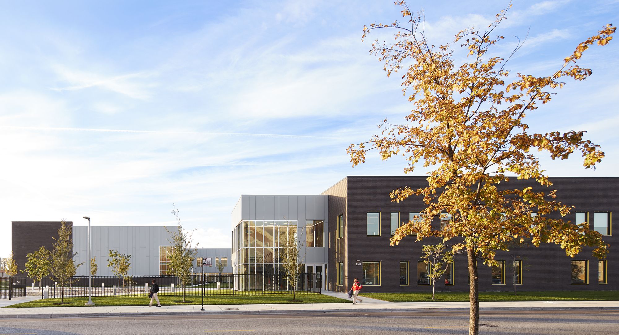 On the east side of the campus, a full-size soccer field is bordered by a walking track. Full-height masonry wraps the building partially on the north, and completely on the west, south, and east, entering the courtyard only at the gymnasium volume where it engages the light gray metal panels with a band of clearstory windows. The school’s leopard mascot spans across the gymnasium’s outer masonry façade. Splashes of color peek through the brick envelope to highlight the punched window openings, playfully organized on each façade. Environmentally progressive materials and design features are apparent throughout the LEED Certified building and landscaping. High-performance skylights and windows diffuse daylight into classrooms and provide views to the courtyard and across the building. All spaces (excluding the gymnasium) are mechanically heated and cooled using a variable refrigerant flow (VRF) system which is extremely energy efficient, leading to energy savings and reduced operations costs. This is one of the first schools in Chicago to employ this mechanical systemز A rainwater harvesting system from the southern roof provides passive irrigation for the campus, with additional stormwater detention under the soccer field and south parking lot. Rather than diverting existing concrete pavement on-site to landfill, it was reused on-site as backfill under-slab sub-grade and landscape berms. The asphalt pavement was manufactured with the highest percentage of recycled content allowed by the Illinois Department of Transportation.