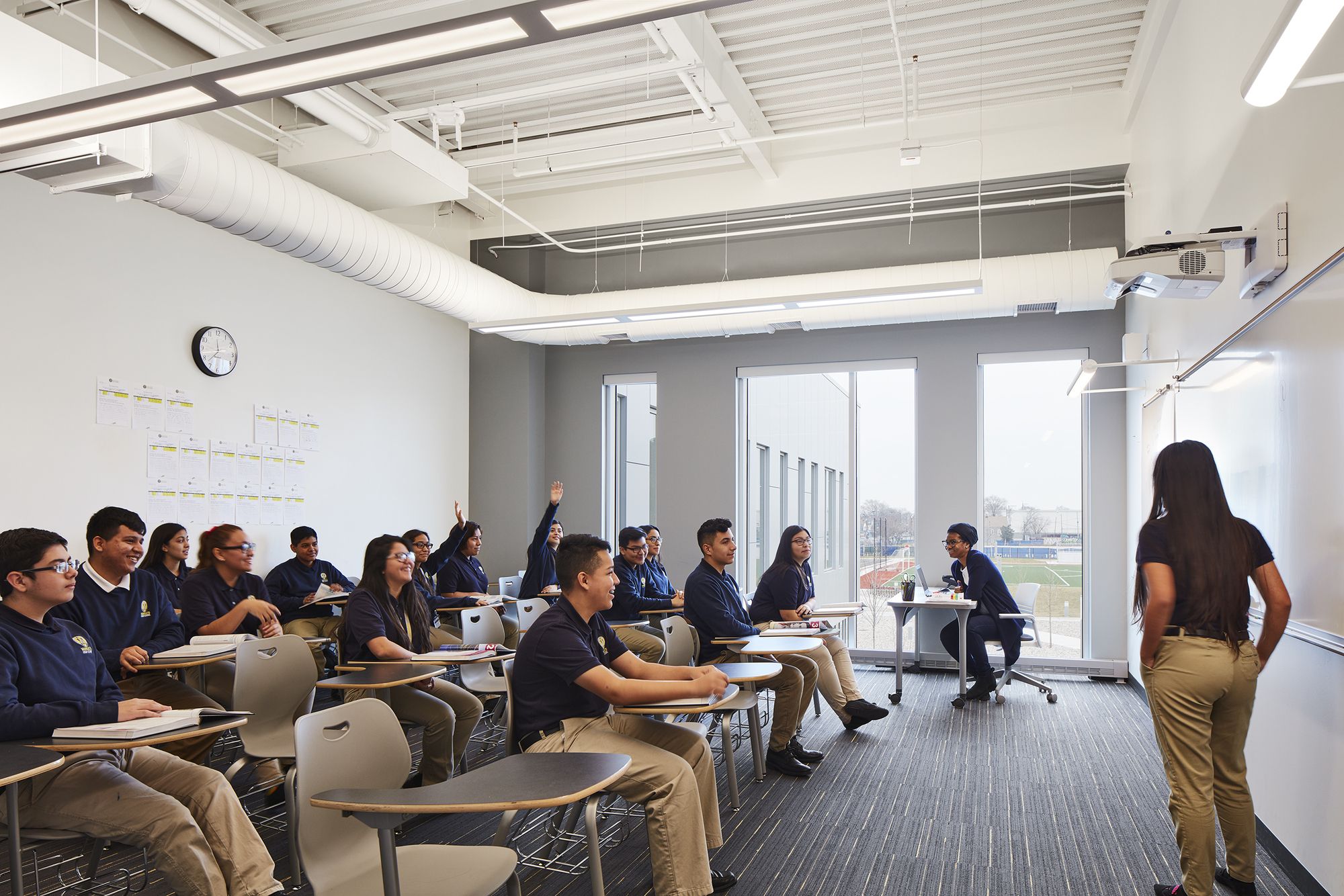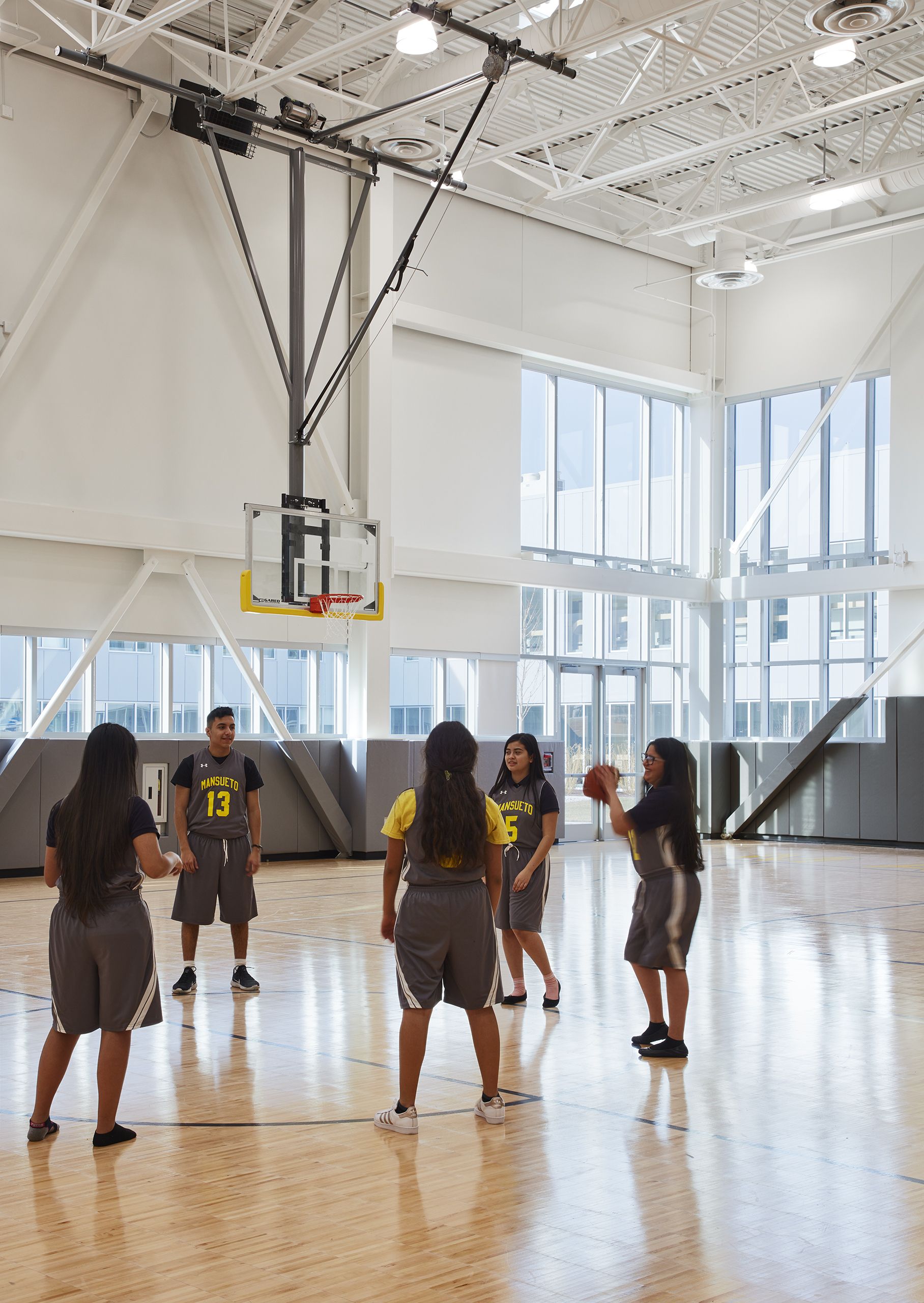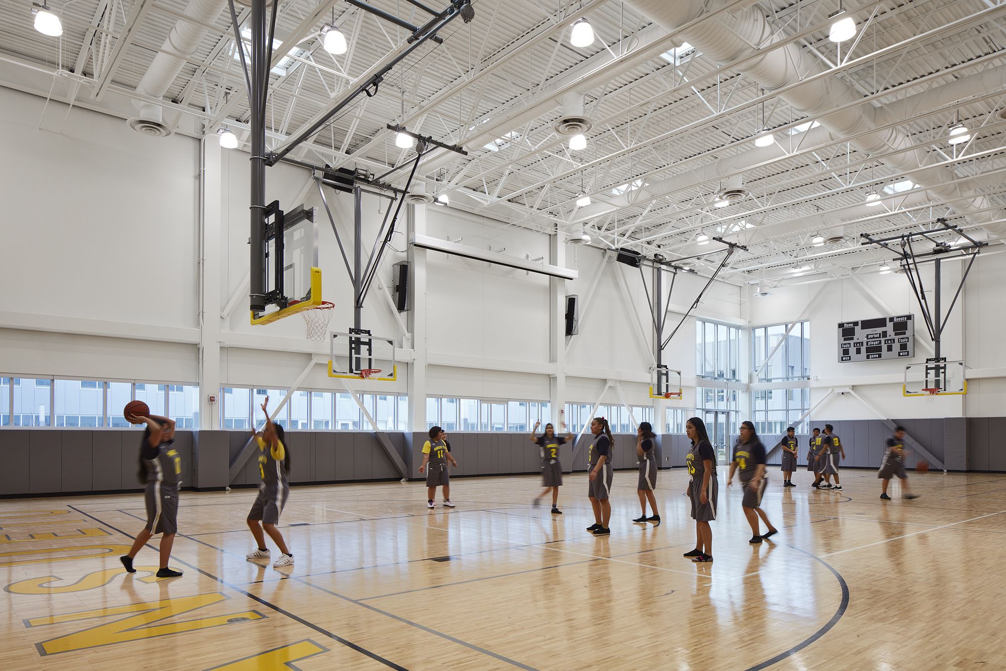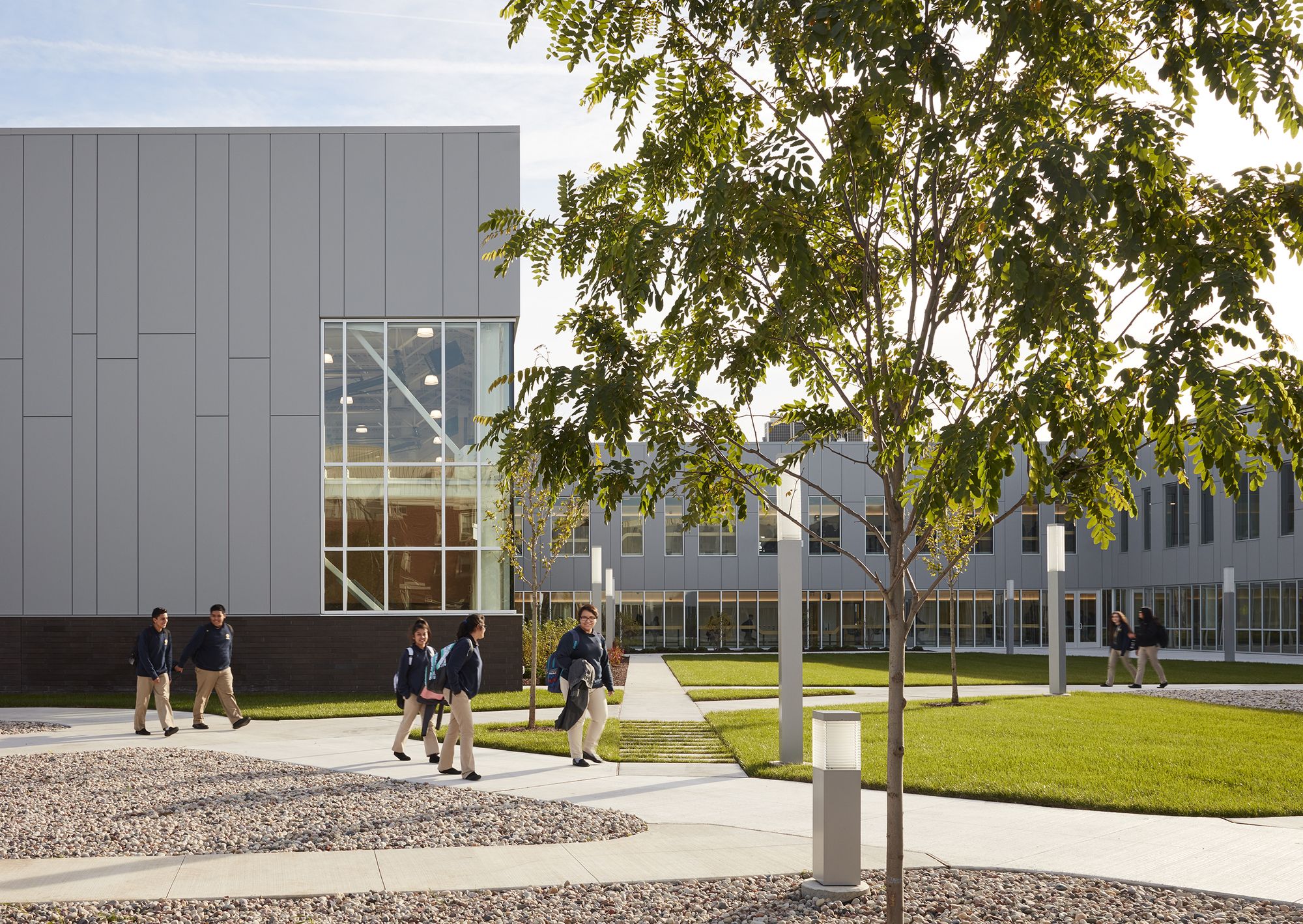With the Mansueto High School, Noble Network of Charter Schools has transformed 5.5 acres of industrial brownfield in Chicago’s largest “park desert” into a place of great opportunity for its students (comprising 98% minority and over 91% low-income.) The school’s mission starts with creating a culture for students where the only option is a success, both short and long-term. The design of the school supports this goal, organized around a central green space that emulates a college quadrangle and allows high-schoolers to envision a college future. The 67,000-sq-ft two-story structure, with a dark brick exterior and a light, gray metal panel interior, wraps almost completely around a landscaped courtyard. The use of masonry anchors the building’s identity, replicating the historical context of the site, providing a sense of protection, and shielding interior functions from the traffic noise created along the busy industrial thoroughfare. As students enter campus through a cluster of trees they leave behind the noise and hustle of 47th Street, for a calm and quiet environment. Classrooms are airy, with high ceilings, exposed mechanicals, and plentiful natural light; skylights in the gymnasium amplify this effect. Multiple state-of-the-art science labs have floor-to-ceiling glass windows looking out onto the courtyard—which also serves as another teaching environment. Classrooms along with the outer perimeter benefit from the brick structure that absorbs and diffuses sound, creating effective learning spaces. Mansueto’s athletic facilities include a large gym with a regulation-sized basketball and volleyball court. Movable dividers provide an option to use half of the space for lunch or assemblies, even as gym classes continue in the other half.