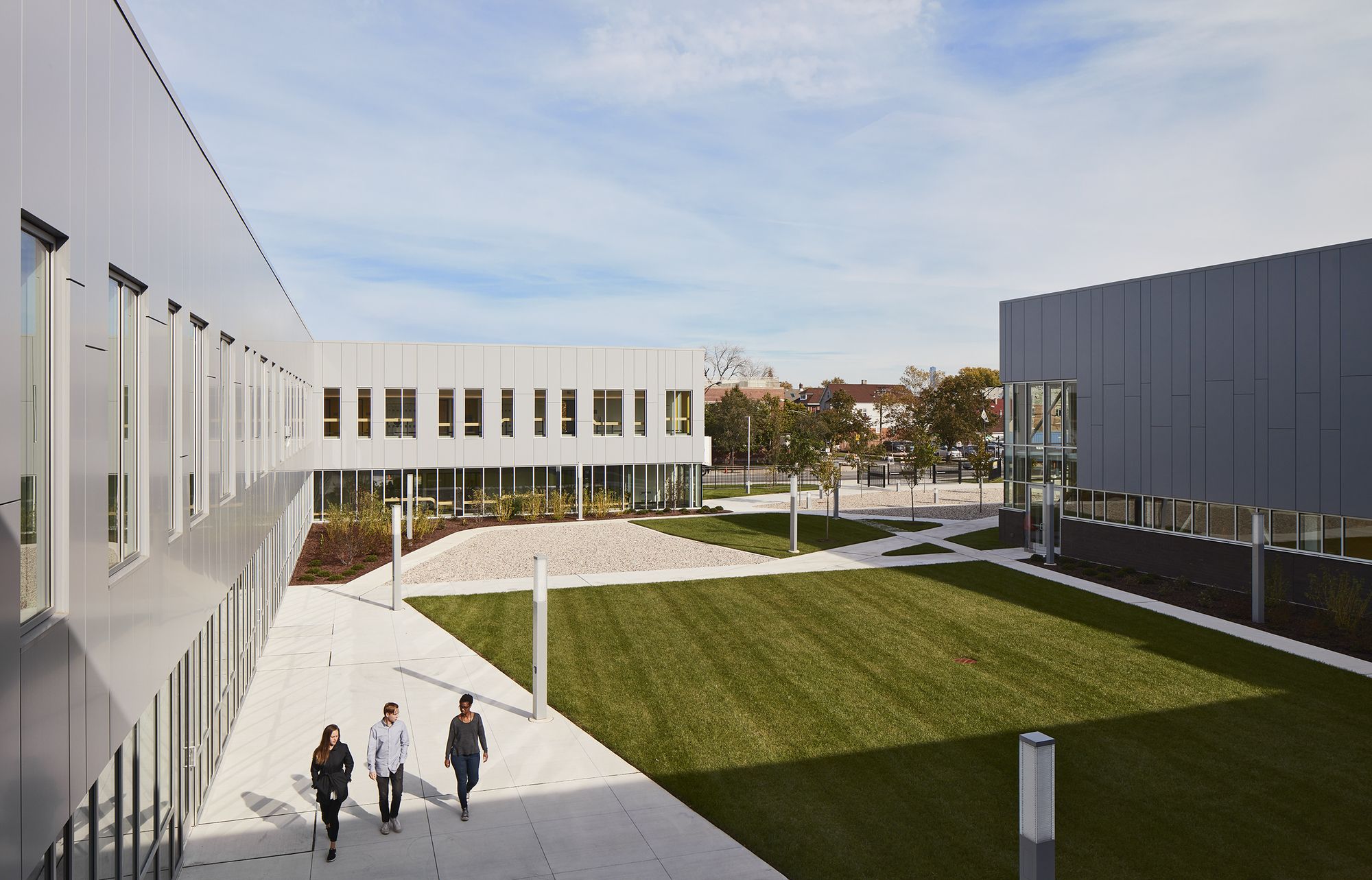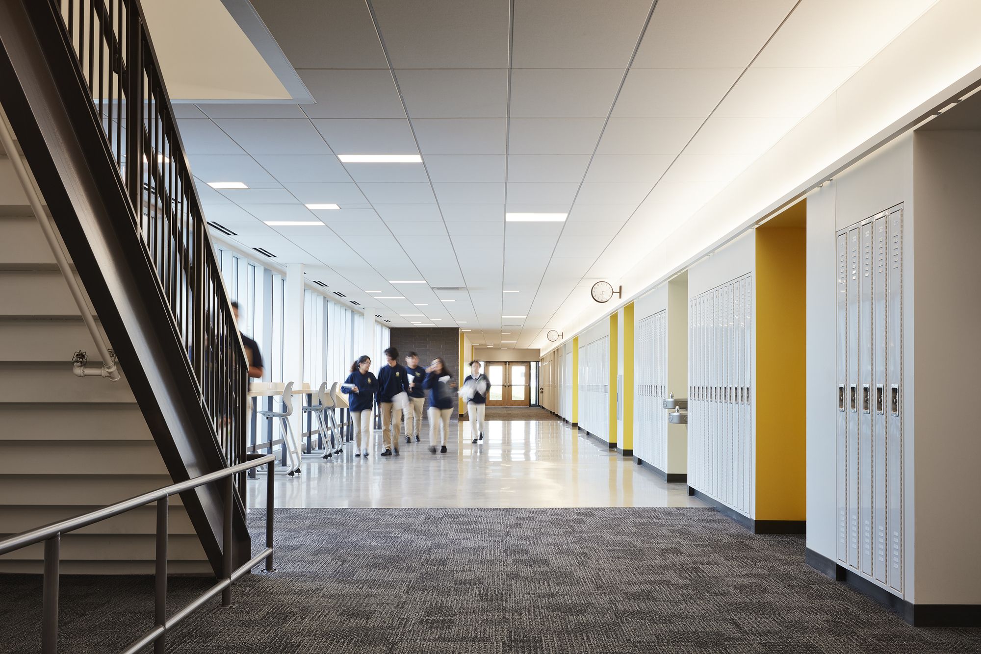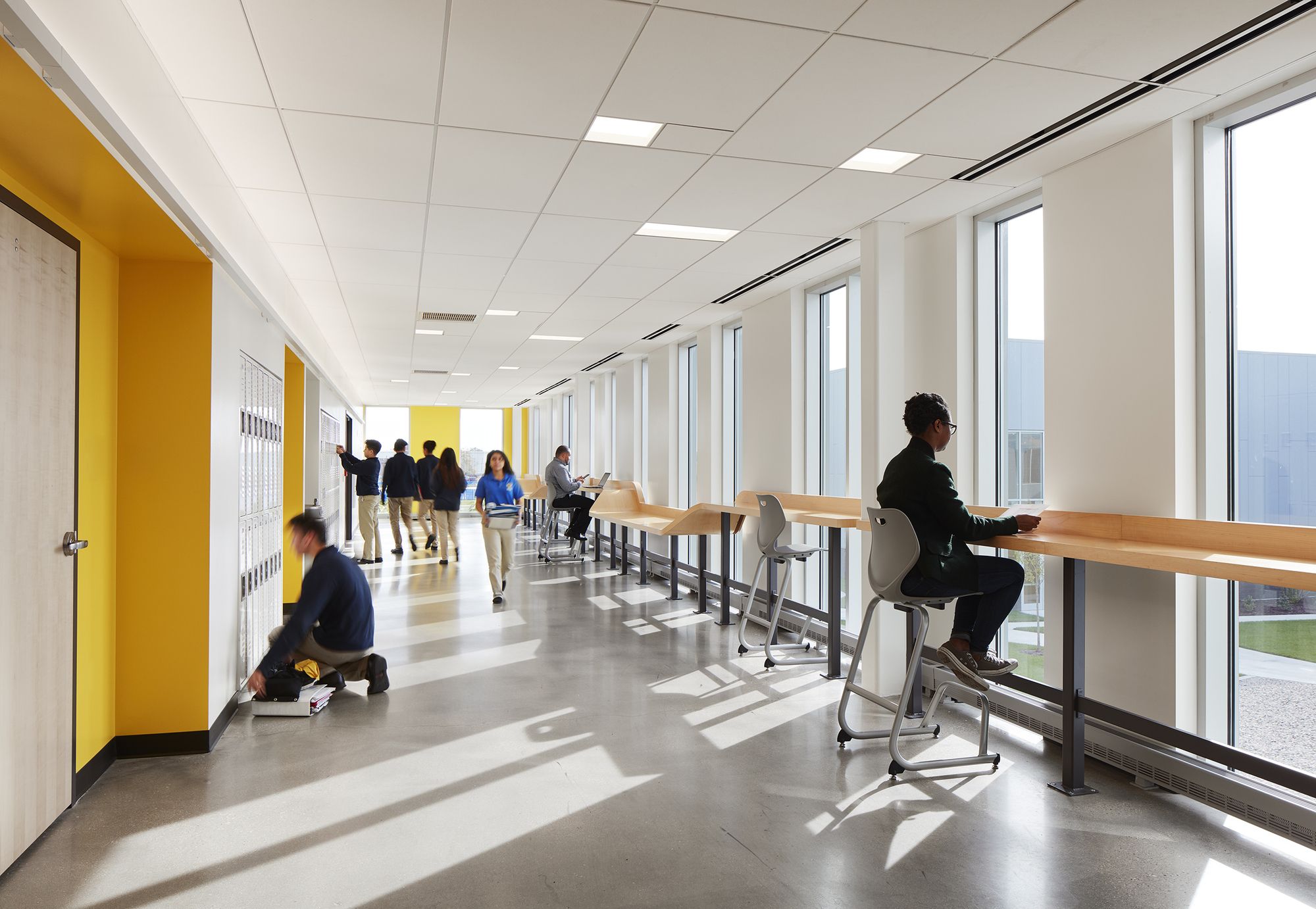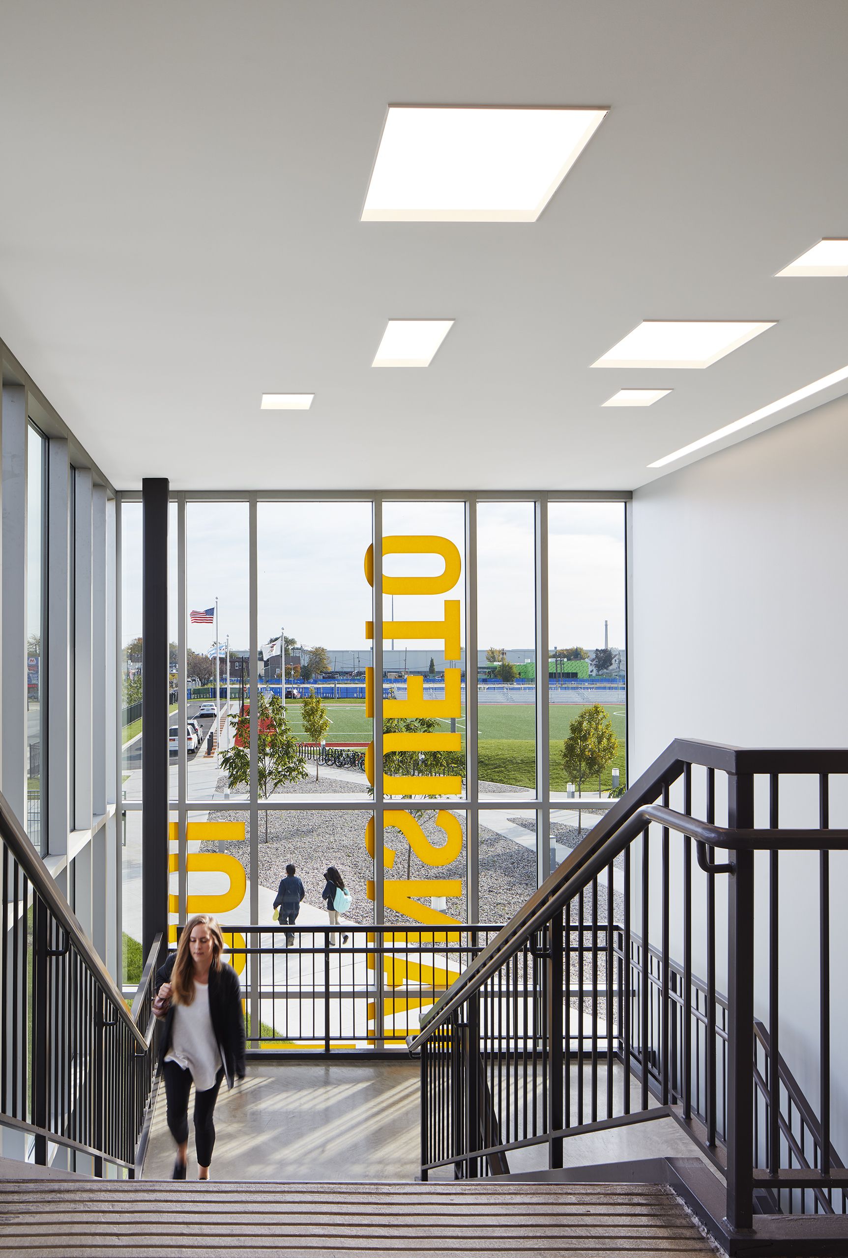 With the Mansueto High School, Noble Network of Charter Schools has transformed 5.5 acres of industrial brownfield in Chicago’s largest “park desert” into a place of great opportunity for its students (comprising 98% minority and over 91% low-income.) The school’s mission starts with creating a culture for students where the only option is a success, both short and long-term. The design of the school supports this goal, organized around a central green space that emulates a college quadrangle and allows high-schoolers to envision a college future. The 67,000-sq-ft two-story structure, with a dark brick exterior and a light, gray metal panel interior, wraps almost completely around a landscaped courtyard. The use of masonry anchors the building’s identity, replicating the historical context of the site, providing a sense of protection, and shielding interior functions from the traffic noise created along the busy industrial thoroughfare. As students enter campus through a cluster of trees they leave behind the noise and hustle of 47th Street, for a calm and quiet environment. Classrooms are airy, with high ceilings, exposed mechanicals, and plentiful natural light; skylights in the gymnasium amplify this effect. Multiple state-of-the-art science labs have floor-to-ceiling glass windows looking out onto the courtyard—which also serves as another teaching environment. Classrooms along with the outer perimeter benefit from the brick structure that absorbs and diffuses sound, creating effective learning spaces. Mansueto’s athletic facilities include a large gym with a regulation-sized basketball and volleyball court. Movable dividers provide an option to use half of the space for lunch or assemblies, even as gym classes continue in the other half.