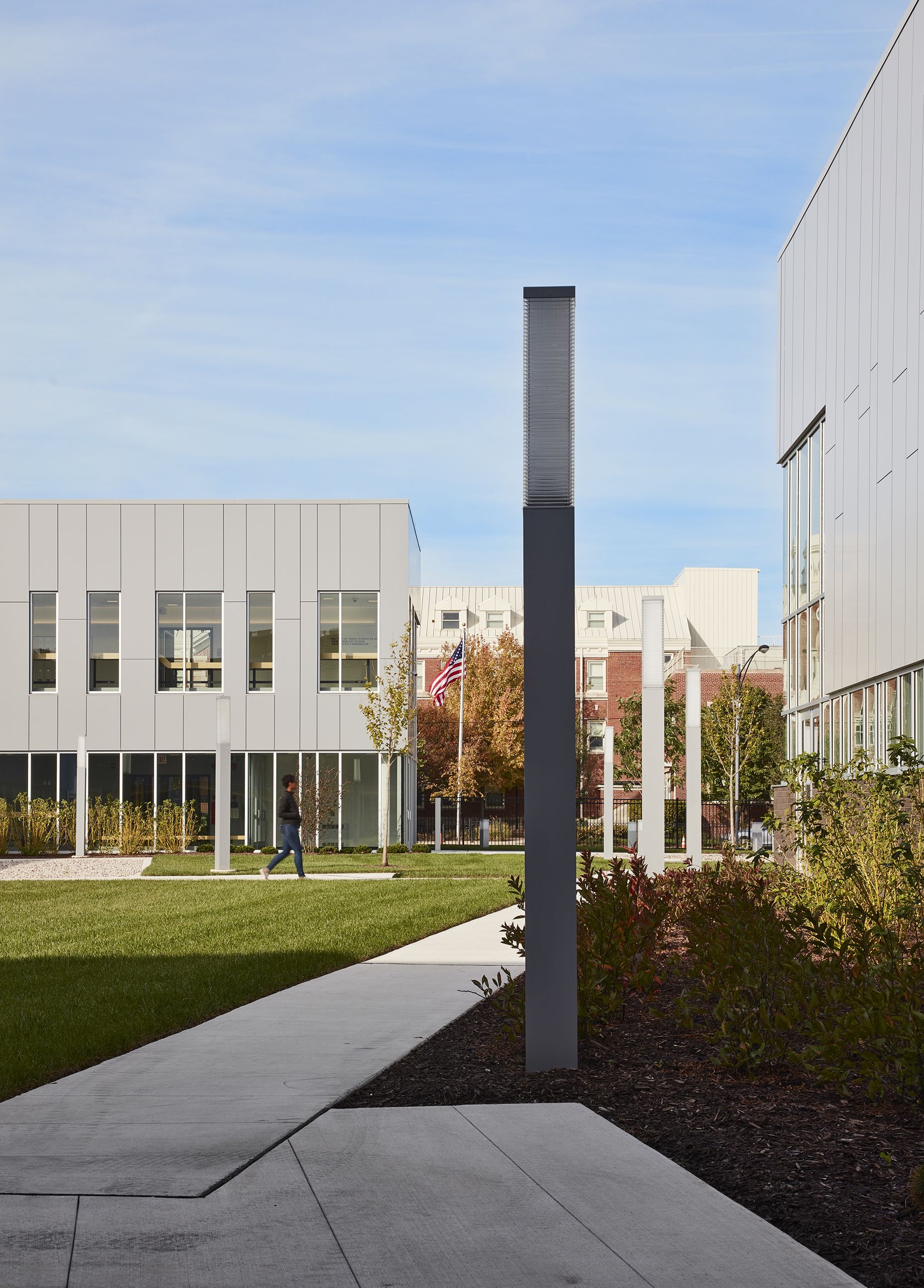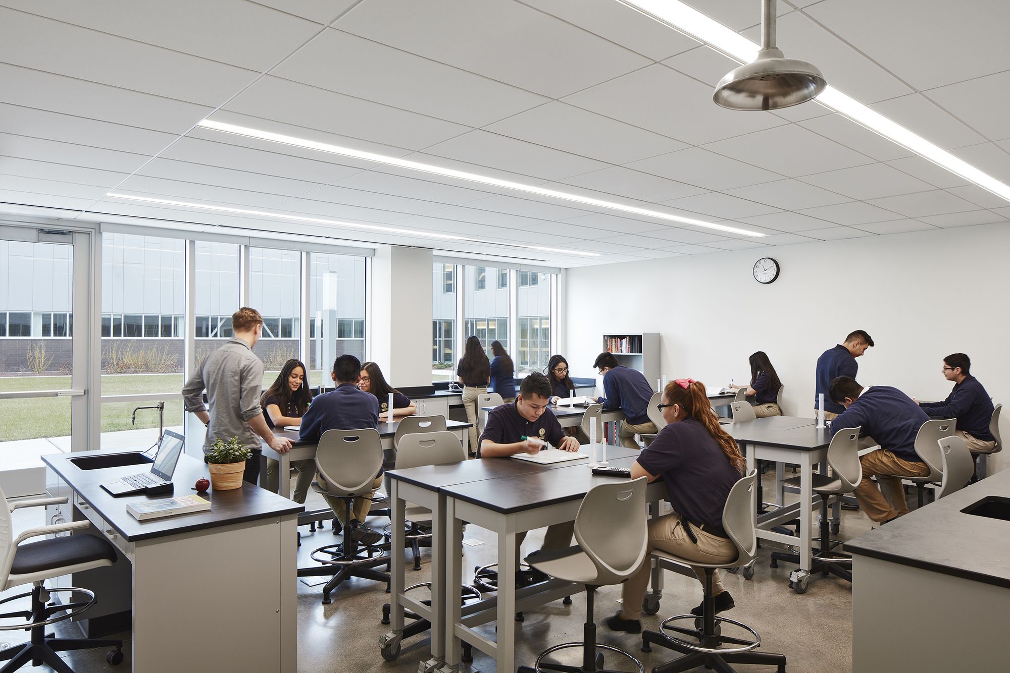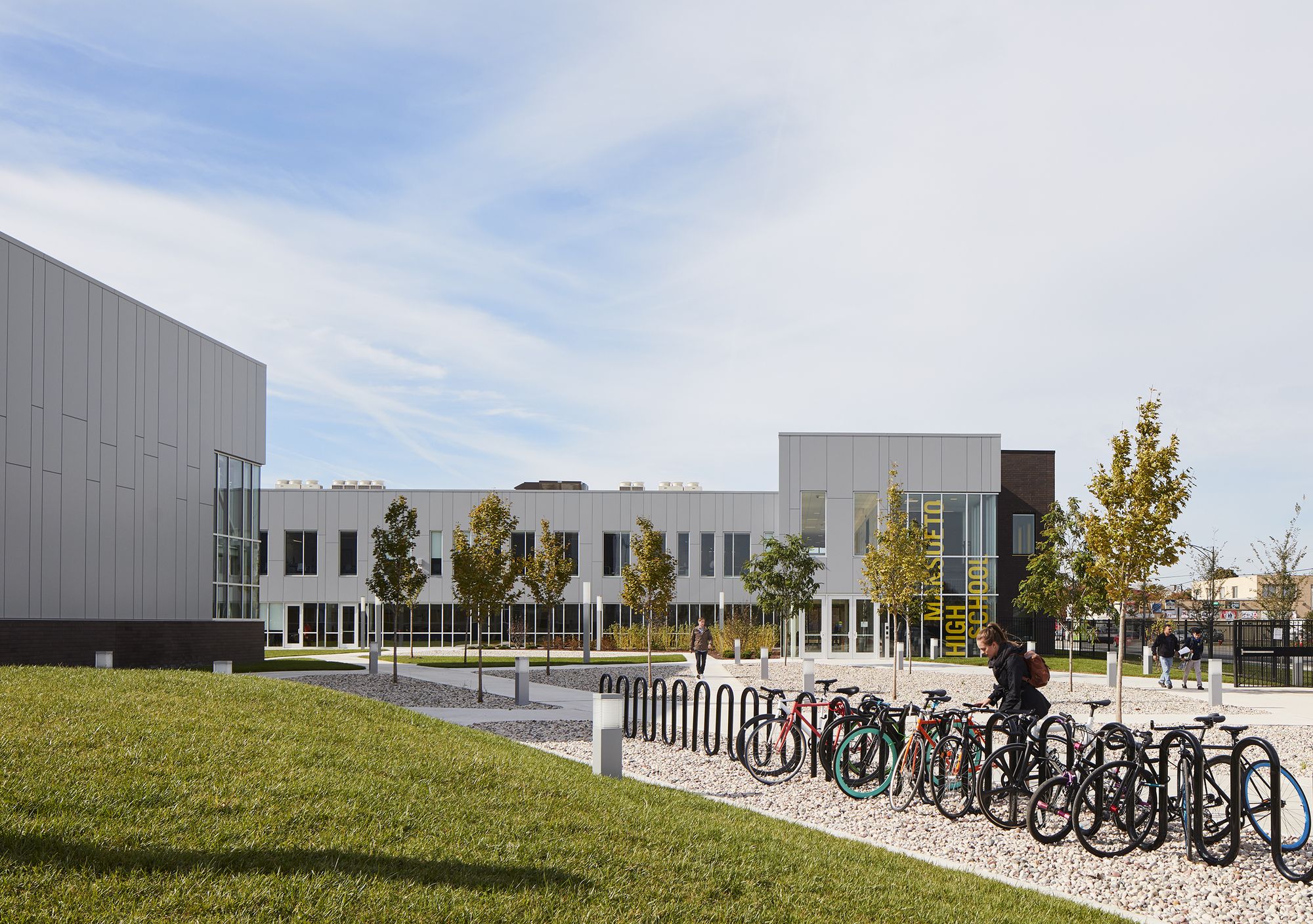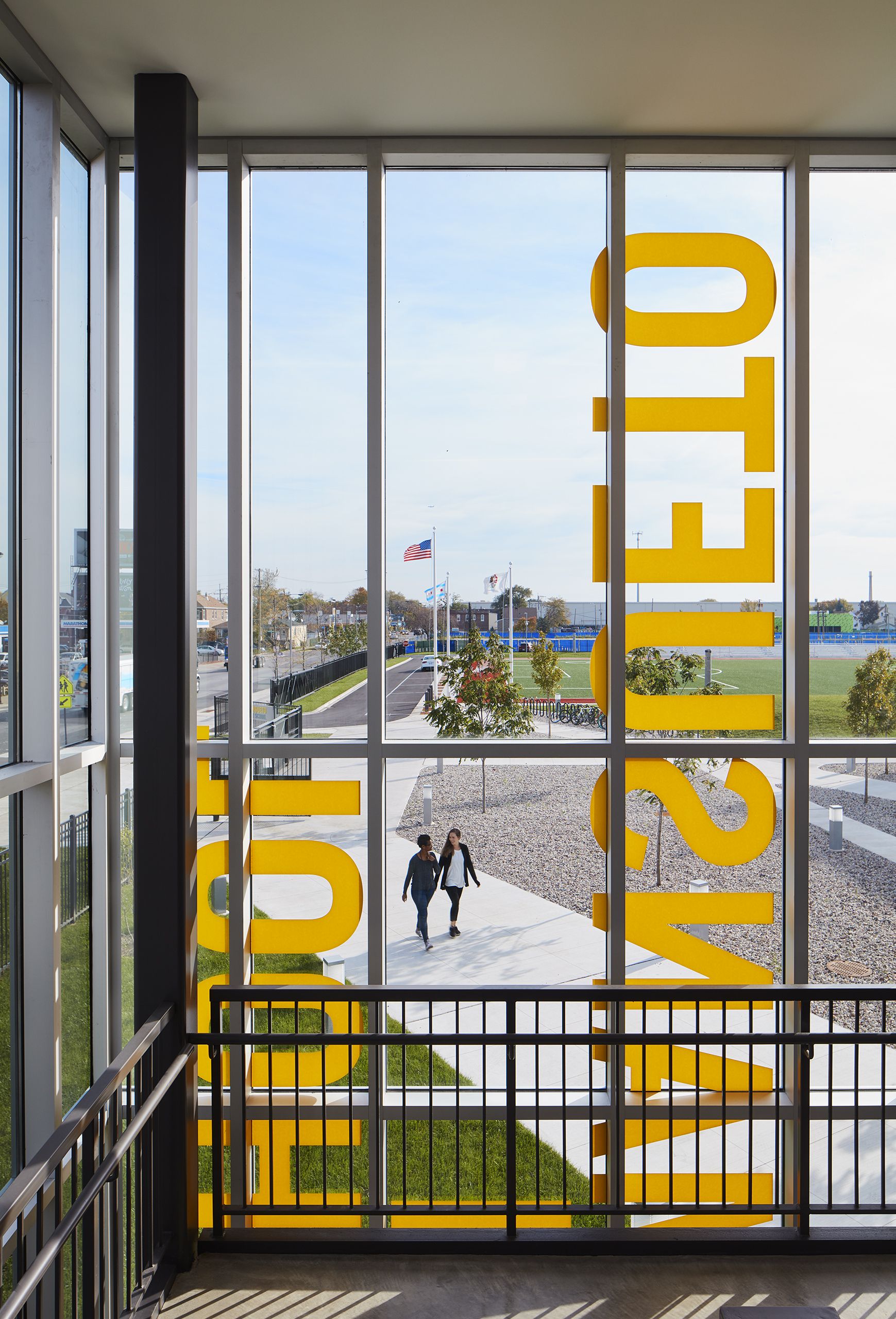 With the Mansueto High School, Noble Network of Charter Schools has transformed 5.5 acres of industrial brownfield in Chicago’s largest “park desert” into a place of great opportunity for its students (comprising 98% minority and over 91% low-income.) The school’s mission starts with creating a culture for students where the only option is a success, both short and long-term. The design of the school supports this goal, organized around a central green space that emulates a college quadrangle and allows high-schoolers to envision a college future. The 67,000-sq-ft two-story structure, with a dark brick exterior and a light, gray metal panel interior, wraps almost completely around a landscaped courtyard. The use of masonry anchors the building’s identity, replicating the historical context of the site, providing a sense of protection, and shielding interior functions from the traffic noise created along the busy industrial thoroughfare. As students enter campus through a cluster of trees they leave behind the noise and hustle of 47th Street, for a calm and quiet environment. Classrooms are airy, with high ceilings, exposed mechanicals, and plentiful natural light; skylights in the gymnasium amplify this effect. Multiple state-of-the-art science labs have floor-to-ceiling glass windows looking out onto the courtyard—which also serves as another teaching environment. Classrooms along with the outer perimeter benefit from the brick structure that absorbs and diffuses sound, creating effective learning spaces. Mansueto’s athletic facilities include a large gym with a regulation-sized basketball and volleyball court. Movable dividers provide an option to use half of the space for lunch or assemblies, even as gym classes continue in the other half.