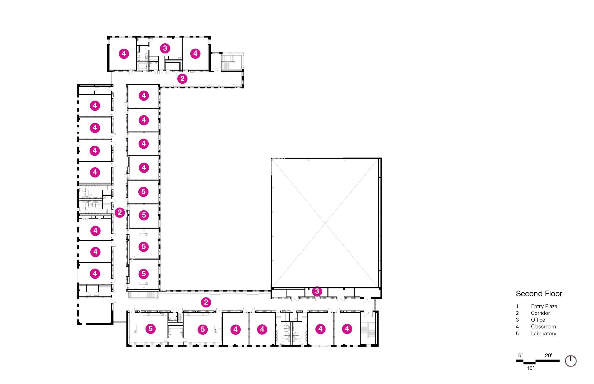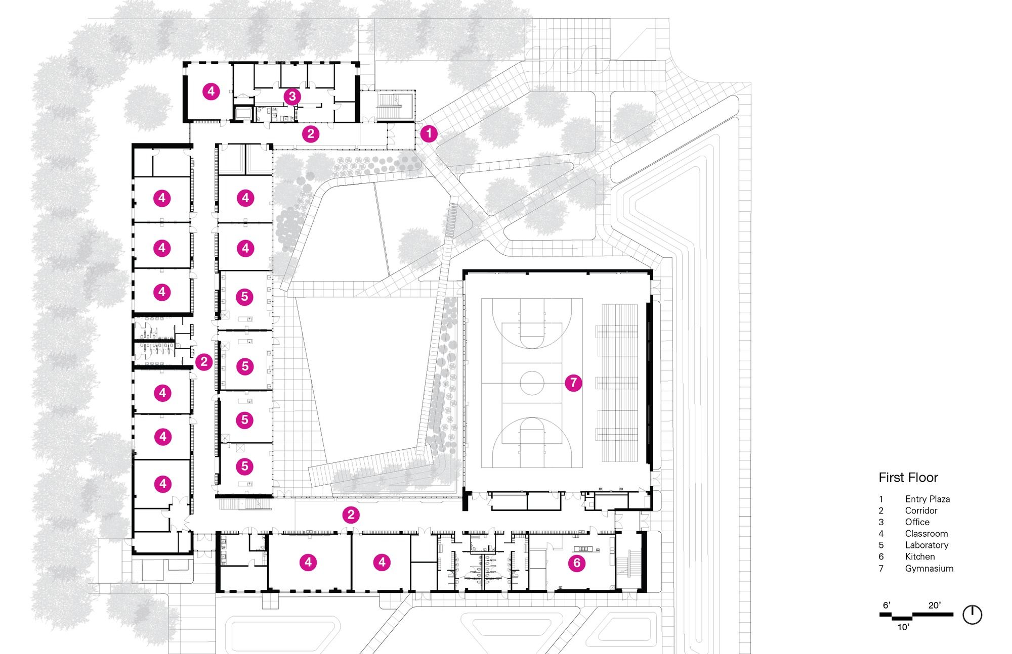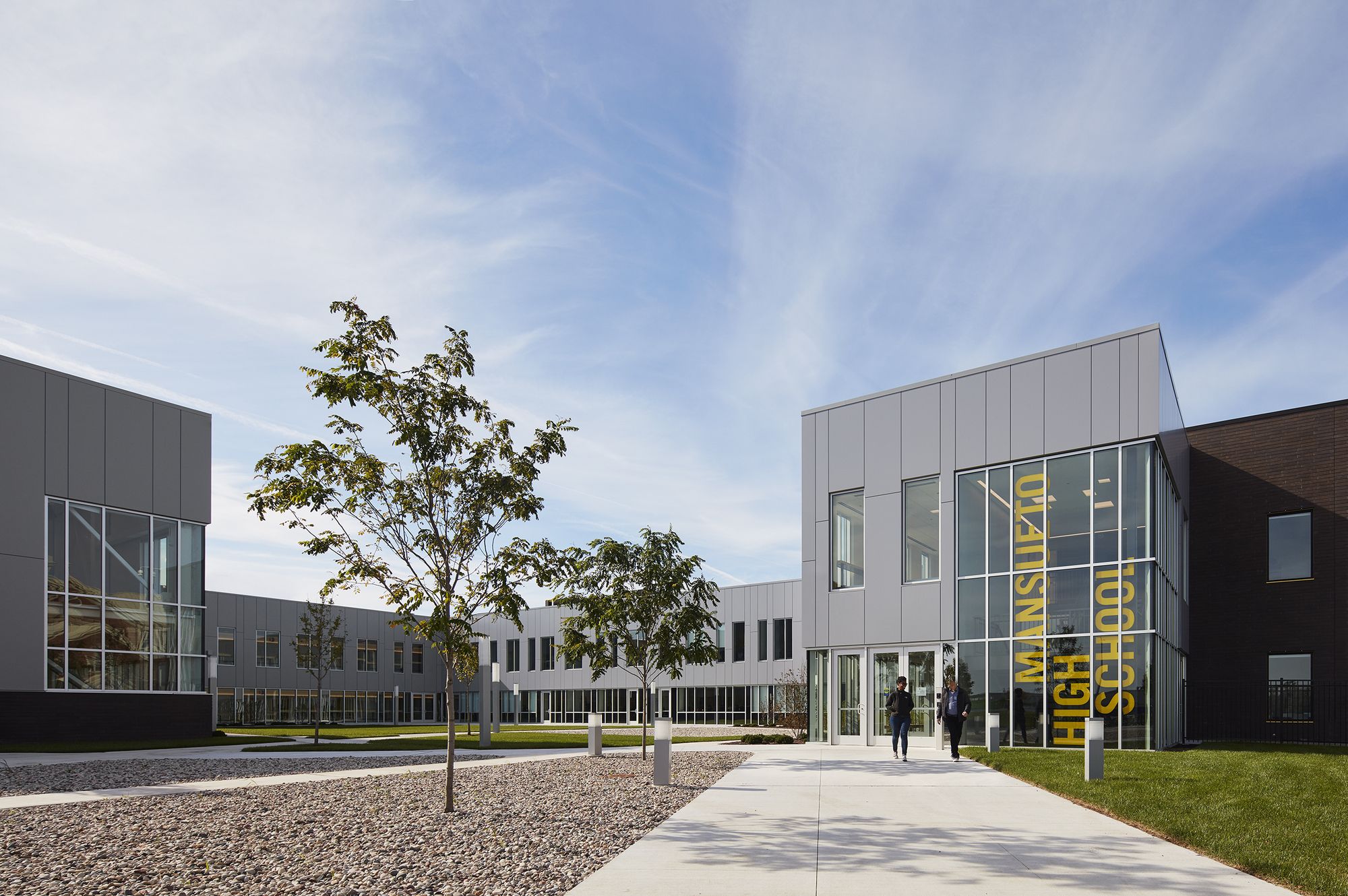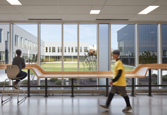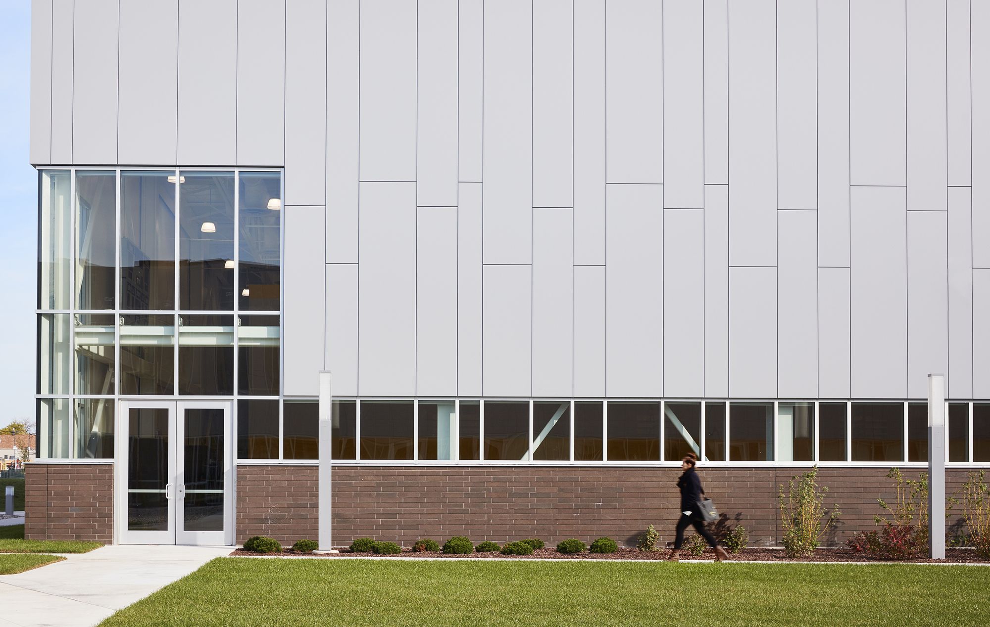 With the Mansueto High School, Noble Network of Charter Schools has transformed 5.5 acres of industrial brownfield in Chicago’s largest “park desert” into a place of great opportunity for its students (comprising 98% minority and over 91% low-income.) The school’s mission starts with creating a culture for students where the only option is a success, both short and long-term. The design of the school supports this goal, organized around a central green space that emulates a college quadrangle and allows high-schoolers to envision a college future. The 67,000-sq-ft two-story structure, with a dark brick exterior and a light, gray metal panel interior, wraps almost completely around a landscaped courtyard. The use of masonry anchors the building’s identity, replicating the historical context of the site, providing a sense of protection, and shielding interior functions from the traffic noise created along the busy industrial thoroughfare. As students enter campus through a cluster of trees they leave behind the noise and hustle of 47th Street, for a calm and quiet environment. Classrooms are airy, with high ceilings, exposed mechanicals, and plentiful natural light; skylights in the gymnasium amplify this effect. Multiple state-of-the-art science labs have floor-to-ceiling glass windows looking out onto the courtyard—which also serves as another teaching environment. Classrooms along with the outer perimeter benefit from the brick structure that absorbs and diffuses sound, creating effective learning spaces. Mansueto’s athletic facilities include a large gym with a regulation-sized basketball and volleyball court. Movable dividers provide an option to use half of the space for lunch or assemblies, even as gym classes continue in the other half.