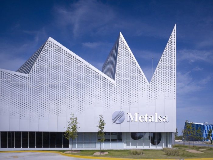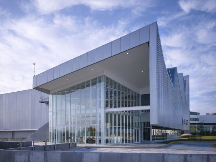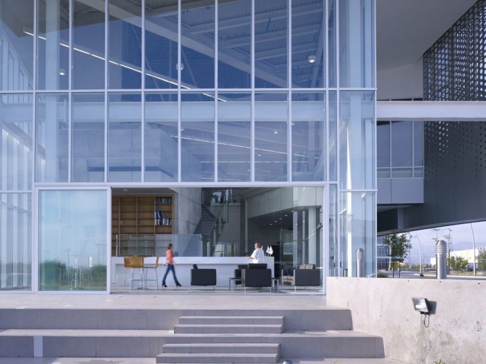 The second feature is the building’s perforated and etched metal skin which wraps the entire facade. The skin was manufactured by the client company in a nearby facility. Solid and void, light and shadow are interplayed to create openness where possible as well as closing off around the research labs to protect trade secrets. This response is atypical for warehouse type facilities which are usually black box environments with overtones of solidity and security. Instead the building’s mainly glazed lower story above which the office spaces cantilever out, and perforated skin act to humanize the building and give it a vulnerable yet strong, approachable visage.