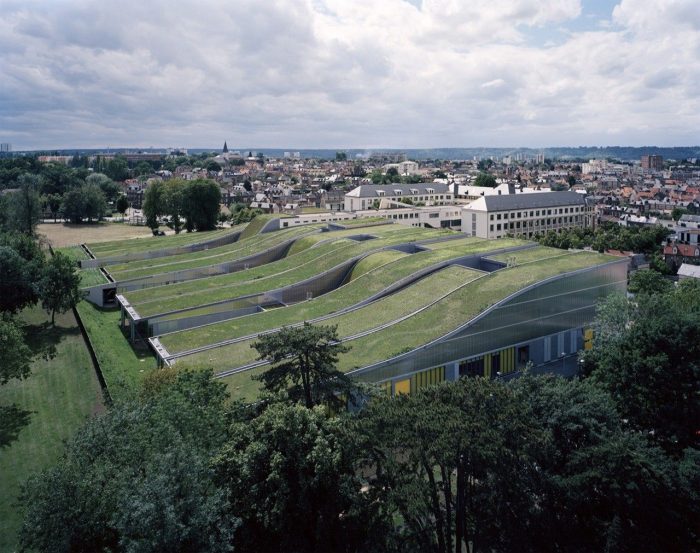Rather than typical warehouse construction, the architects archi5 along with B. Huidobro, created a series of flowing green roofs which hold vast spaces below them and at times swoop to ground, creating internal courtyards which act as skylights to the surrounding spaces. These roofs exist as a seeming extension of the park neighboring the school.