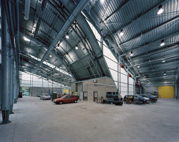 Marcel Sembat High School Extension, The rehabilitation + extension of the Marcel Sembat high school in Sotteville lès Rouen is one of strong visual identity which is created from programmatic necessity. Large workshop spaces with high ceilings and technical work surfaces were required for technical education about motors and vehicle mechanics.