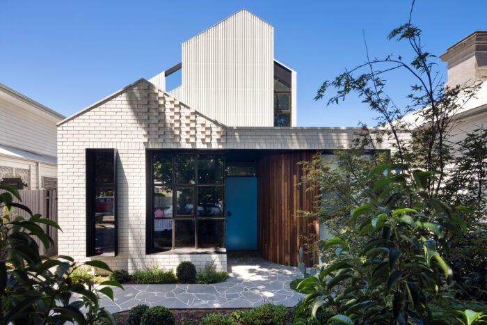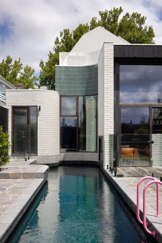 The exterior was designed to fit the streetscape. White brick and painted battens give texture to the façade. The entry is lined with timber for warmth, with a pop of blue for the door. Color and texture were important for interiors as an antidote to beige rooms. The front lounge is dark and moody, which contrasts with the bright and lofty library. Pops of pink are carried through in the spiral staircase, fixtures, and joinery.