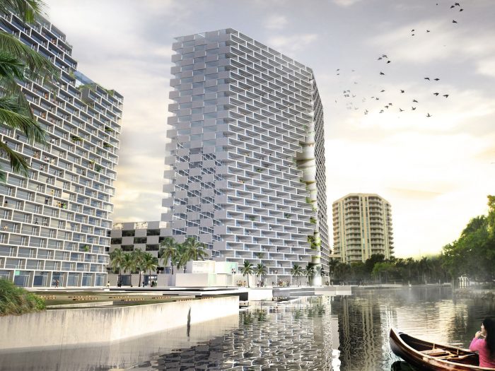 “The project fills the gap in the waterfront of Downtown Fort Lauderdale stitching the existing fragments of promenade together into a new and revitalized river park adding density and life to the scenic setting. The two buildings are torn open to form a cave and a canyon –opening up for the neighborhood to reach the river . A design made through subtraction rather than addition. ” Bjarke Ingels, Founding Partner, BIG.
