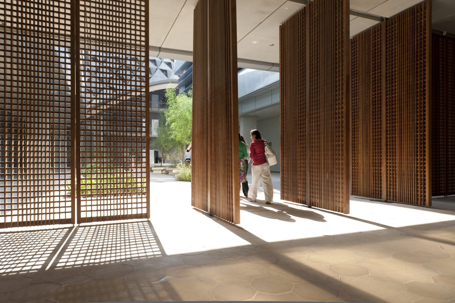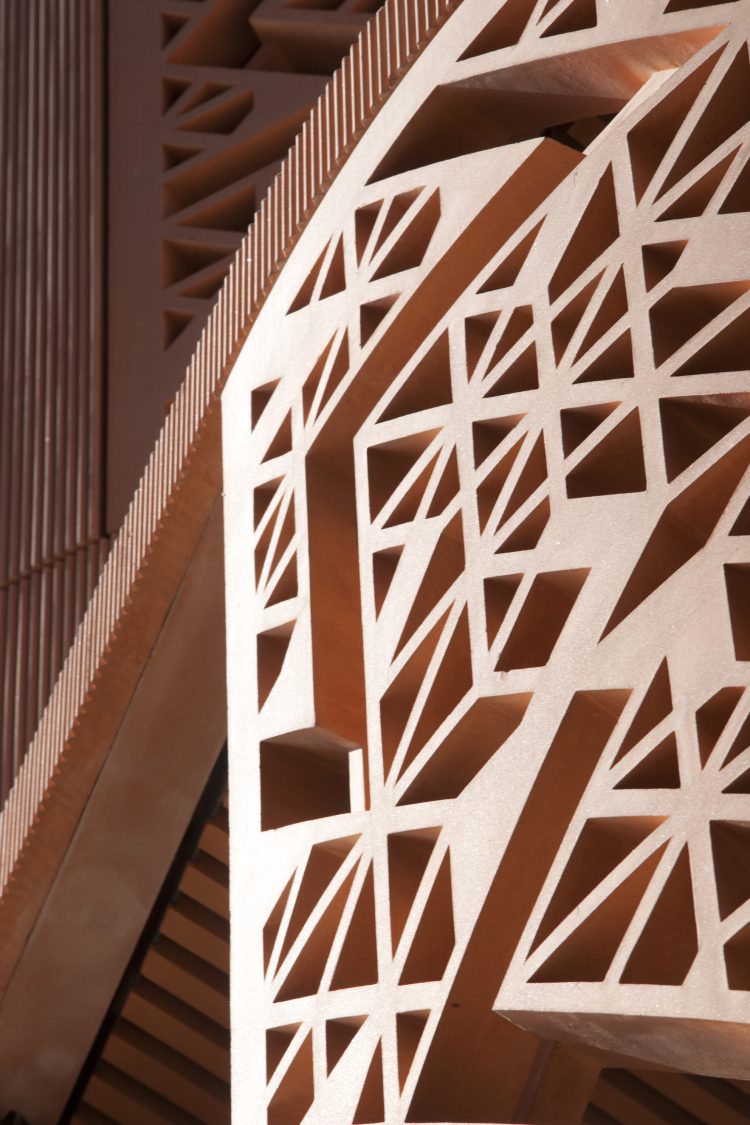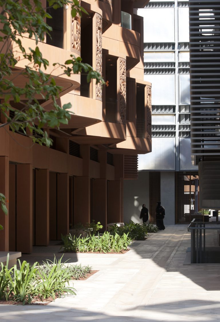 The Institute demonstrates the sustainable principles underpinning the overall masterplan. The buildings have self-shading facades and are orientated to provide maximum shade as well as sheltering adjacent buildings and the pedestrian streets below. Over 5,000 square meters of roof mounted photovoltaic installations provide power and additional shading at street level. Windows in the residential buildings are protected by a contemporary reinterpretation of mashrabiya, a type of latticed projecting oriel window, constructed with sustainably developed, glass-reinforced concrete, colored with local sand to integrate with its desert context and to minimize maintenance. The perforations for light and shade are based on the patterns found in the traditional architecture of Islam.