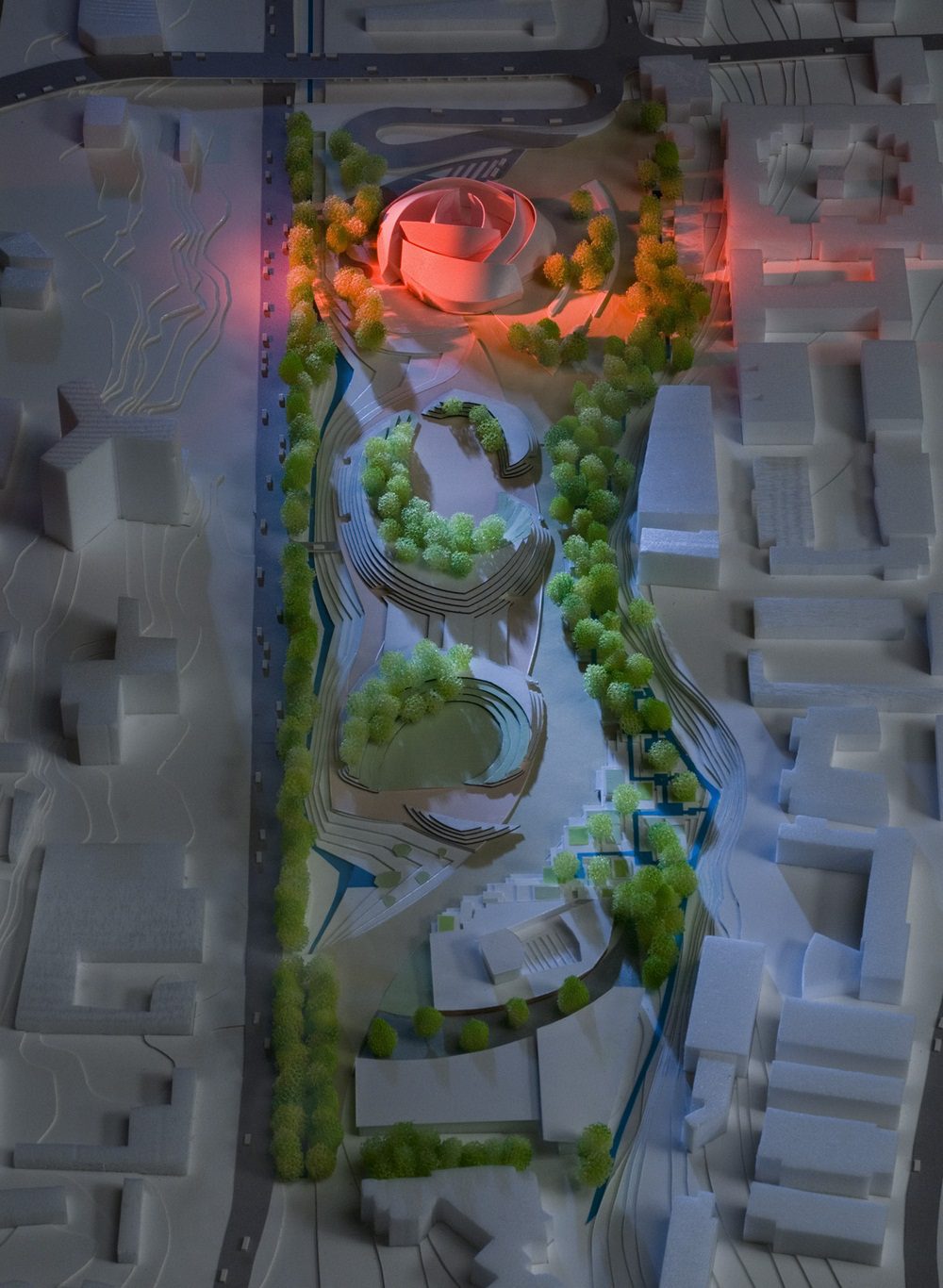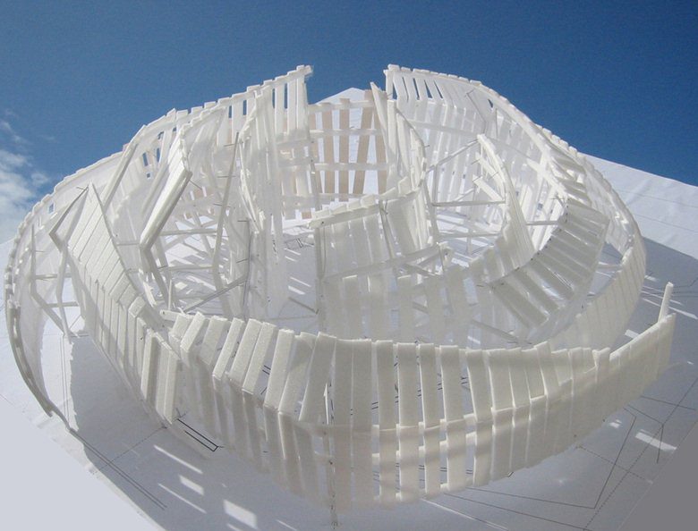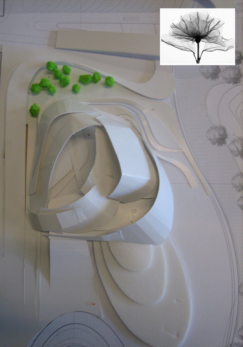 The center aims to be a low energy building using local materials, skills and resources. Energy loads are reduced passively by shaping the building to keep the sun out. The proposal suggests a shell structure allowing a playful and dazzling scenography of light into the interior spaces – like light filtering between rose petals. Exhibition and administrative areas are laid out between the rose petals creating interior labyrinth journeys inspired by walks in the old city of Damascus formed by walls with the sky as the window.