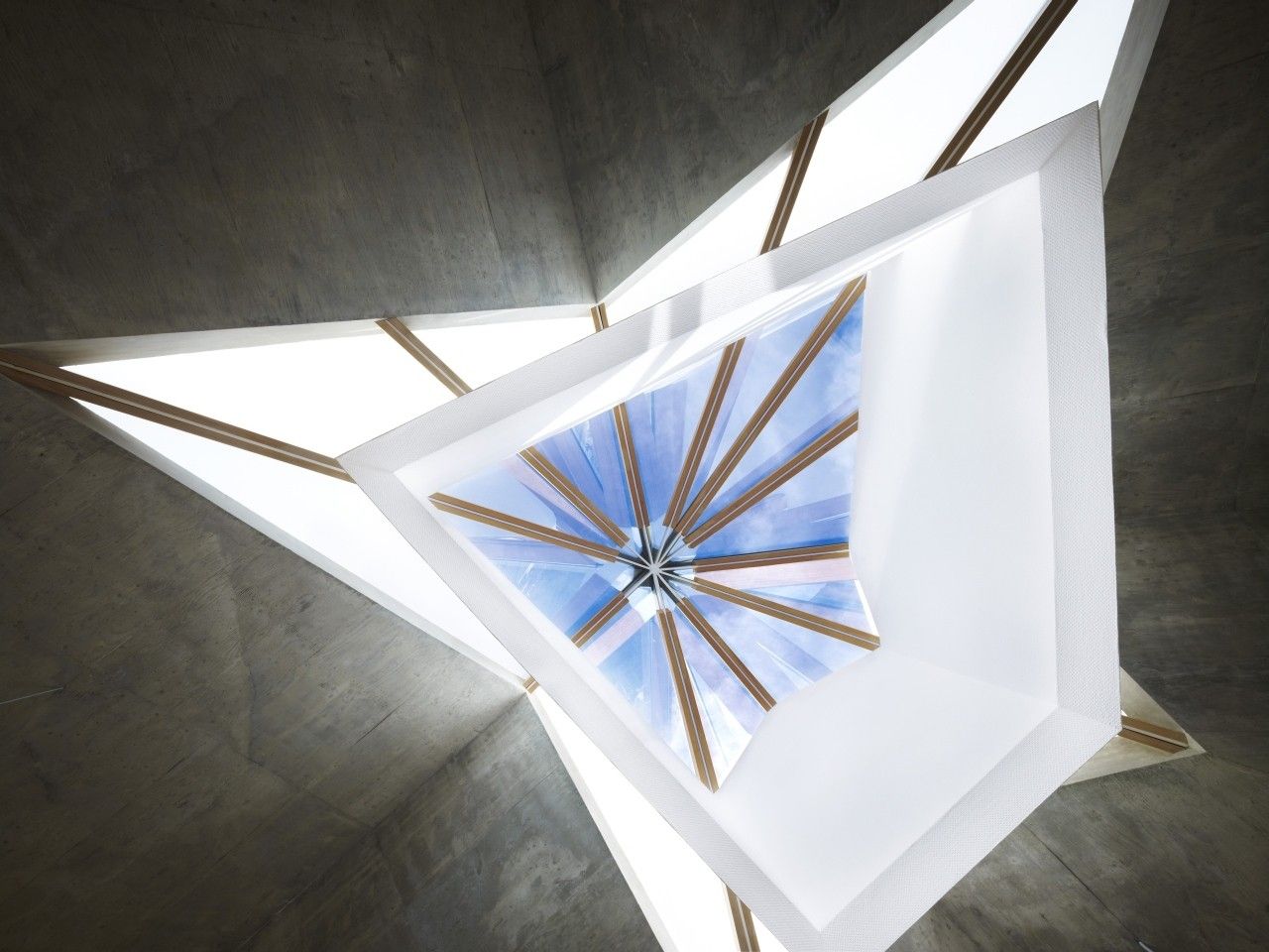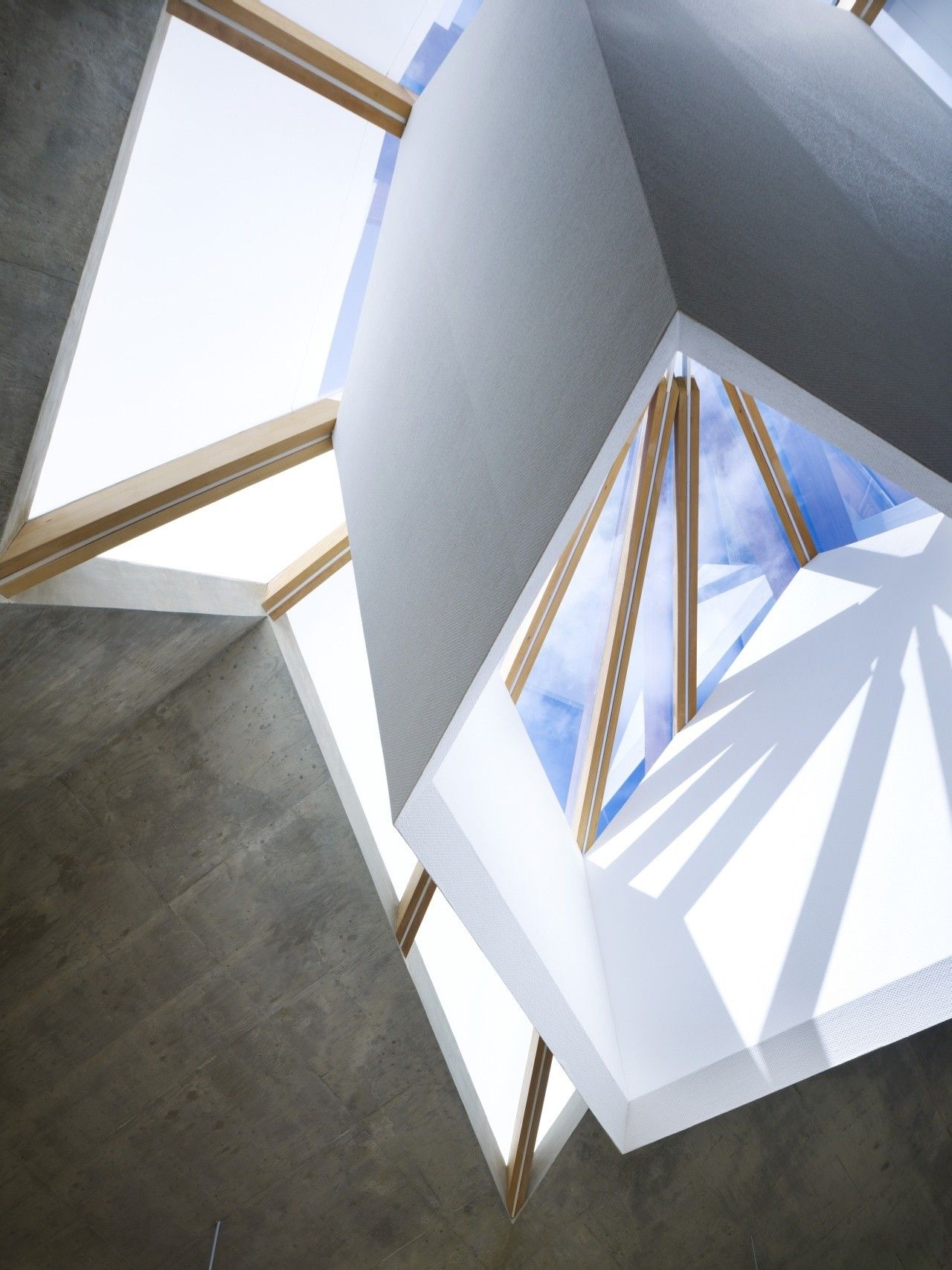 The second is a large helping of natural light. To this end, the build’s corners are opened, allowing natural light and the elements access to the exhibition spaces. This move would normally create a structurally unsound scheme, so in response, the building’s surfaces are linked as if they were all part of one large piece of folded paper. This move was modeled and analyzed rigorously using computer software.