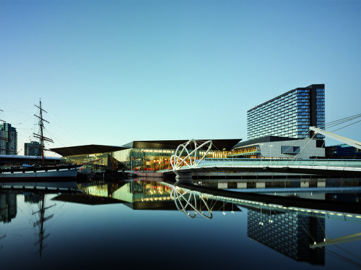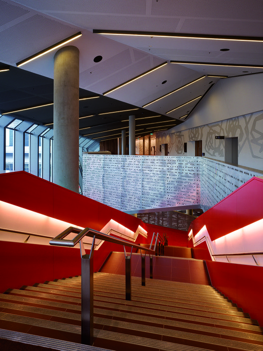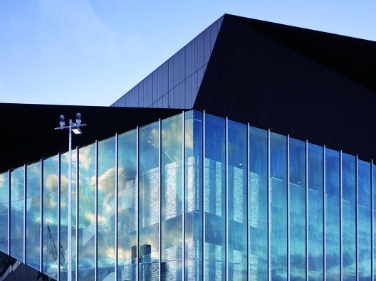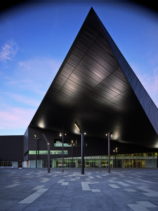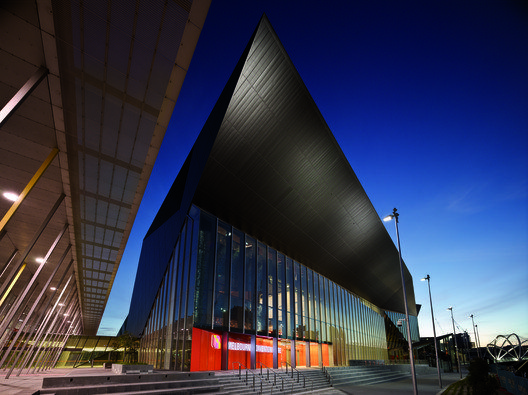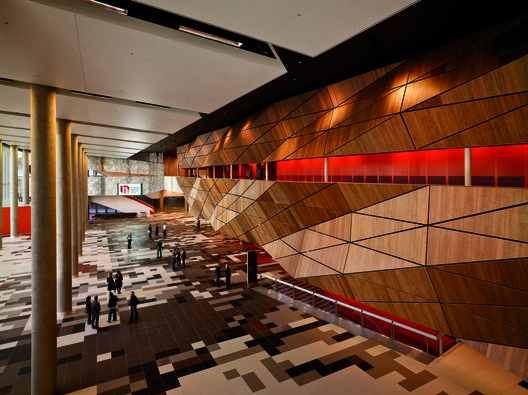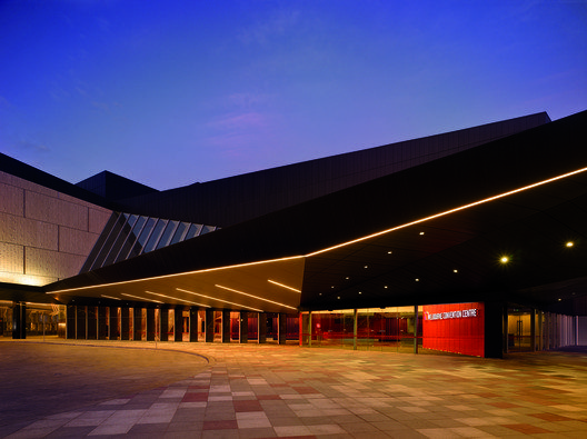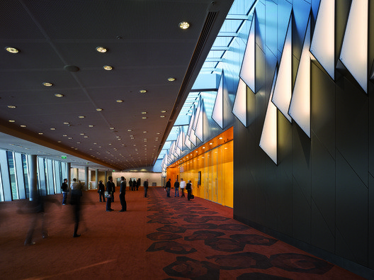 Melbourne Convention and Exhibition Centre, Angularity and facets run as a central theme through the Melbourne Convention and Exhibition Centre, designed by the firms Woods Bagot and NH Architecture. The complex’ form is roughly triangular, following the lines of the site, which sits at a focal point of Melbourne, Australia’s urban axis, running through the Central Business District, the Docklands and the Yarra River.